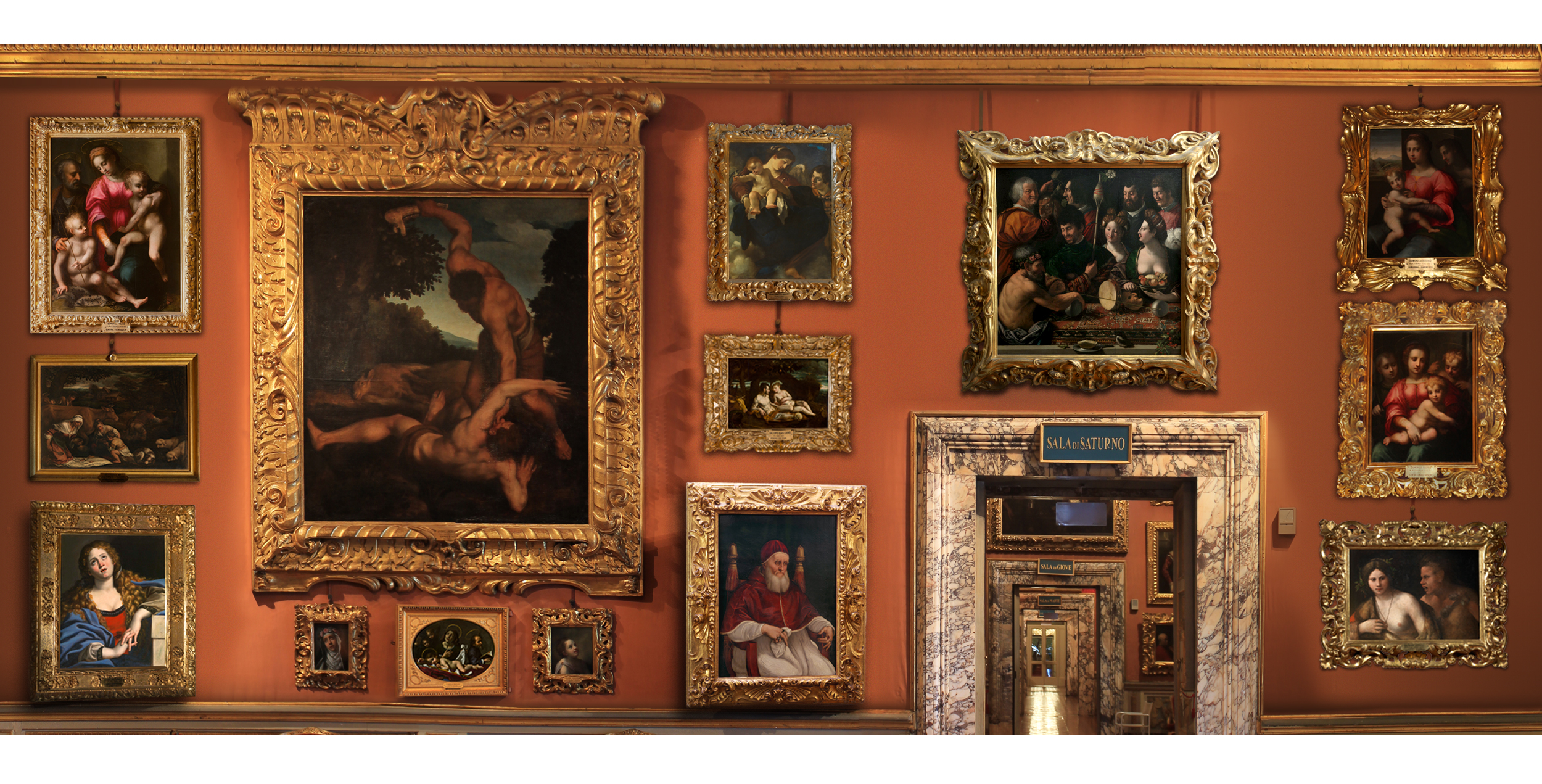 In the photomontage it is possible to see some works that today are on view elsewhere like the Witchcraft by Dosso Dossi, now at the Uffizi, over the door frame, the Nymph and the Satyr by the same artist on the right corner, the Titianesque Portrait of Pope Julius II by Raphael to the left of the door, Mary Magdalene by Domenichino now in the adjacent Room of Iliad and two paintings featuring the Virgin with the Baby by Domenico Puligo.