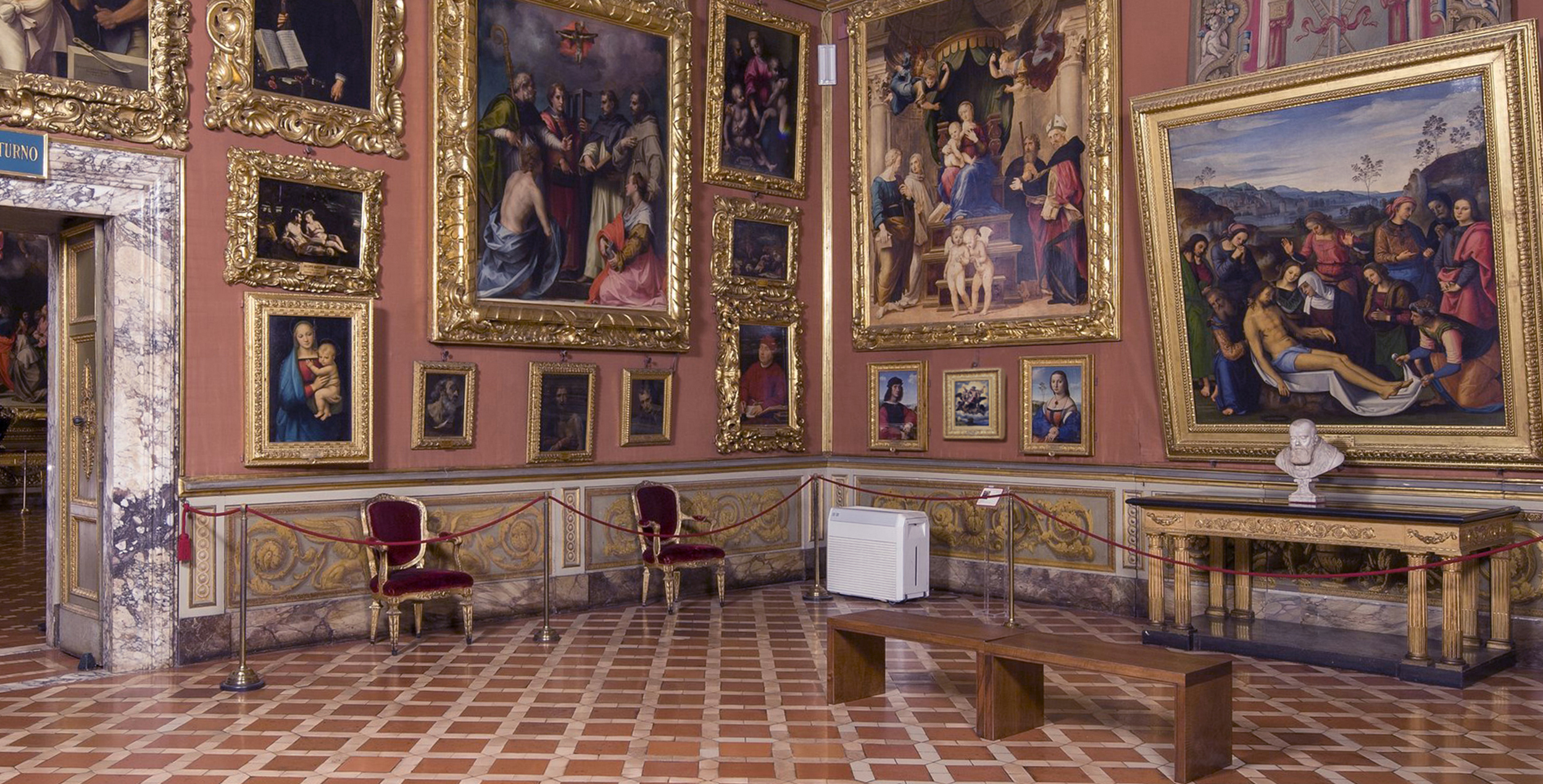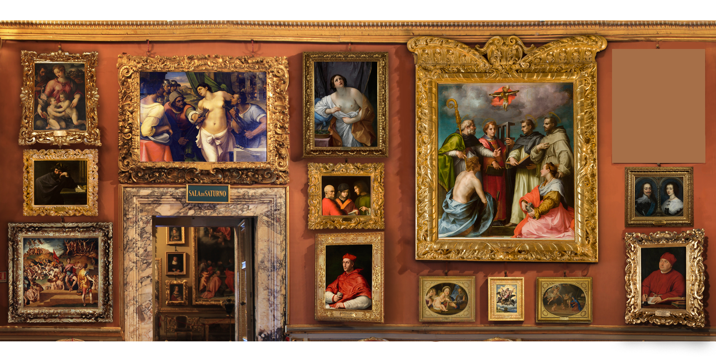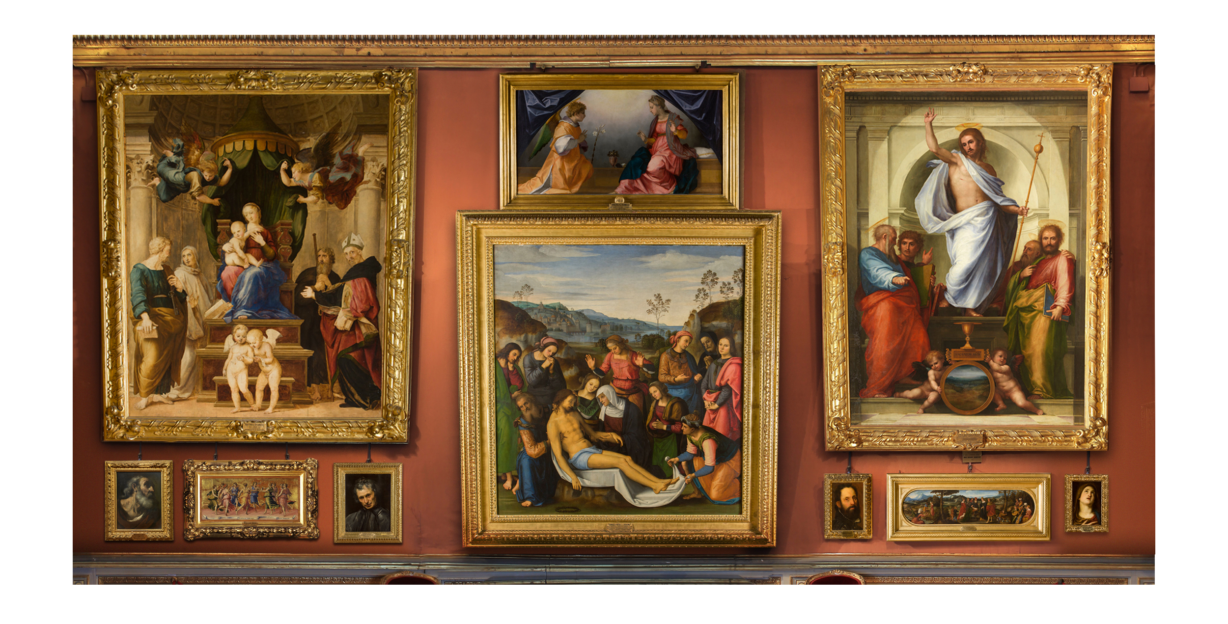 The three large altarpieces of the wall have been left in the same position described by Inghirami in his 1828 guide, while other works have been located elsewhere, like Apollo and the Muses by Baldassarre Peruzzi, moved to the Room of Prometheus, and the Scali Annunciation by Andrea del Sarto, now located over the southern wall’s door frame of the Room of Saturn itself.