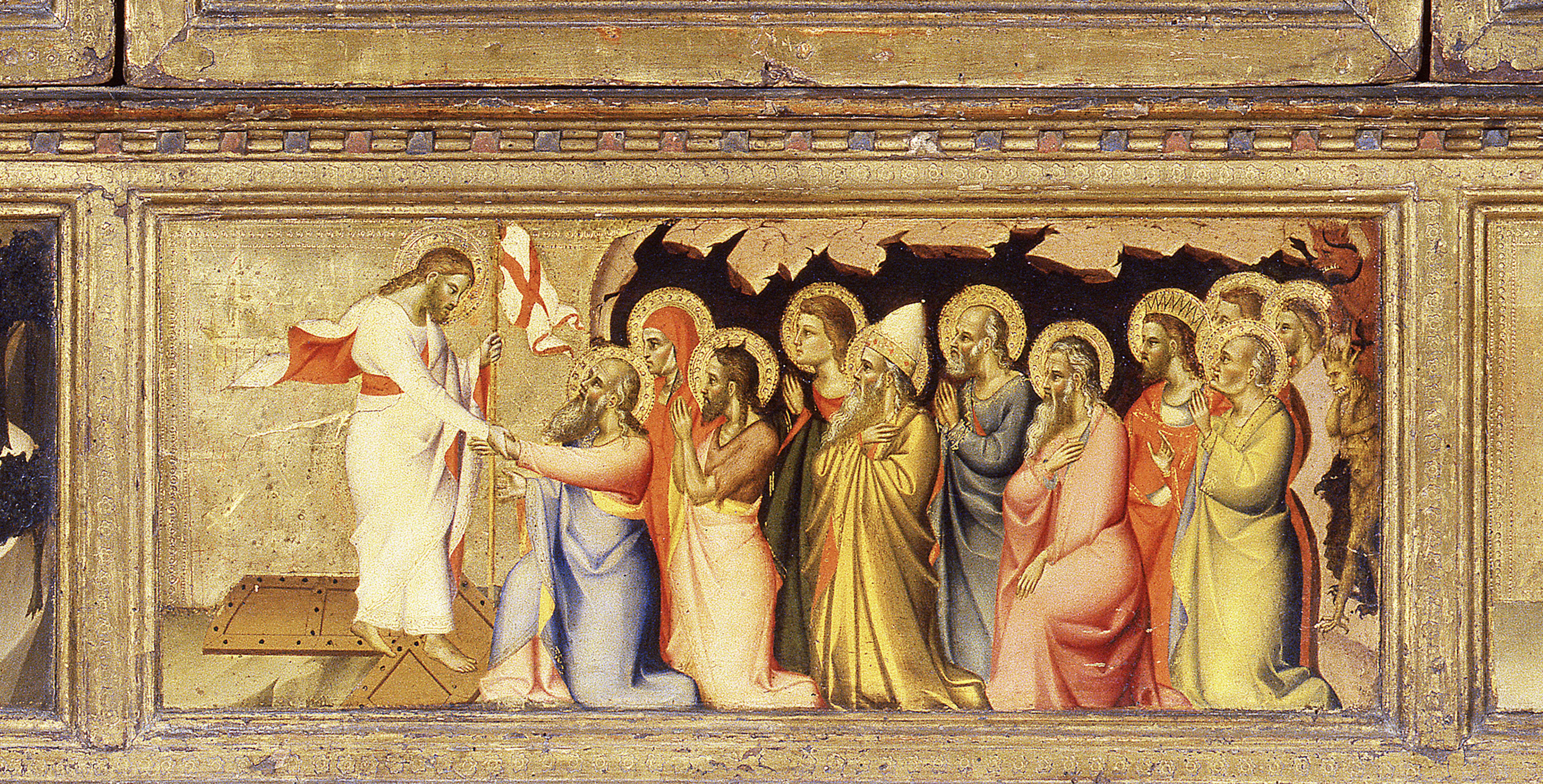 Under his himation – a garment worn by ancient Greeks and often seen in depictions of the apostles – he wears a rough, camel hair tunic held together by animal skin, which mimics his description in the gospels (Matthew 3:4, Mark 1:6 ). This garment renders John a prophet – in line with various passages from the Bible (2 Kings 1:8; Zechariah 13:4) – and consistently features in depictions of the saint and the hermits in general. In Giovanni del Biondo’s painting, John the Baptist is holding a scroll inscribed with EGO VOX CLAMANTIS IN DESERTO (I am the voice crying in the desert, John 1:23), which is a direct quote from the gospels. Together with the cross in his right hand, this proclamation identifies John as the forerunner sent to announce the advent of the Kingdom of Heaven and to prepare for the coming of Christ. Here, John is shown standing triumphantly over King Herod Antipas, his executioner, which is somewhat of an iconographic rarity. The king is holding a cartouche in which he expresses repentance for the sinful, cruel life he has led, using the words uttered by the wicked before judgment, “NON INSENSATI VITA ILLORUM EXTIMABAMUS INSANIAM ET FINEM ILLORUM SINE HONORE ECCE QUOMODO COMPUTATI SUNT INTER FILIOS DOMINI ET INTER SANCTOS SORS ILLORUM EST” (We foolishly considered their life to be madness and their end to be without honour. Behold, how they are numbered among the children of God, and their lot is among the saints - Book of Wisdom 5:4-5). - 6/36I. St. John the Baptist. An icon of faith