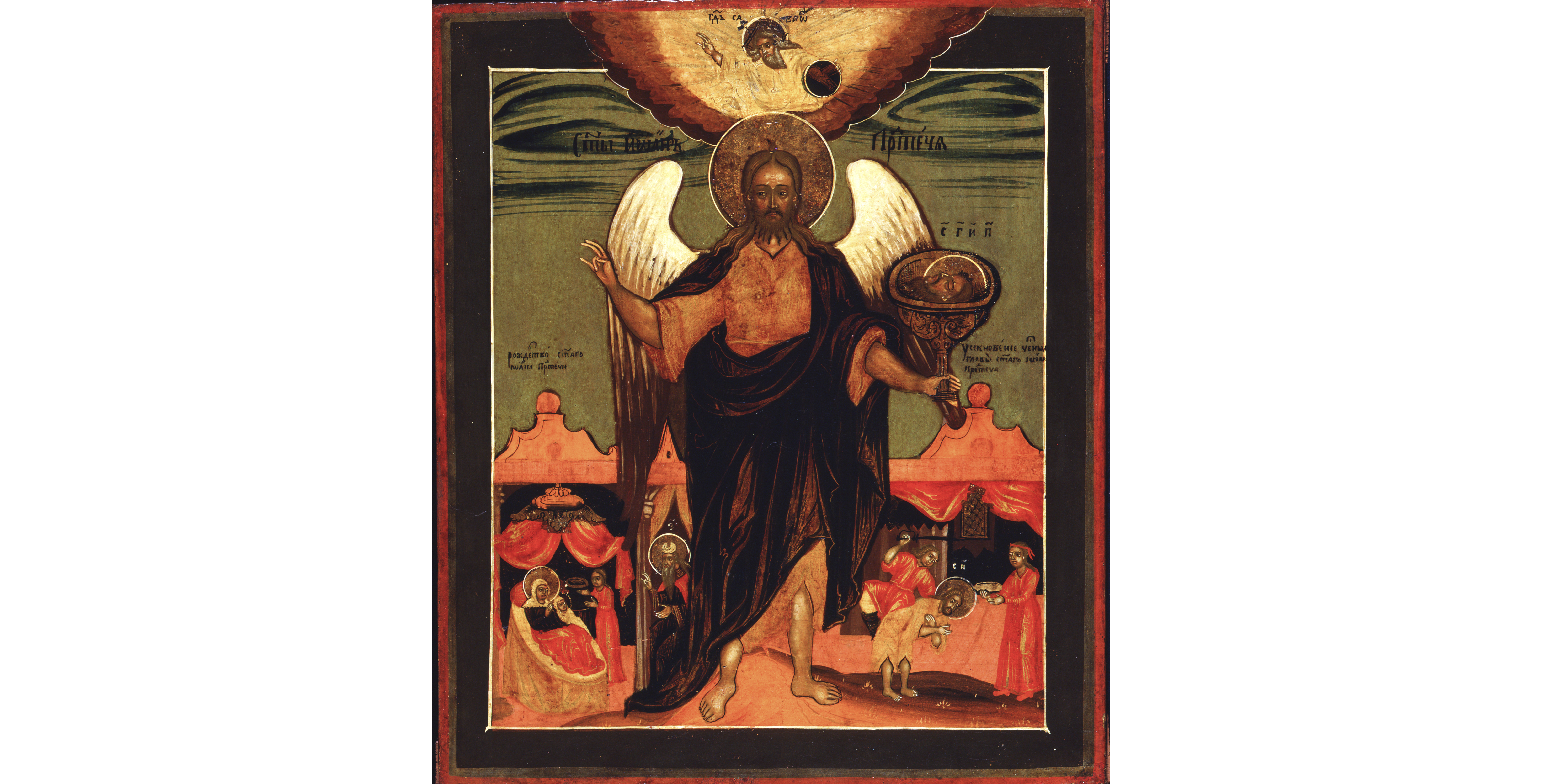 Uffizi Galleries, Gallery of Statues and Paintings, deposits, inv. 1890 no. 9366John the Baptist is dressed in a camel hair tunic – often worn by the prophets and ascetics – over which a deep red himation is laid. He is depicted blessing people and carrying a bowl containing his severed head, a symbol of martyrdom and a reference to the relic of John’s skull, which is highly venerated in the Orthodox world, after its solemn journey to Constantinople in the ninth century. The inscription reads С(ВЯ)ТЫ ИОАНЪ ПР(Е)ДТЕЧА, which identifies him as Saint John the Forerunner. The saint stands barefoot on the earth with a large pair of colourful wings that depict him as the ‘angel of the desert.’ This particular iconography was widespread in the Christian East from the thirteenth century onwards (the oldest example of which can be found in the Church of St. Achillius, Arilje in Serbia) and celebrates John as a heavenly messenger preparing for the coming of Christ (from the Greek ἄγγελος, or messenger, from which the word angel derives). The image itself refers to the prophecies of Isaiah and Malachi recounted in the gospels, ‘Behold I send my messenger before thy face, which shall prepare the way before thee’ (Matthew 3:2, 11:10; Mark 1:2; Luke 7:27). The image therefore celebrates John as the greatest of the prophets.