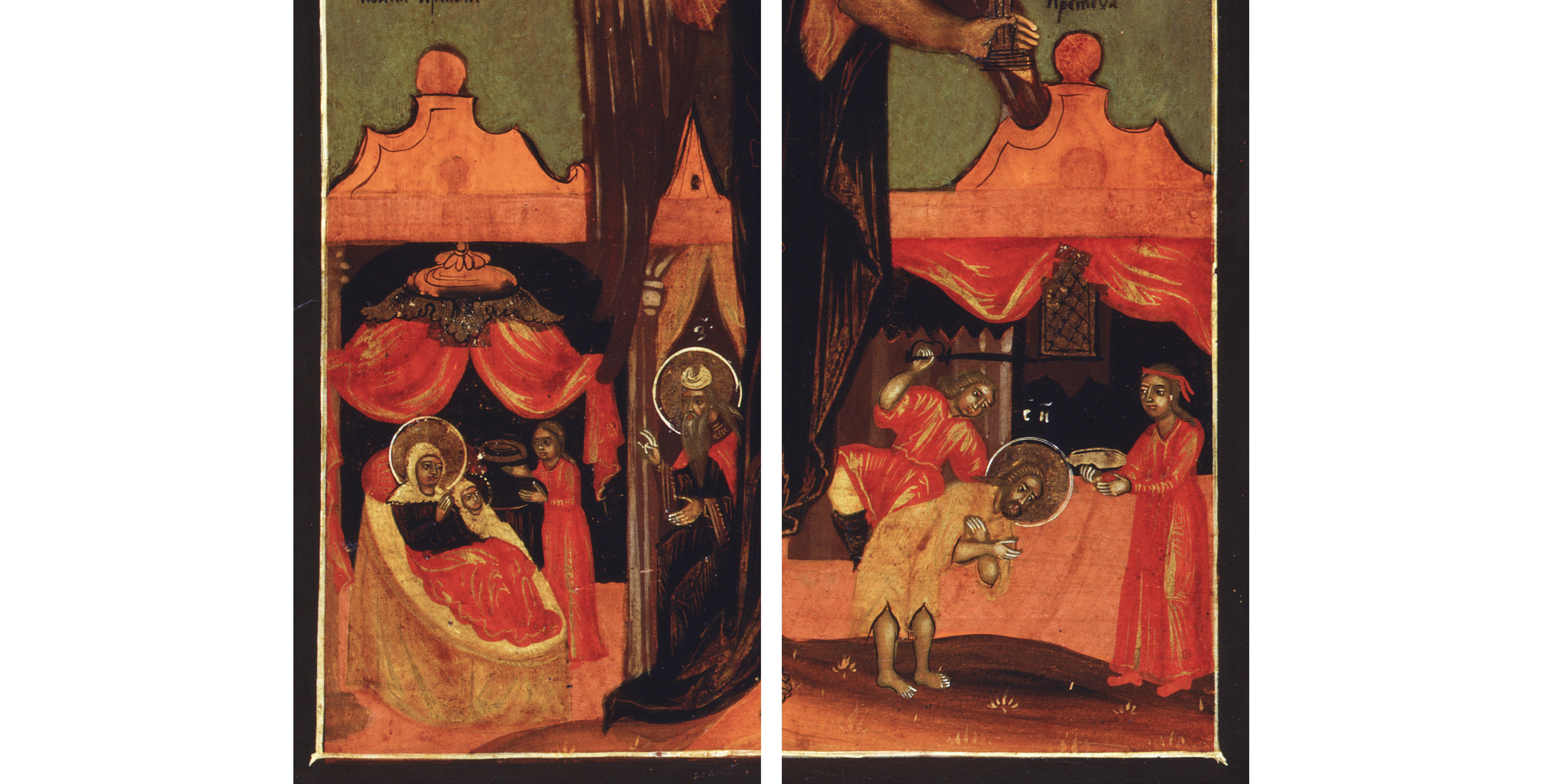 The saint himself is surrounded by scenes from his life, from his prodigious conception by his elderly parents, Elizabeth and Zechariah, to a period spent praying, preaching and baptising people in the desert, up to his final moments spent imprisoned before his beheading at the hands of Herod, Salome and her mother, Herodias. John’s story ends with the descent of the risen Christ to the underworld (Harrowing of Hell) to free the righteous, among whom is John. This is the only episode that is not inspired by the gospels, but it was nevertheless very popular in the iconographic traditions of the Christian East and was based on the predictions of the prophet David, as mentioned in the Acts of the Apostles (2:29-32).