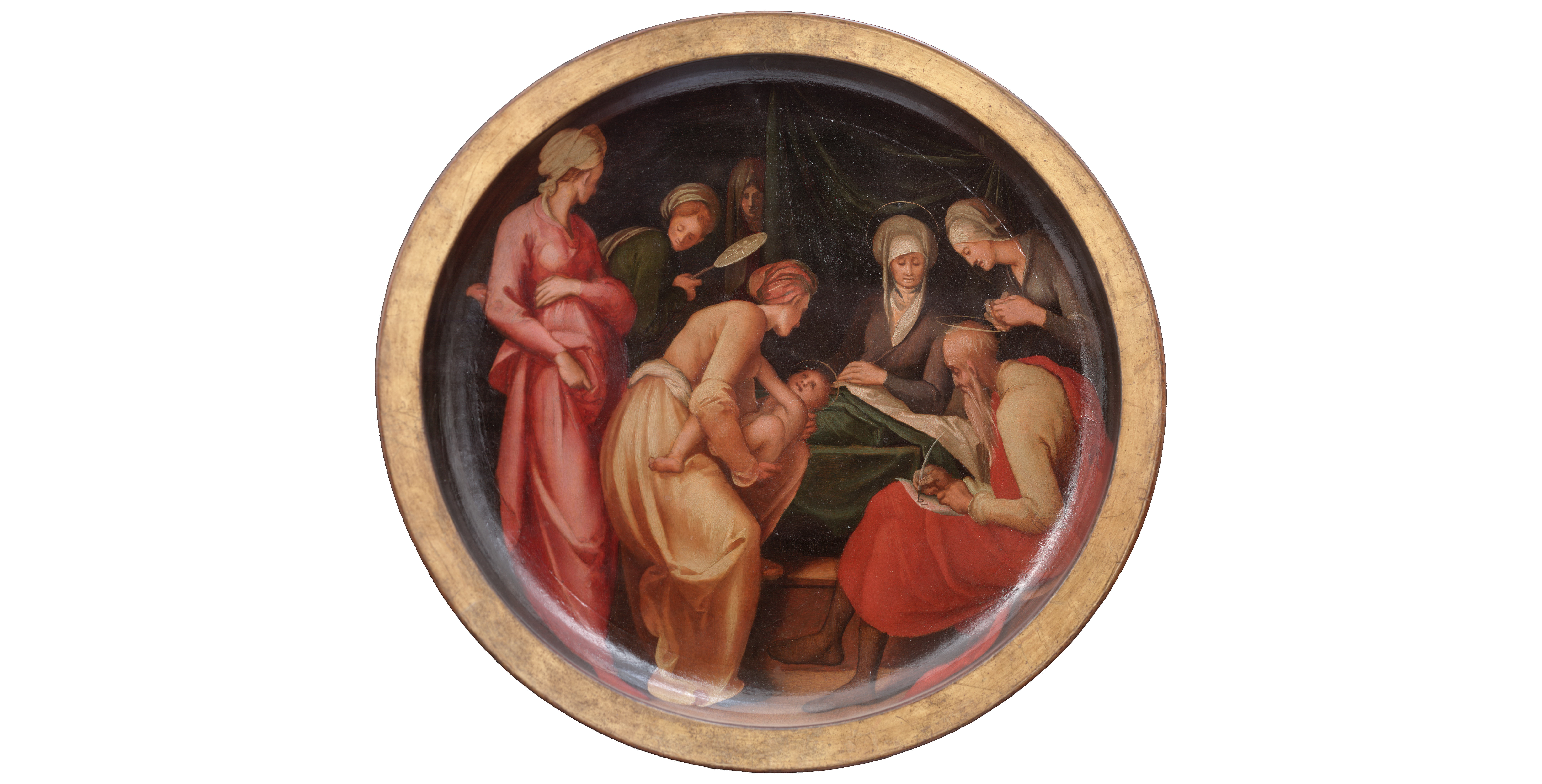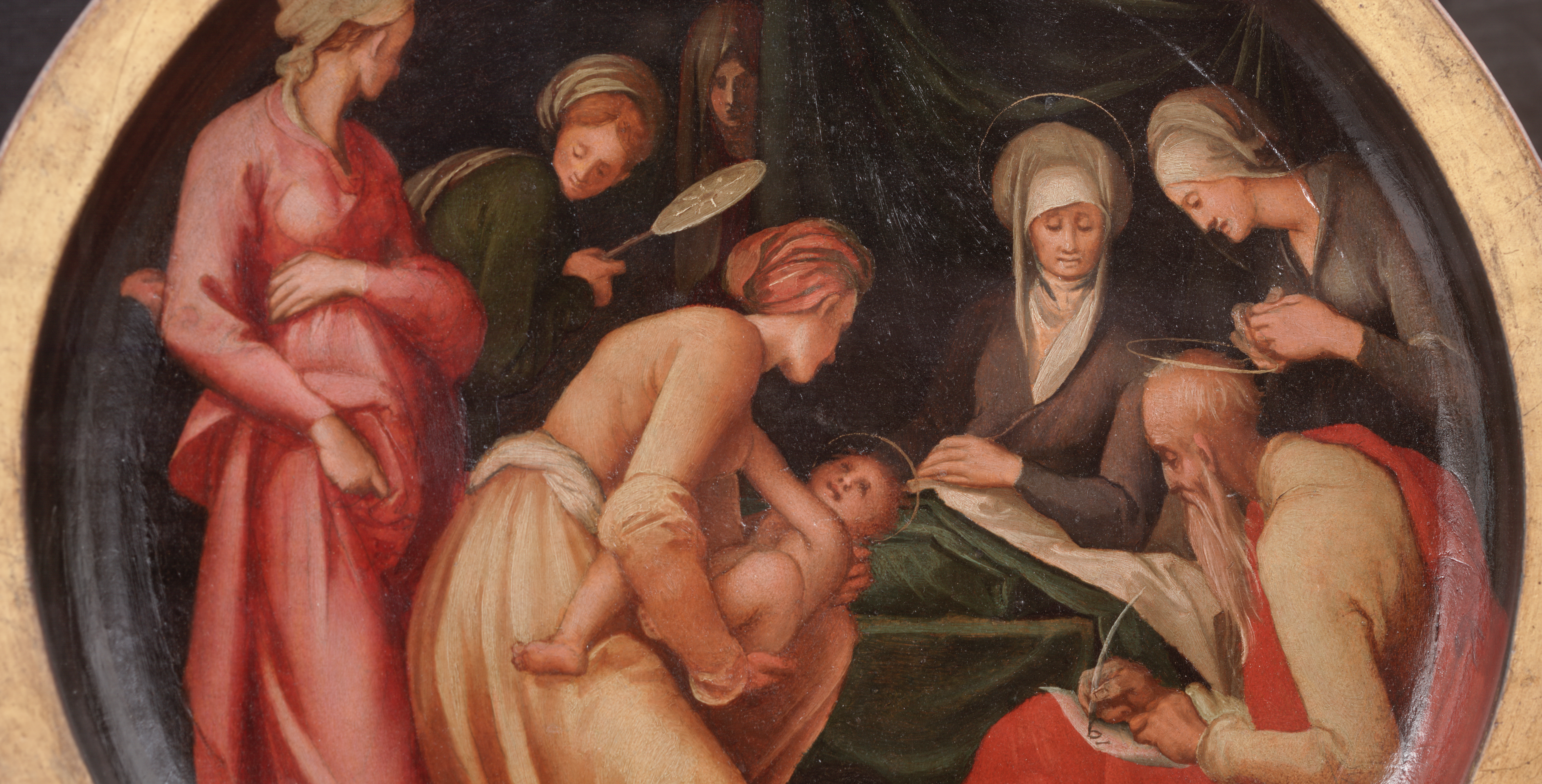 John was born into a priestly family in Ein Karem, about seven kilometres west of Jerusalem. His father, Zechariah was of the Abia class, while his mother Elizabeth, was descended from Aaron. The two were observant of the laws of the Old Testament but had no children, as Elizabeth was no longer fertile and ‘both of them were ahead in their years.’ John the Baptist’s conception is therefore marked by a prodigious event. One day, while Zechariah was selling incense at the Temple, a messenger of God, the archangel Gabriel, appeared before him, and said, ‘Do not be afraid Zechariah, your prayer has been heard and your wife Elizabeth will give you a son whom you will call John.’ Zechariah, incredulous at the announcement of his unexpected fatherhood, expressed his doubts to the angel, who punished him for his hesitation, condemning him to remain deaf and dumb until John’s birth. The scene painted by Pontormo, commonly referred to as the Nativity, also depicts the child’s circumcision, which took place eight days after the joyous event. Zechariah is depicted writing the name of his son, John, under Elizabeth’s attentive gaze, which means, ‘the Lord gives grace.’ A maid approaches the infant, another standing behind her, and checks his writing. The circular format frames a sober, composed environment where the only liveliness is offered by the child’s pose, who is attempting to escape the nurse’s grip.