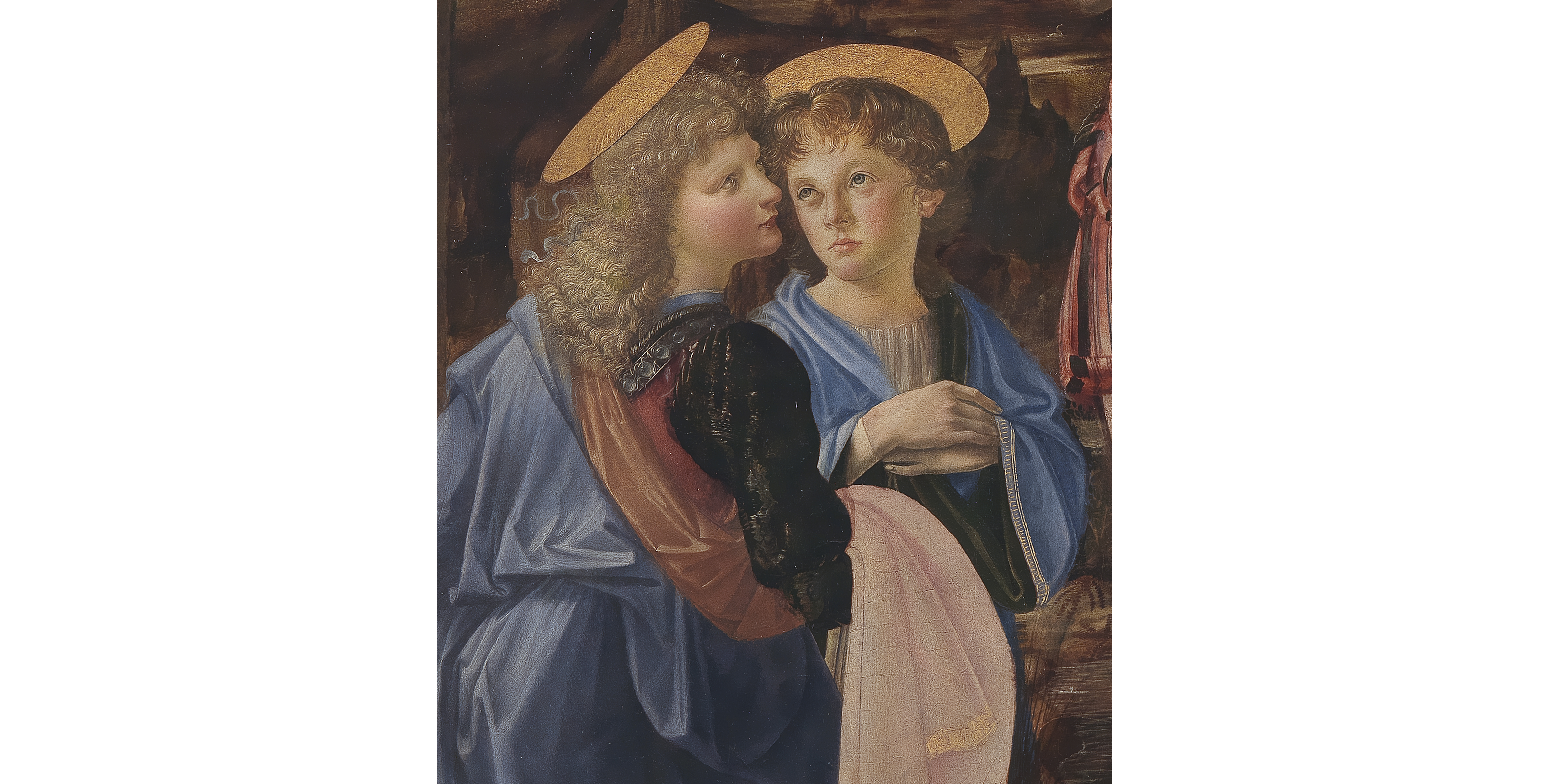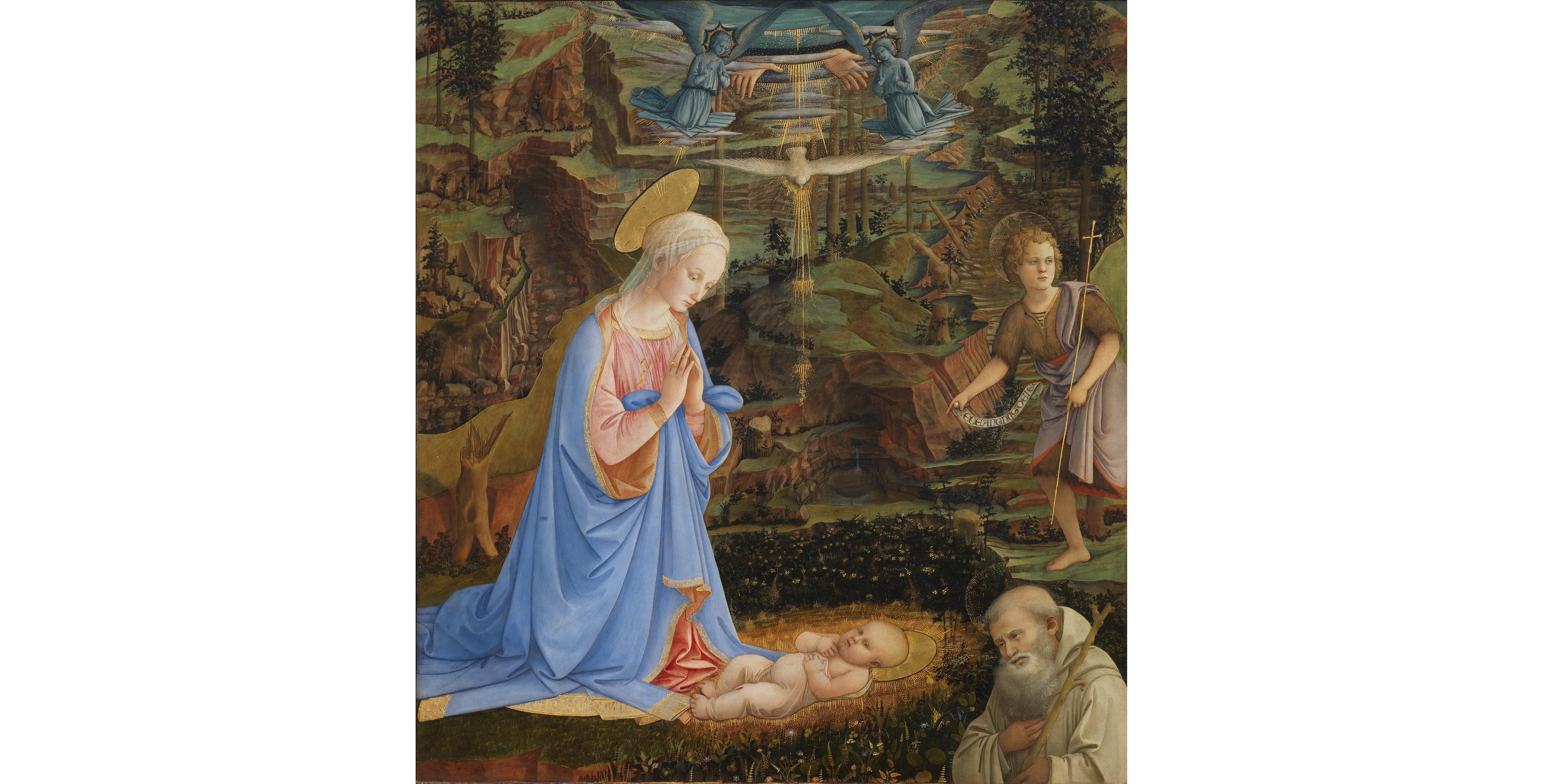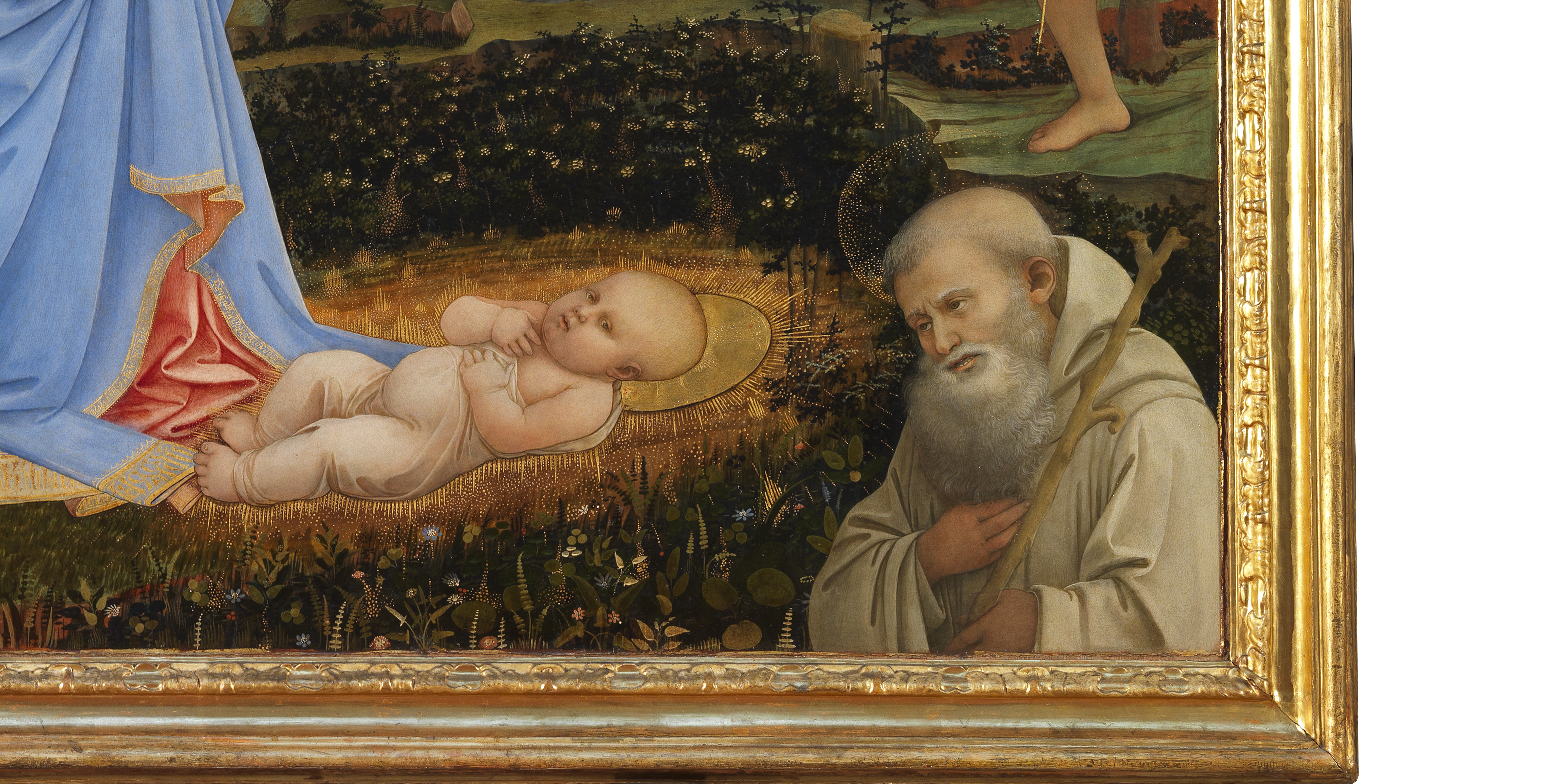 In addition to John the Baptist, the founder of the Camaldolese order Romuald features in the background of this composition, absorbed in meditation. The sacred image is therefore an invitation to practice penance and meditation as a way to be closer to God, following the example of the saints John the Baptist and Romuald. The painting comes from the Camaldoli monastery, home of the religious order, and it once stood above the altar of a chamber dedicated to Saint John the Baptist and built by Piero il Gottoso de’ Medici in 1463 for use by the family. The coats of arms of Piero and his wife Lucrezia Tornabuoni originally adorned the altarpiece. Patron Saint of Florence, John the Baptist was a subject of particular devotion for Lucrezia, who also wrote a poem about him.