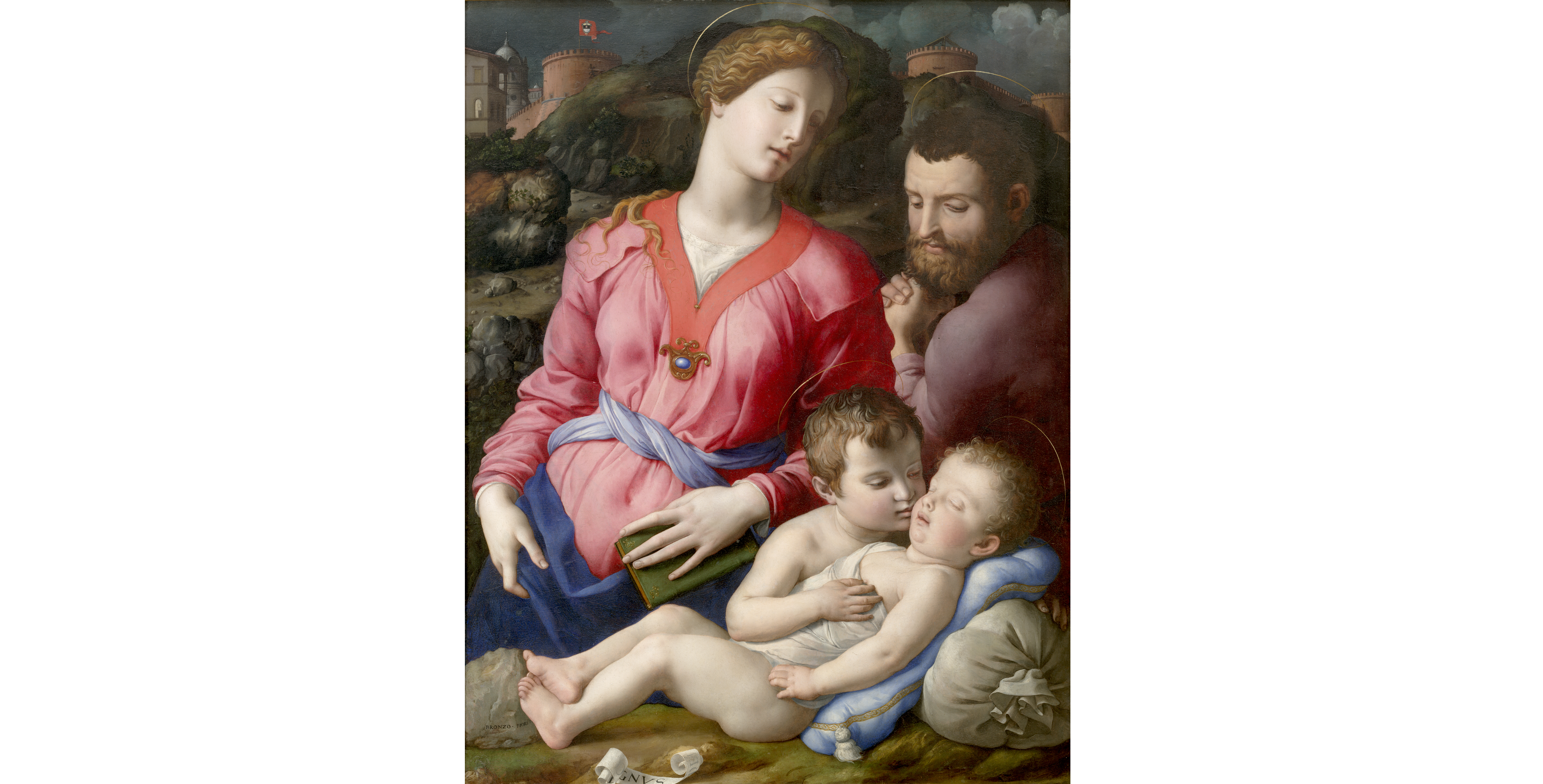 In an almost suspended atmosphere, a cold, intense light illuminates Mary – who has the appearance of a majestic, classical statue – while she and Joseph watch over a sleeping Baby Jesus, lying serenely on a pillow atop their travel bag. This detail, together with a background dominated by towering walls and the flag of Bartolomeo Panciatichi, suggests a connection to the Flight into Egypt, which medieval and Renaissance sources – perhaps in an effort to embellish the original story told in the gospels – identify as one of the very first occasions on which Jesus met John, who was sometimes miraculously transported by an angel to Egypt to be reunited with the Holy Family, or who was alternatively described as already residing in the desert that Mary, Jesus and Joseph traverse to return home.
