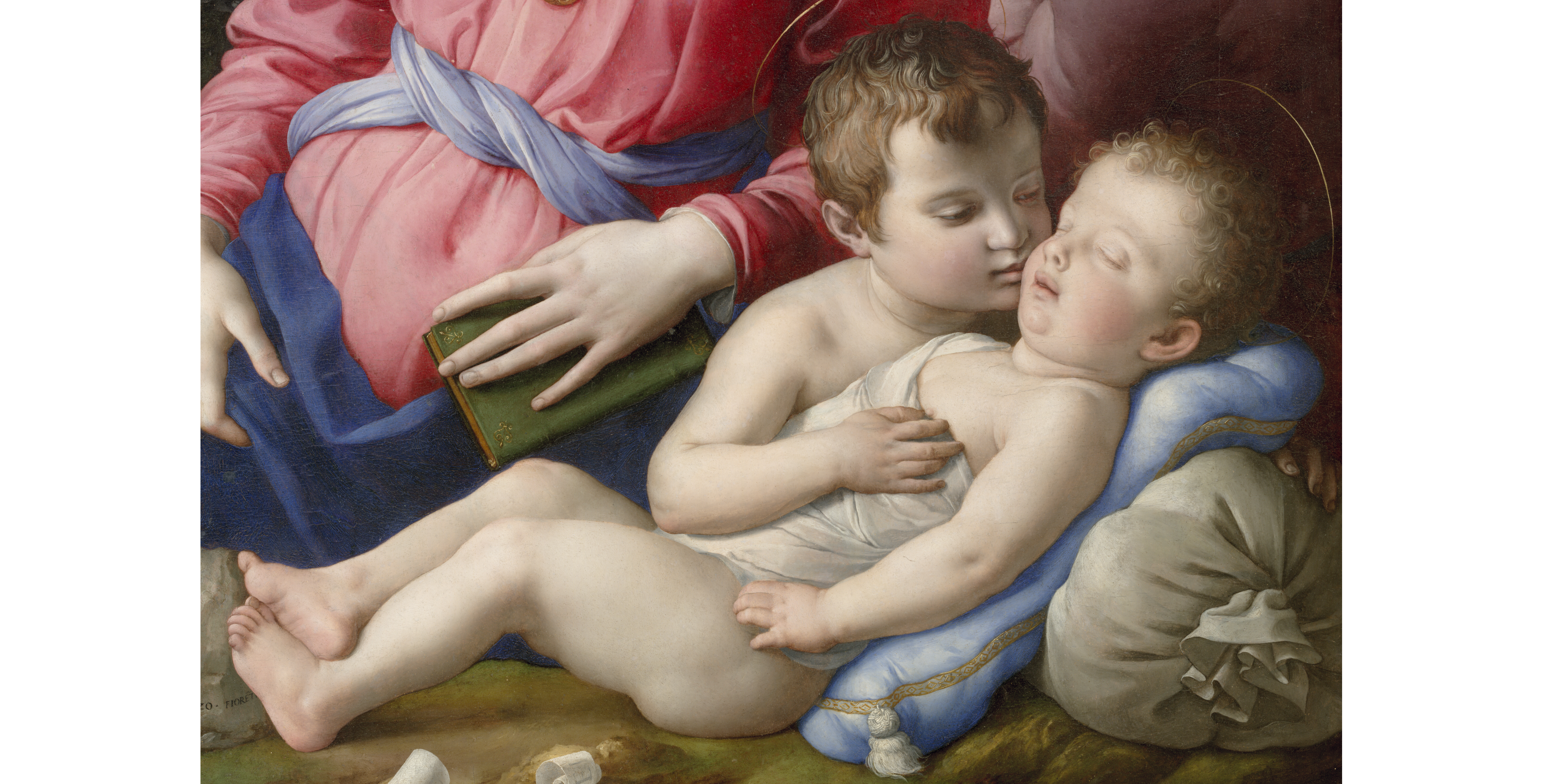 Sixteenth-century writings on the ‘Life of Saint John’ expand on the two children and their embraces upon meeting, recognising each other as carriers of a shared fate and martyrdom. Bronzino’s depiction, however, is dominated by Jesus’ deep slumber, over whom little John is gently bent in order to place a kiss on his cheek. Jesus’ pose symbolically anticipates the Deposition of Christ, while the formal references to classical sculpture and the Doni Tondo bear powerful witness to Bronzino’s primary sources. However, it is this very tender gesture – of both affection and reverence – that accentuates the sense of human familiarity in this painting, which was intended for private viewings by the artist’s erudite client, a Florentine academic who existed on the fringes of the religious turmoil and reform that were dominant in Italy in the mid-sixteenth century.