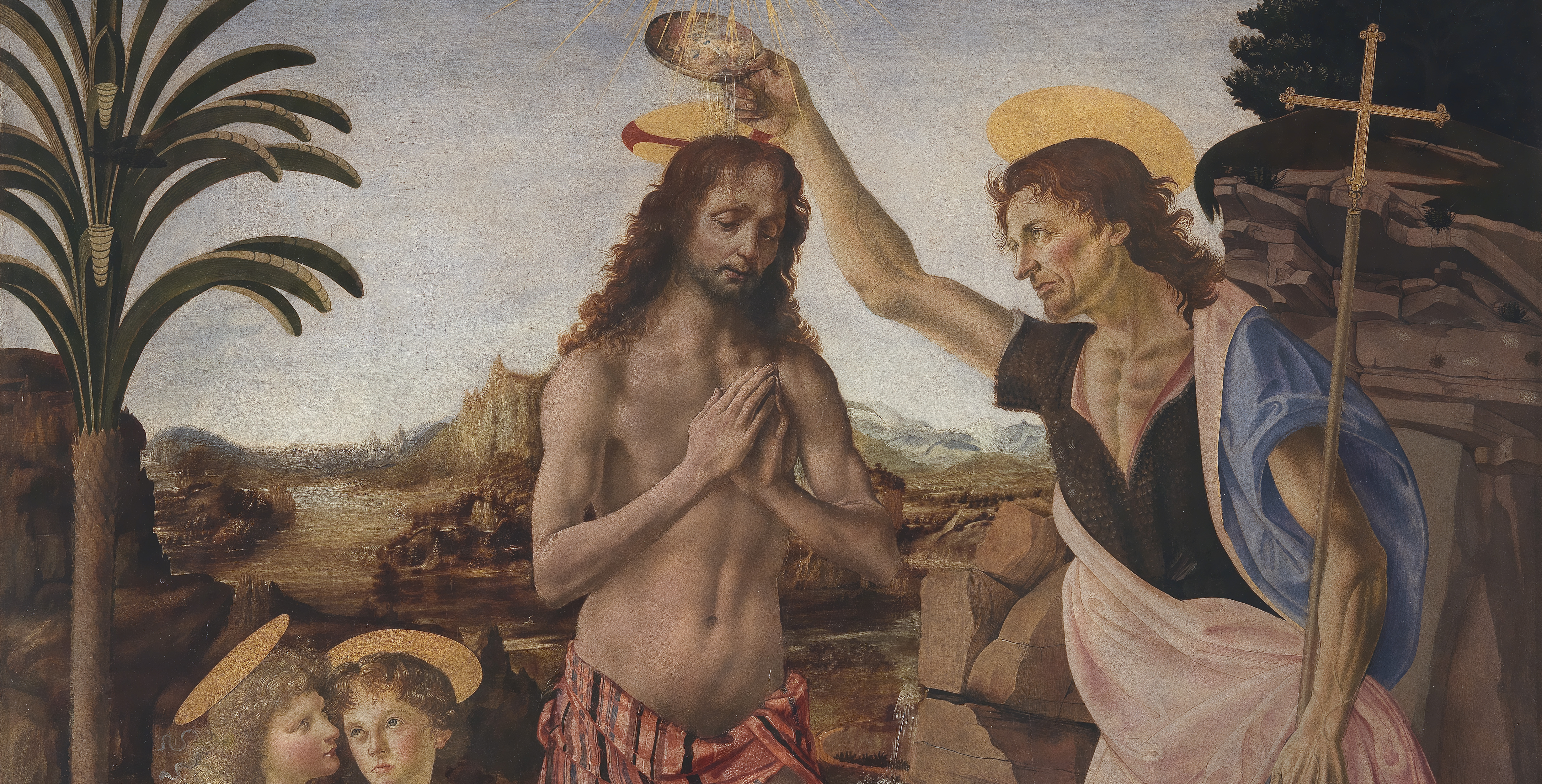 Uffizi Galleries, Gallery of Statues and Paintings, inv. 1890 no. 8359Jesus and John stand with their feet immersed in the River Jordan, while John pours water on the head of the Son of God from a bowl, according to the rite of baptism by infusion. In Florence, this practice almost entirely replaced baptisms by immersion from the fourteenth century onwards.