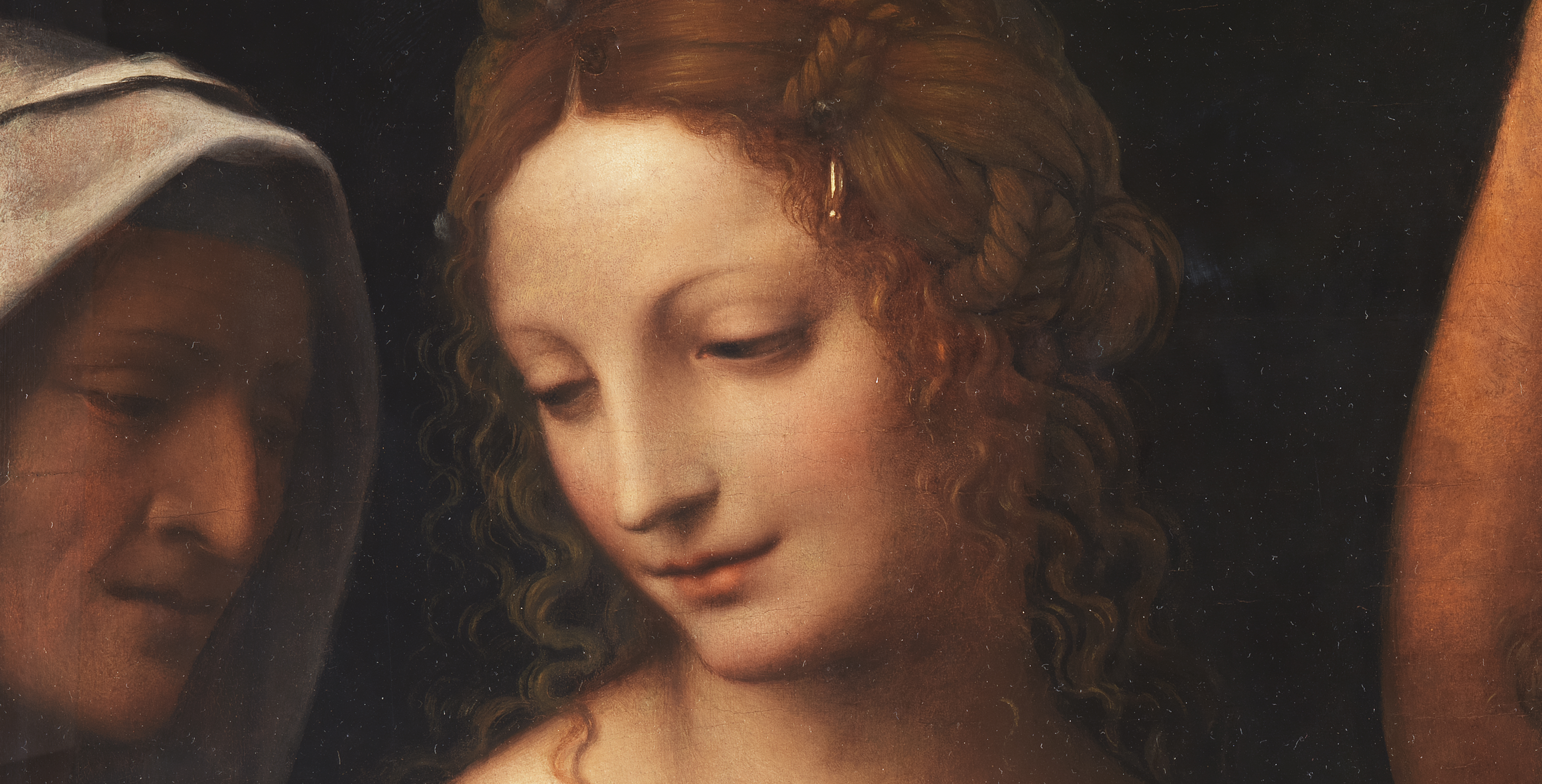 Rather than referring to the gospels, Luini was instead inspired by Leonardo and his famous Testa di Fanciulla – traditionally known as La Scapigliata (Parma, National Gallery) – on whom he bases his depiction of John’s head, with eyes lowered and lips parted, as though he is whispering to the servant next to Salome. In fact, the painting was originally attributed to Leonardo when it was sent from Vienna’s imperial collections to Florence in 1792 as part of an exchange between the Habsburg-Lorraine family collections. Quoted several times by Stendhal in his writings, it was definitively traced to Luini in the 1830s. Over time, critics have put works from this era into chronological order, thereby reducing the centrality of this particular painting, which they attributed to a later date in the 1520s.