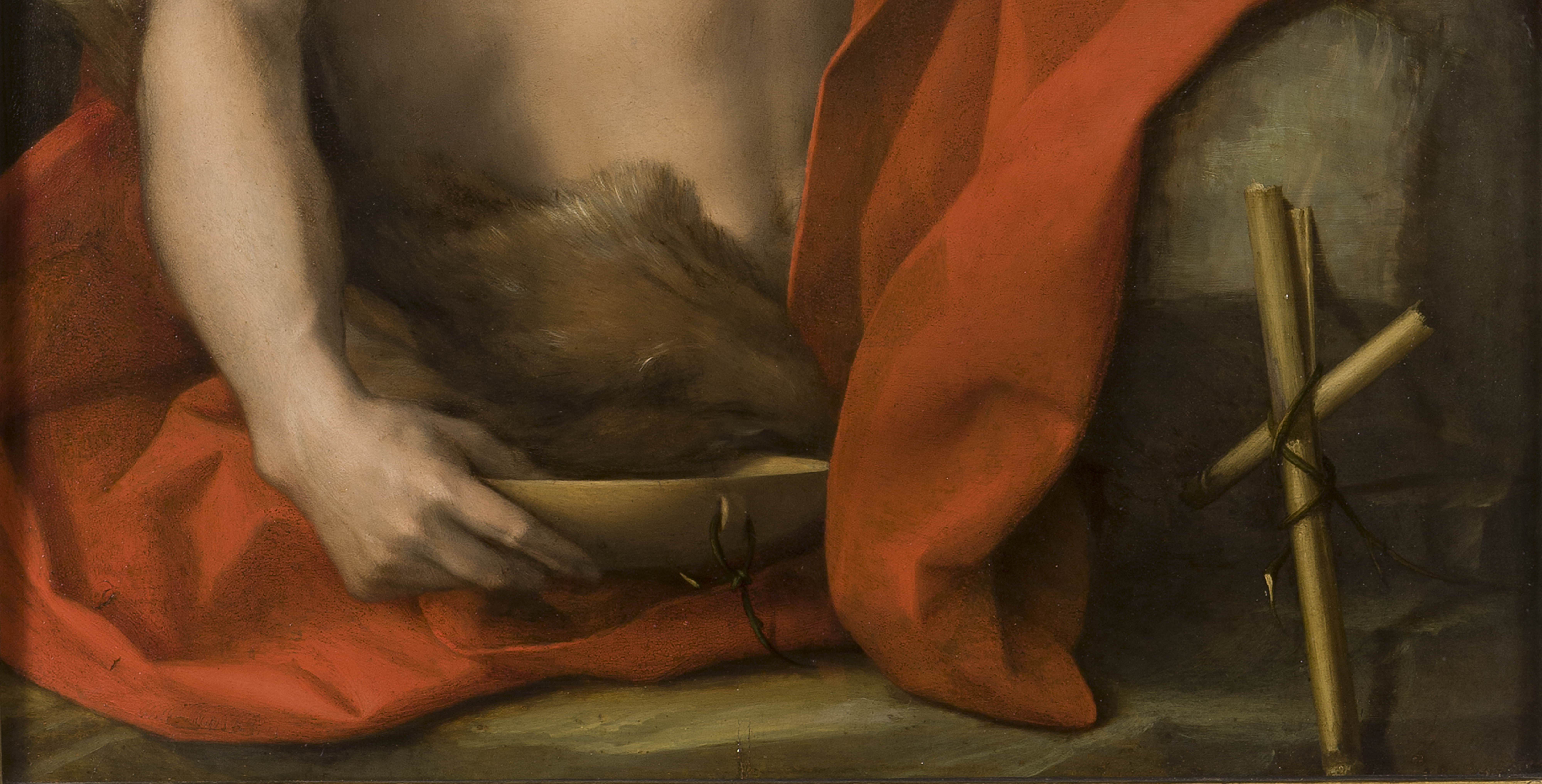 The painting’s severe, tormented aspect evokes a period of intense loneliness spent in the desert, a circumstance symbolically represented by the camel hair outfit underneath John’s red tunic, and a crucifix composed of two simple reeds. The saint’s unkempt appearance juxtaposes his striking red robe – the colour of martyrdom – which is embellished with a decorative trim, golden damask embroidery and fringes. It is worn proudly by the Baptist, as if it were a cape. John holds a cartouche in his hand with a worn inscription that reads EGO (SUM) VOX (CLAMANTIS IN DESERTO), ‘I am the voice crying in the desert.’ - 10/36I. St. John the Baptist. An icon of faith