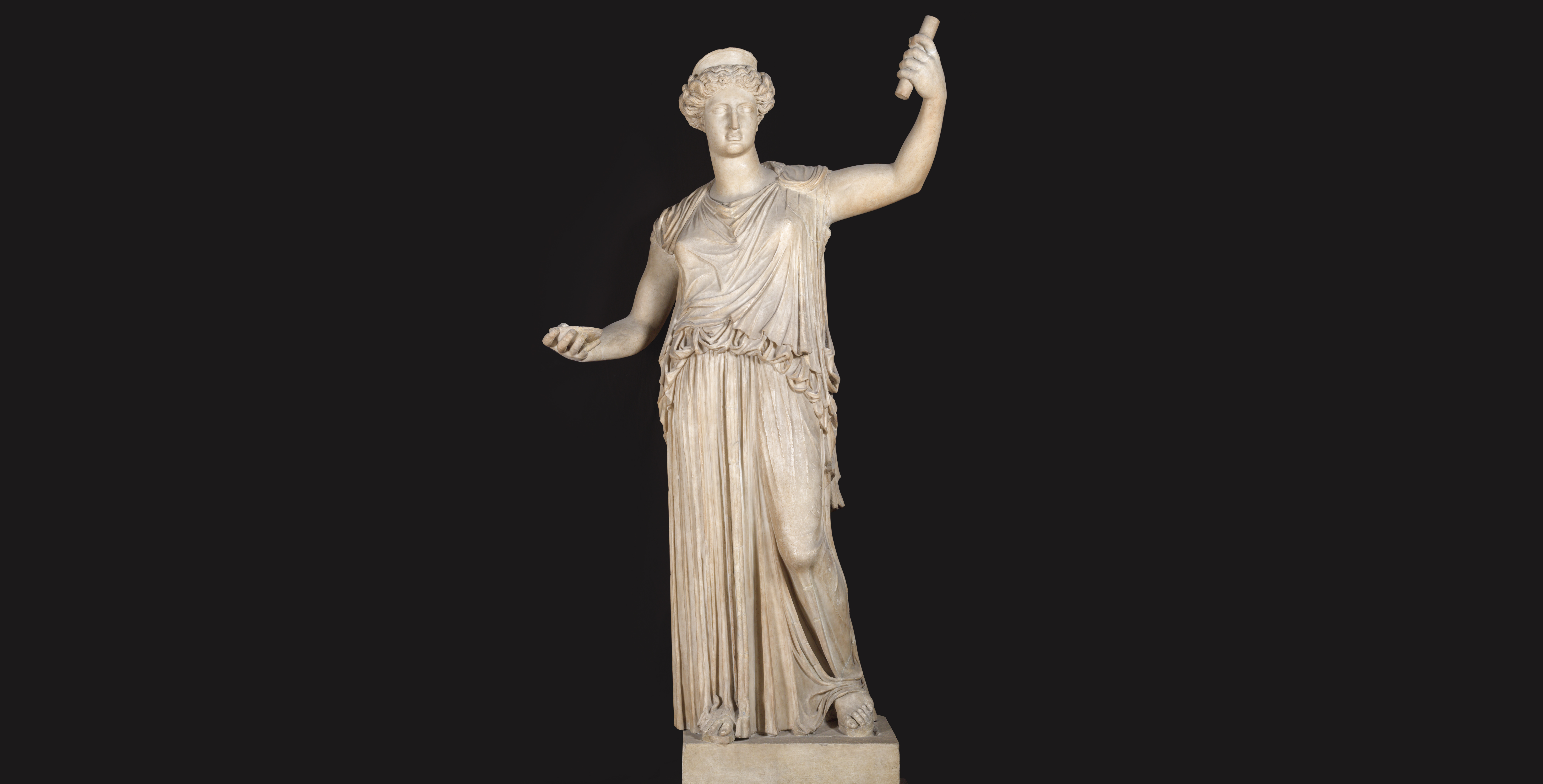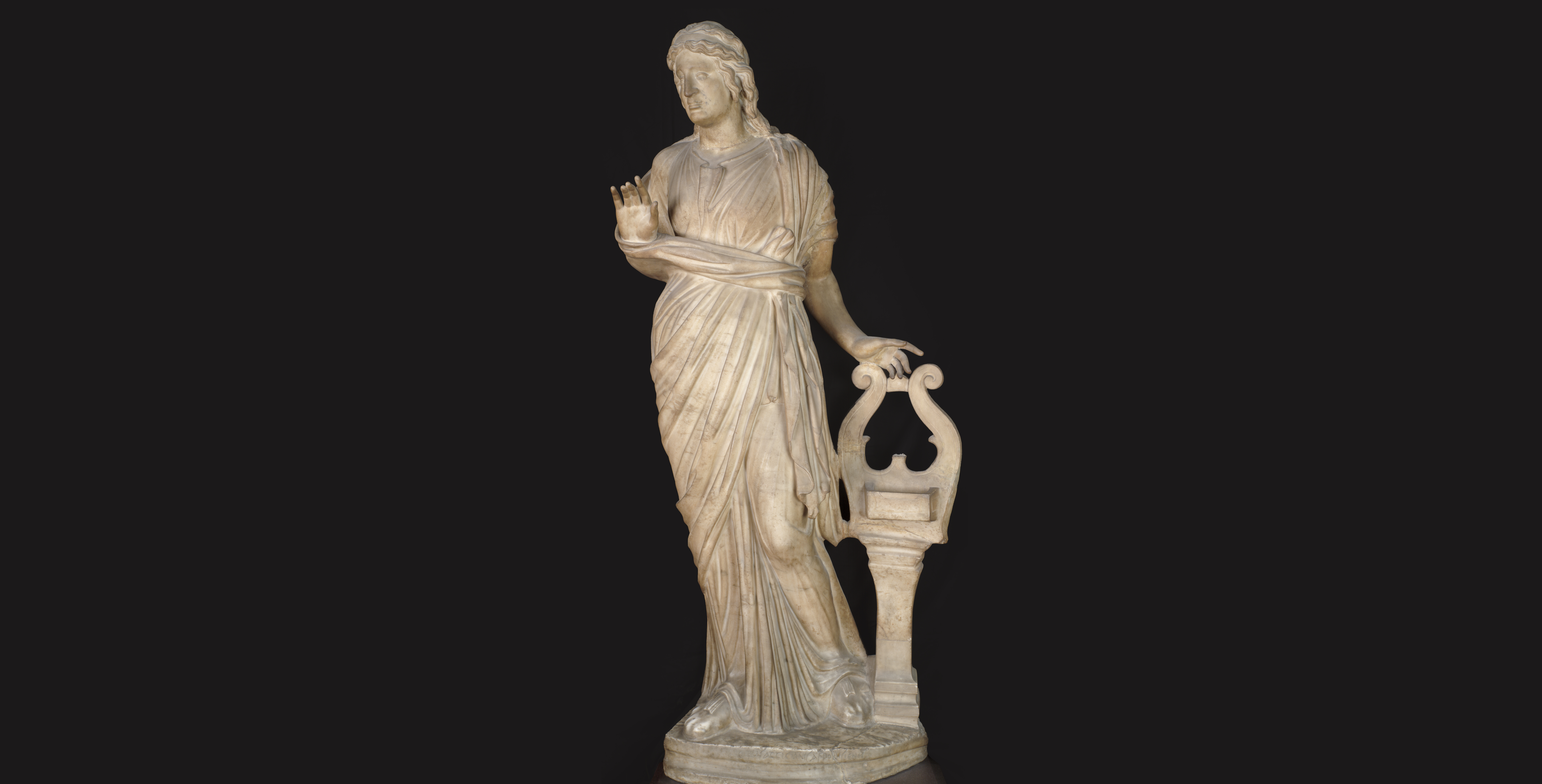 The figure depicted is Terpsichore, the Muse of dance, portrayed standing up alongside a cithara. She is wearing a long robe and a cloak which, gathered at the waist, is almost trapping her right arm. The head was restored in modern times and proof of this is visible in the remains of strands of hair falling on to the shoulders, which do not combine seamlessly with those on the head. Undoubtedly, the element of this work that has made it famous is the signature of its sculptor, Atticianus, inscribed on the base. - 44/45Atticianus’ Muse