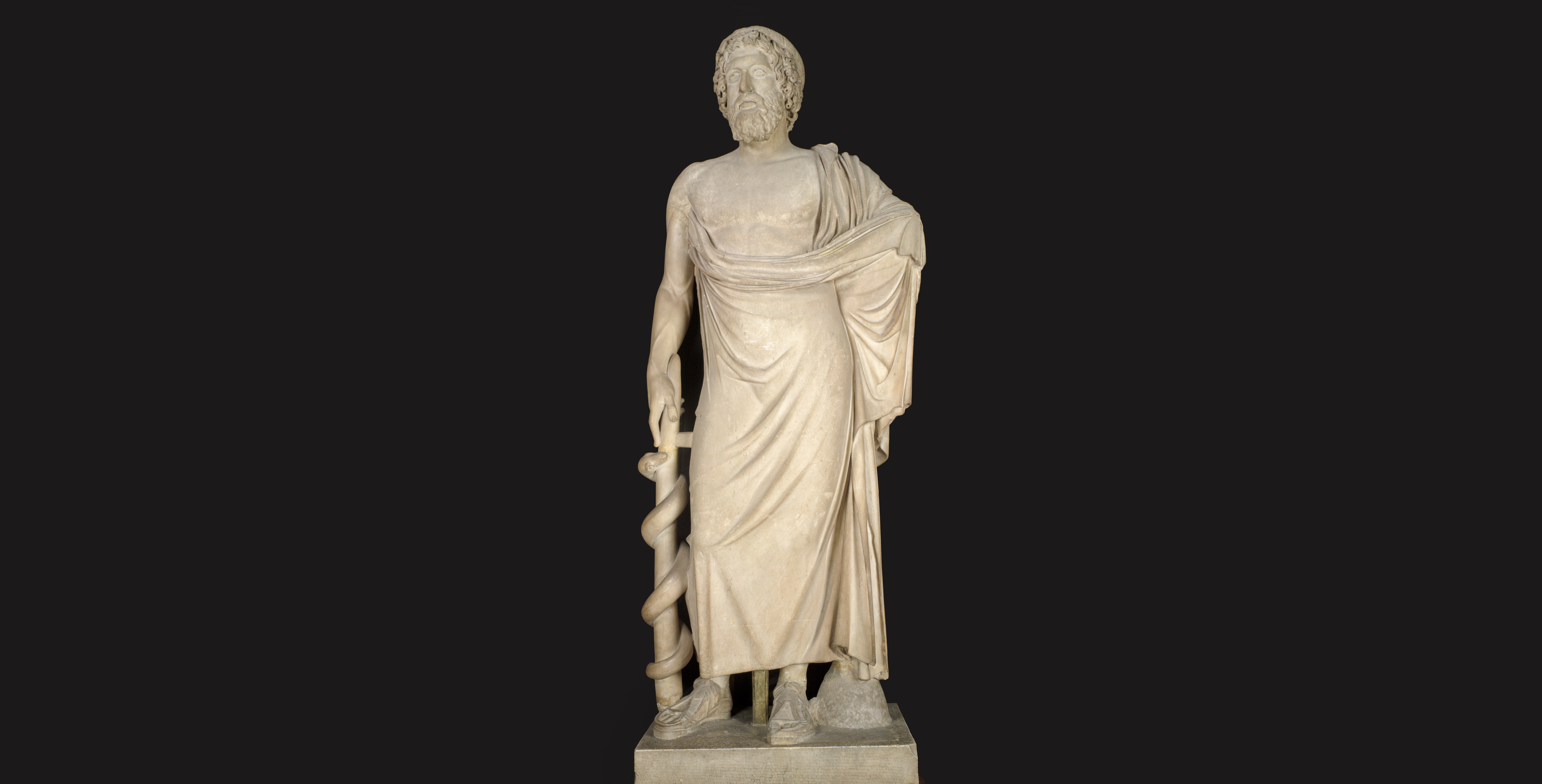 The statue depicts the god Asclepius standing up, robed and accompanied by his characteristic stick, with a serpent coiled round it. It is a Roman replica of a Greek original from the end of the 5th century B.C. The work has been extraordinarily well preserved, and has therefore required little in the way of restoration. The almost metallic finish of some of the facial features, such as the lips and the eyebrows, combined with the style of the robes, lead us to suppose that the late-Classical original from which the copier took his inspiration was in bronze; the Roman replica, on the other hand, appears more likely to date to before the end of the 1st century A.D.