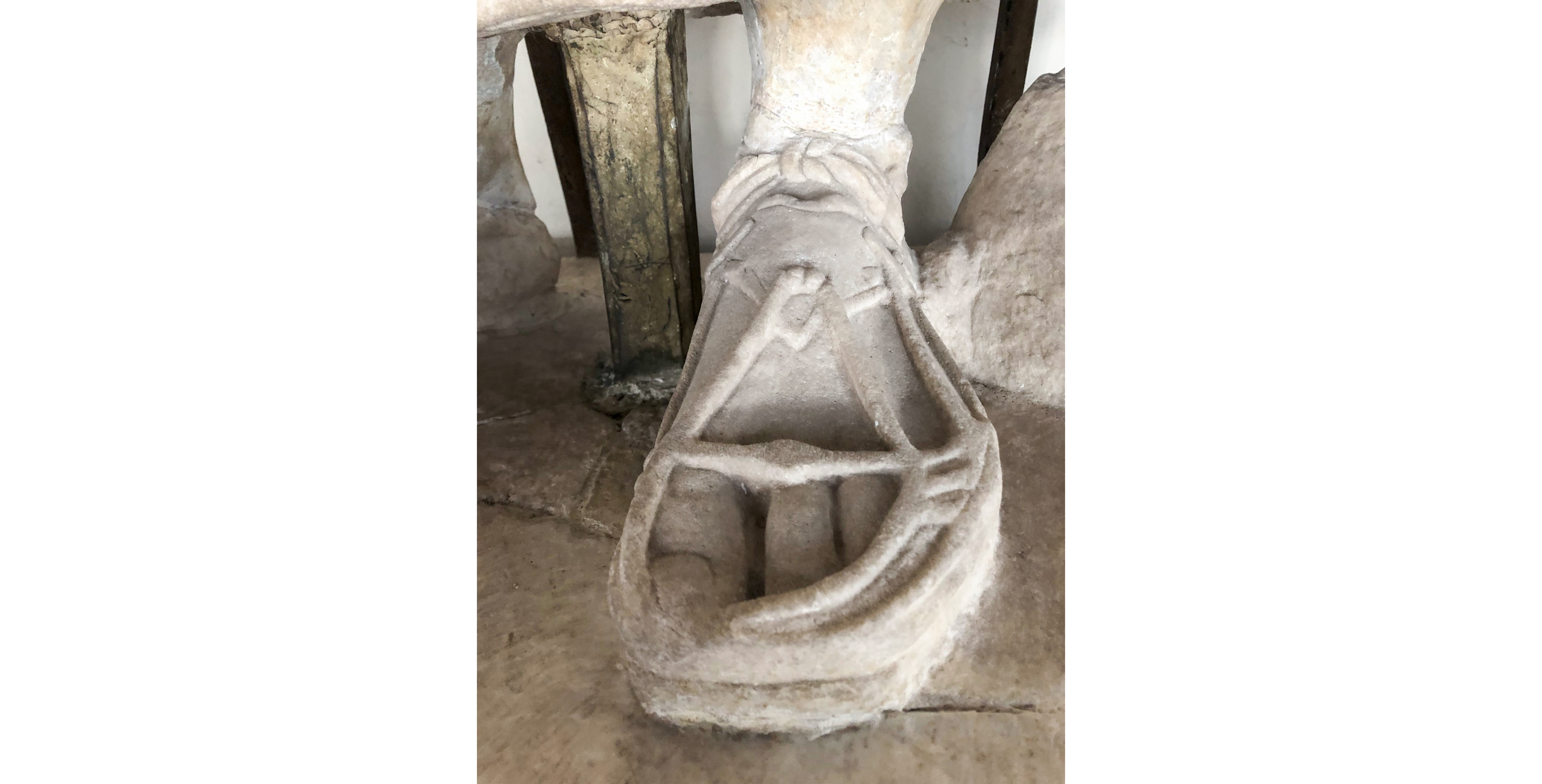 Rome, Museo Nazionale Romano, Terme di DioclezianoA similar example can be identified in the fragment of a marble foot with sandal belonging to the collection of the Baths of Diocletian and today on display at the exhibition “Worn by the Gods”. Here too, the footwear is decorated with a small fig leaf-shaped applique. This work, probably belonging to a female figure, still bears the traces of the red pigment that was applied to colour the sole of the sandal.