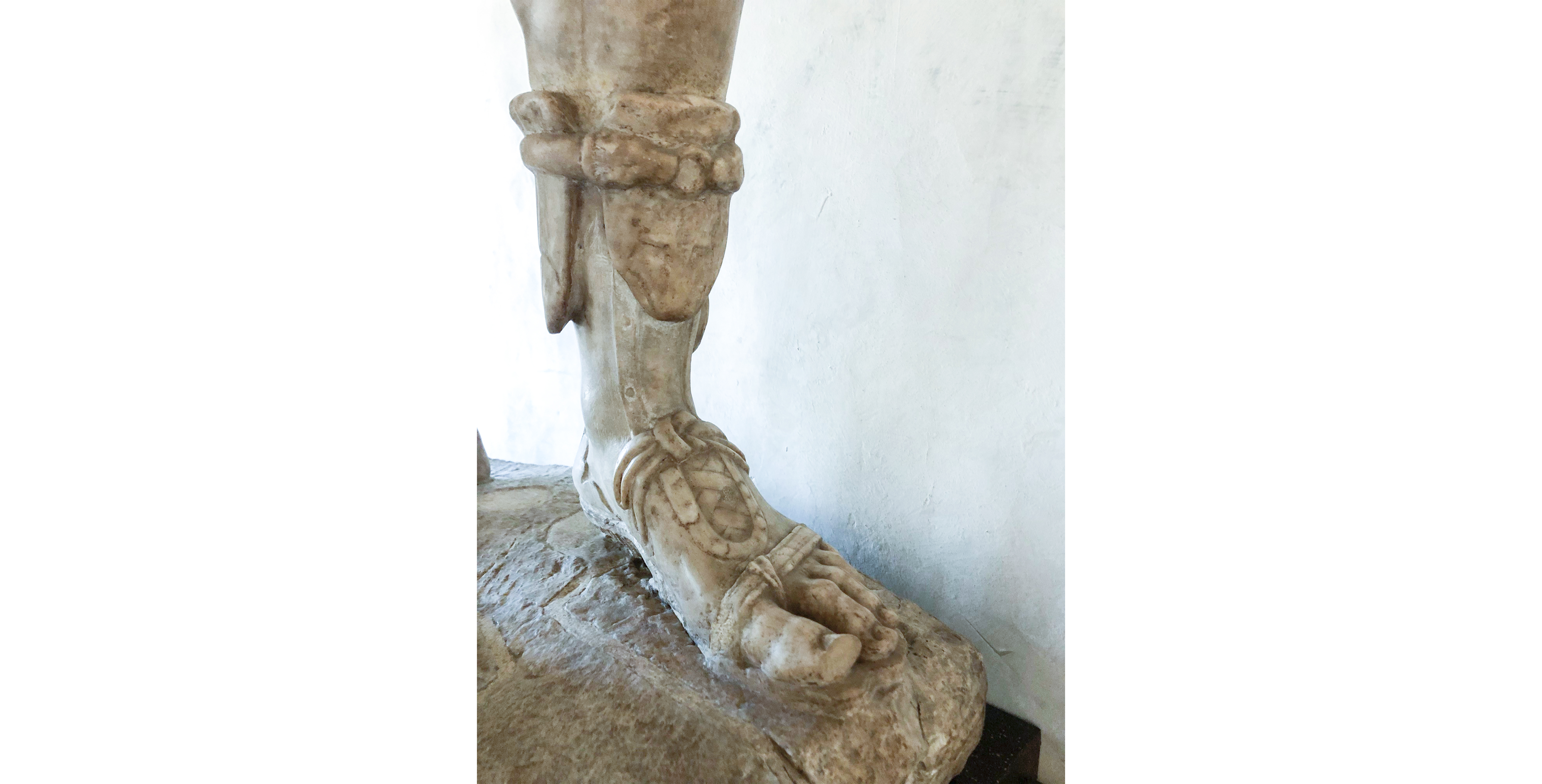 Under the tunic, we can see a pair of long “brache”, a style of trousers peculiar to Barbarian attire, tied at the ankle by the laces of the footwear, here depicted as elegant, closed, lace-up shoes. These, like the rest of the garments worn by the statues, are thought to be part of a luxury style of clothing only worn by high ranking Barbarian characters and therefore they cannot be identified with any of the footwear worn by the Roman citizens.