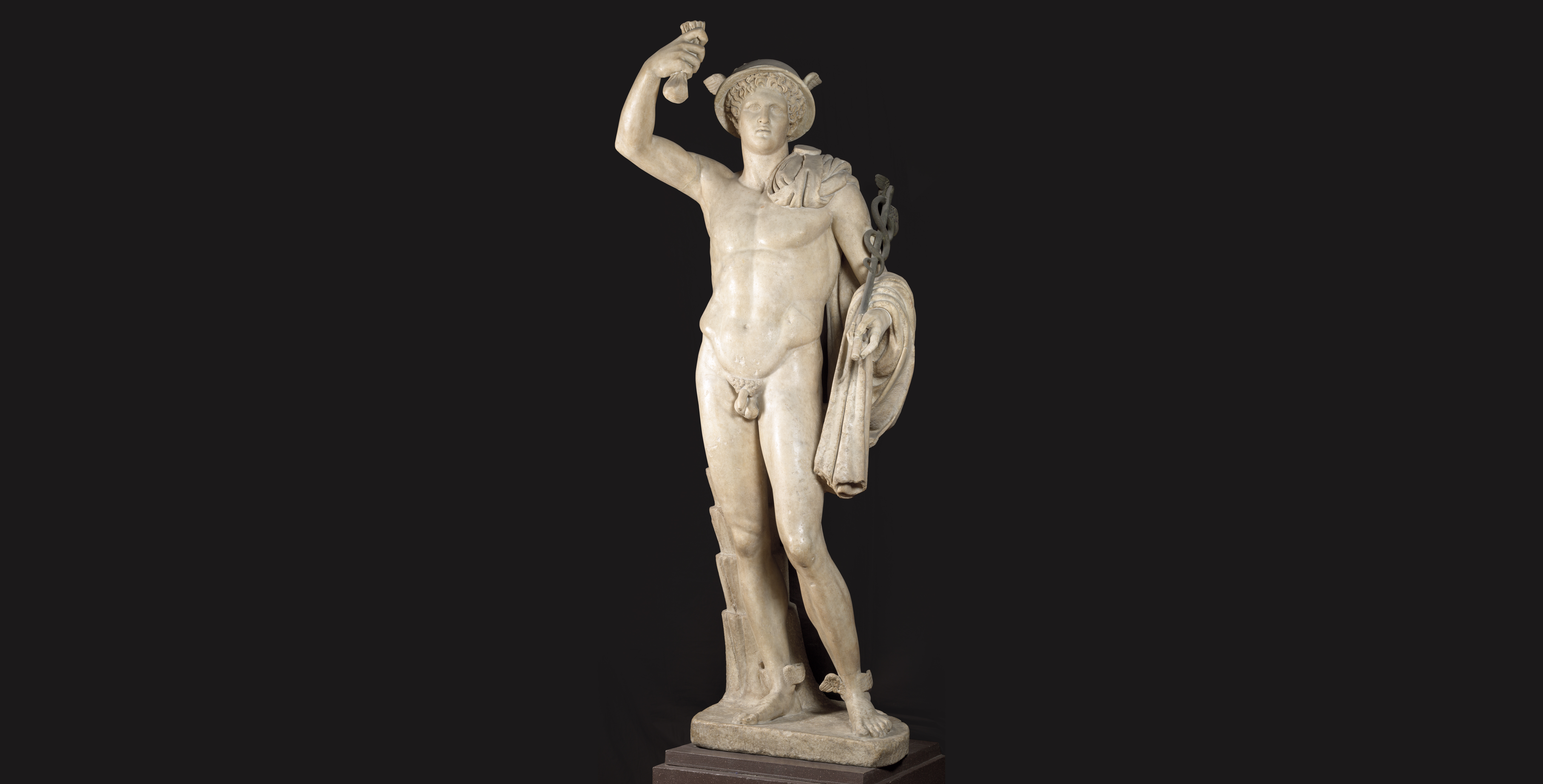 Traditionally, Mercury’s best-known attributes are winged sandals, but in this case the detail of the wings is applied directly onto the figure’s ankles. Three of the four wings present are modern, applied over ancient attachments, while only the one on the inside of the right leg is original. The work, which came to Florence at the end of the 18th century, is a Roman replica - dated to the Antonine dynasty, based on the technique uses to render the drapes of the robe - of a Greek original from the 4th century B.C.