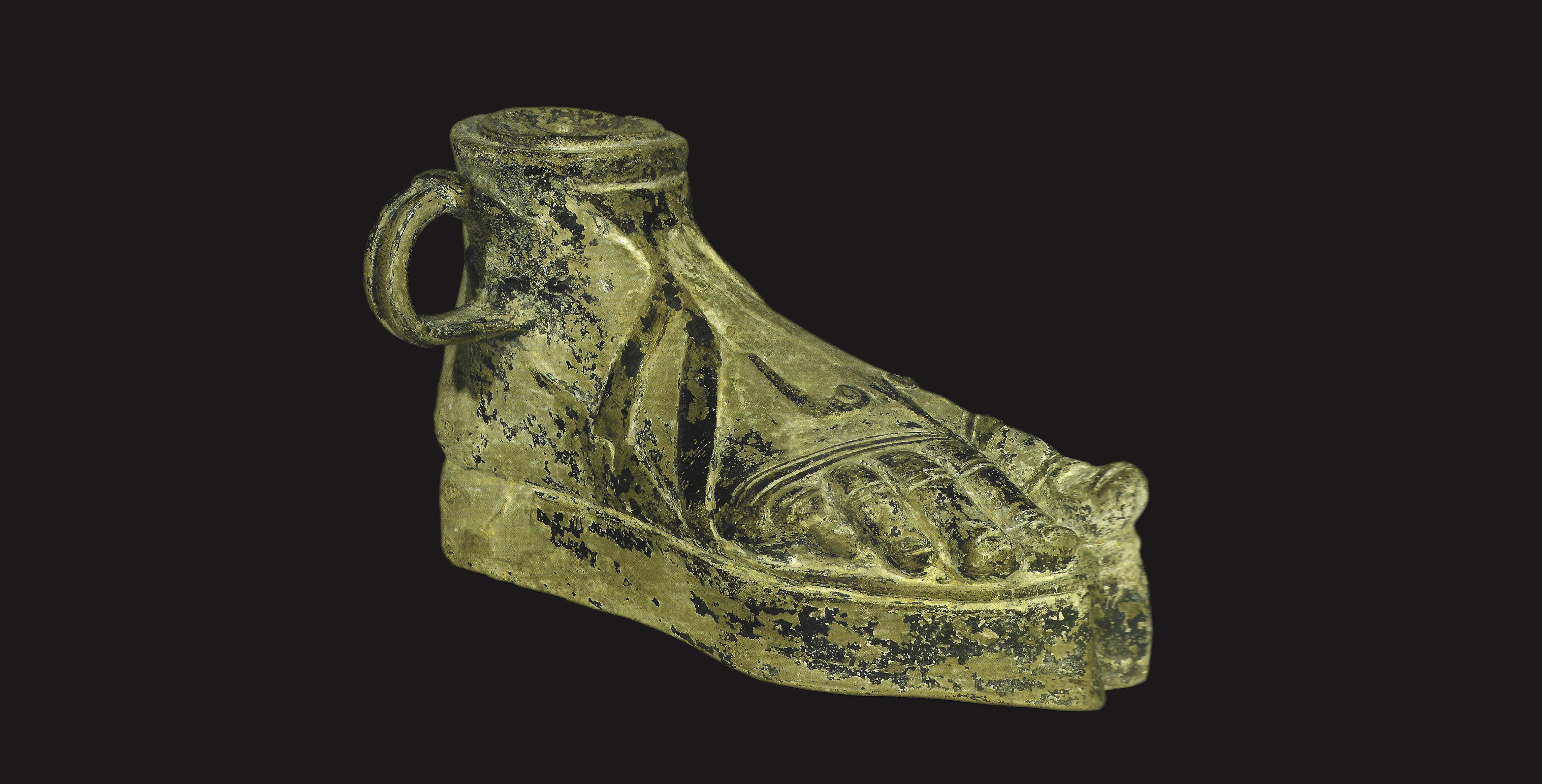 Florence, Museo Archeologico NazionaleAnother example of the variety of styles of sandalia in use in ancient times is provided by the small foot-shaped vase attributed to the 3rd century B.C., characterised by two decorative elements that end in a spiral. The container, probably made in Magna Graecia or by a Siceliot workshop, was designed to hold liquids, and probably used during ritual and religious ceremonies.