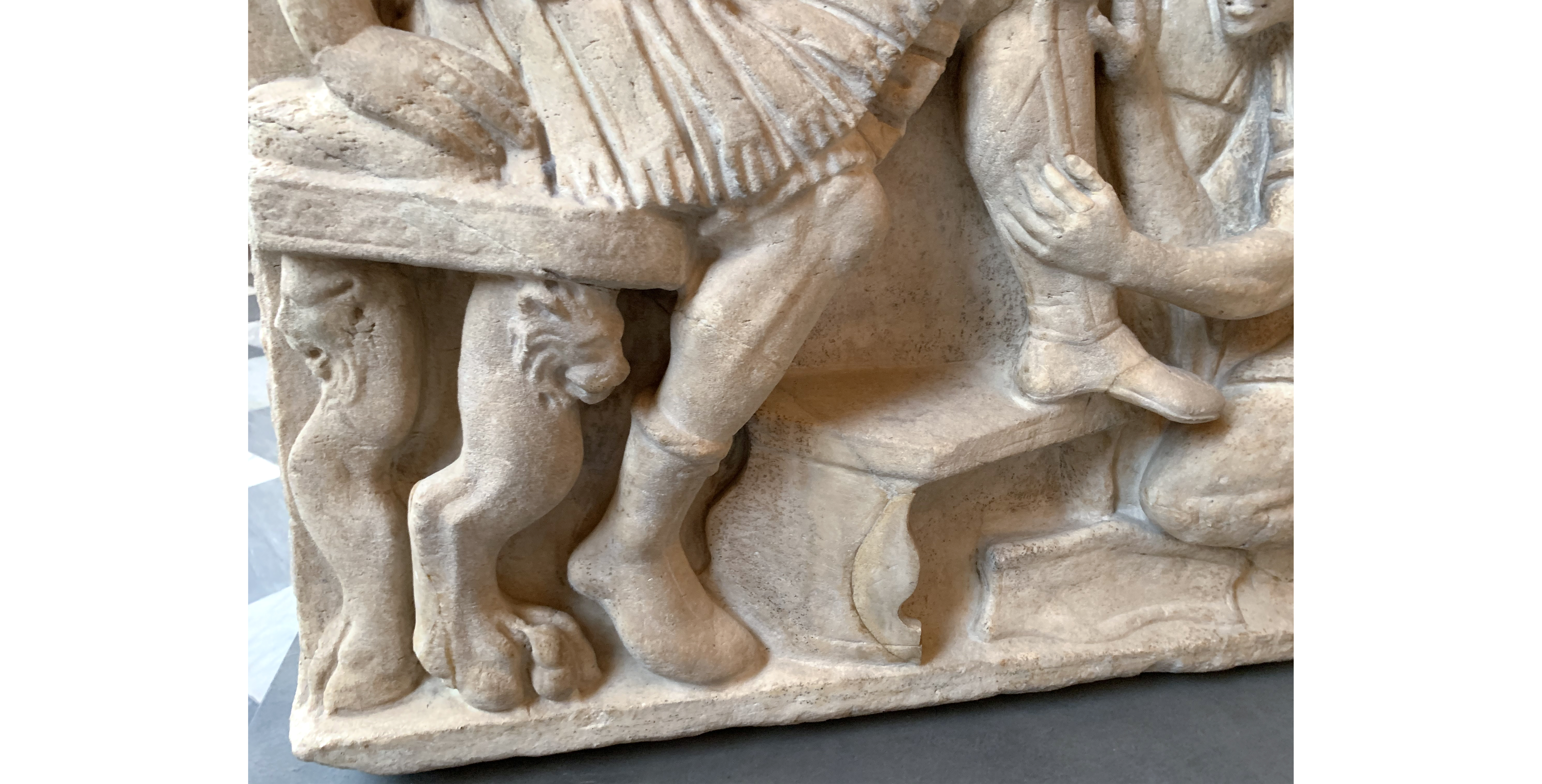 The Romans paid particular attention to their clothing, which had to be appropriate for each situation and context. This aspect is also clear in the sarcophagus of the Roman general, where the clothes change depending on the scene, as does the footwear. Indeed, in the wedding scene, the groom is wearing calcei, the ultimate footwear of Roman citizens. This was a kind of closed boot, which came in different styles depending on the wearer’s social class. In particular, the deceased is wearing a pair of calcei senatorii characterised by two laces tied in a single knot at the ankle.