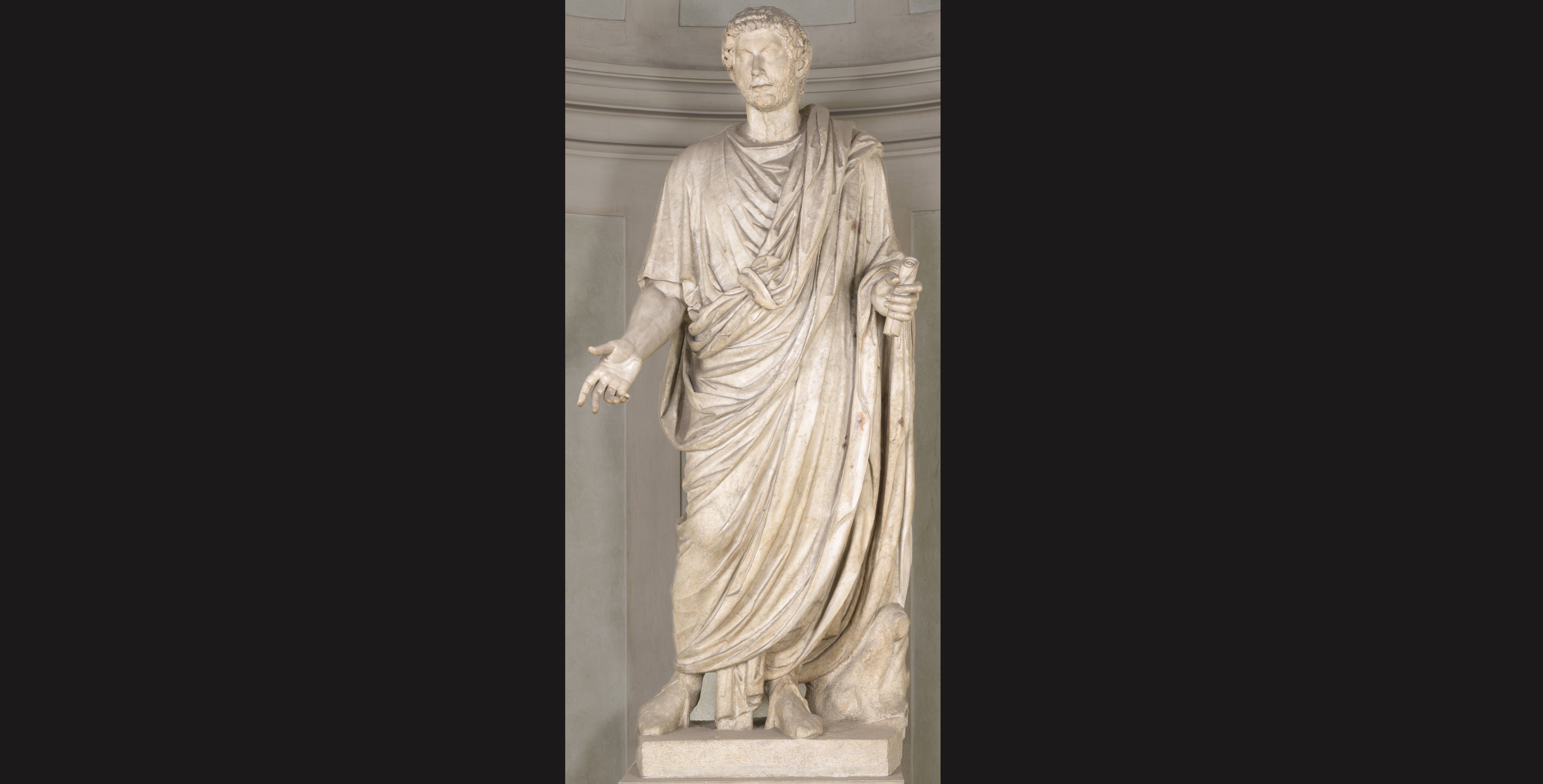Having joined the collection of the Uffizi Gallery in 1788, the work was moved shortly afterwards and relocated in the Boboli Gardens. Following damage caused by adverse weather condition, in 1815 the sculpture was restored, and placed in the Ricetto Lorense of the Gallery. These restoration interventions were probably responsible for changing the head, which is not the original one attached to the body, identified by some 19th century authors as a portrait of the emperor Hadrian. Instead, the portrait appears to date to a later age of the emperor’s reign and has been attributed to the end of the 2nd century A.D.