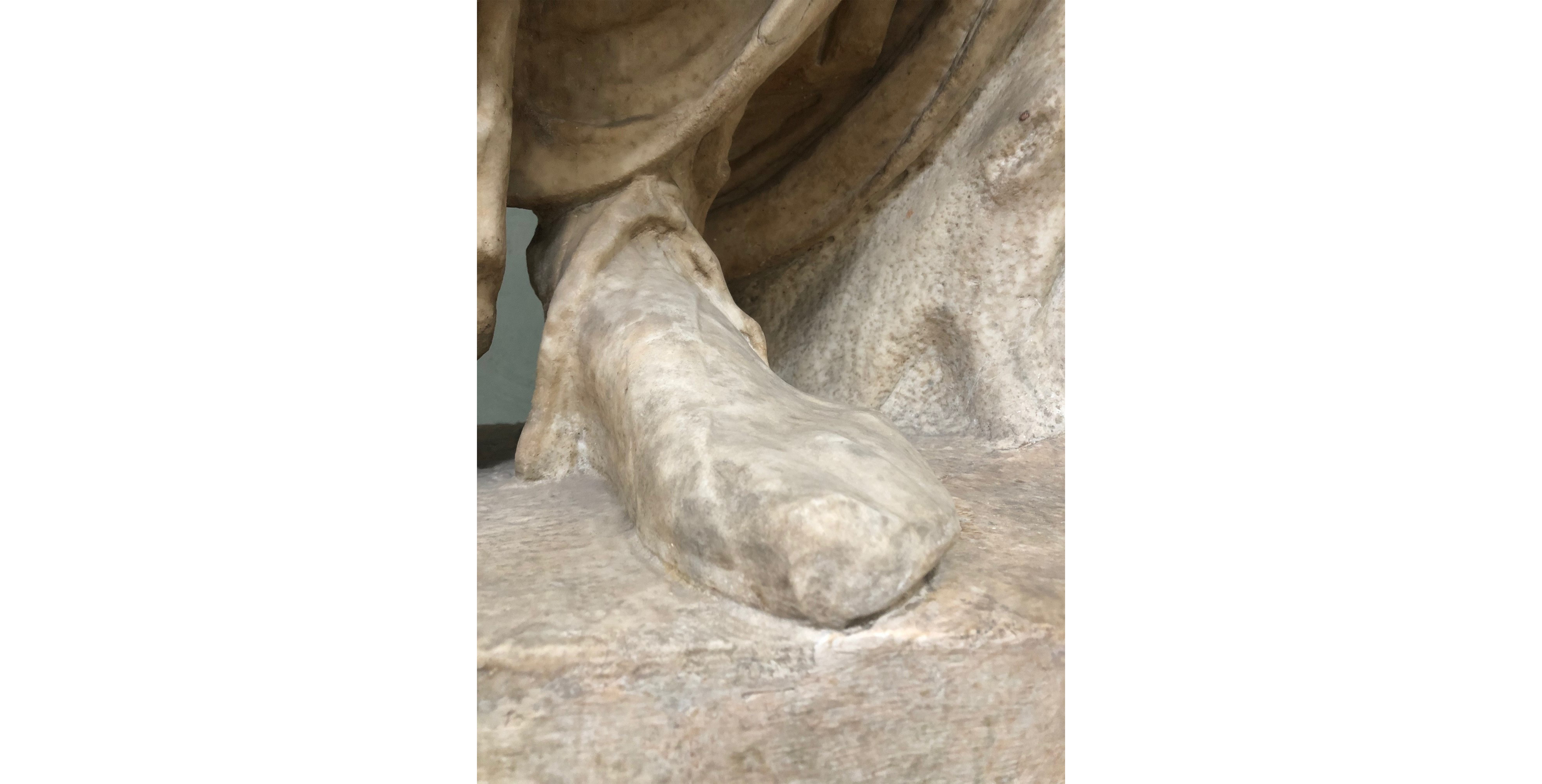 UffiziSome examples of solea or sandalia similar to those worn by the Florentine Demeter can be seen in the exhibition “Worn by the Gods”. One of these is represented by the right foot on the sole of a sandal belonging to the Uffizi Gallery collection, the shape of which shows that it belonged to a mule-driver. In this case too, the lack of detail on the laces is presumably a sign that these were painted on.