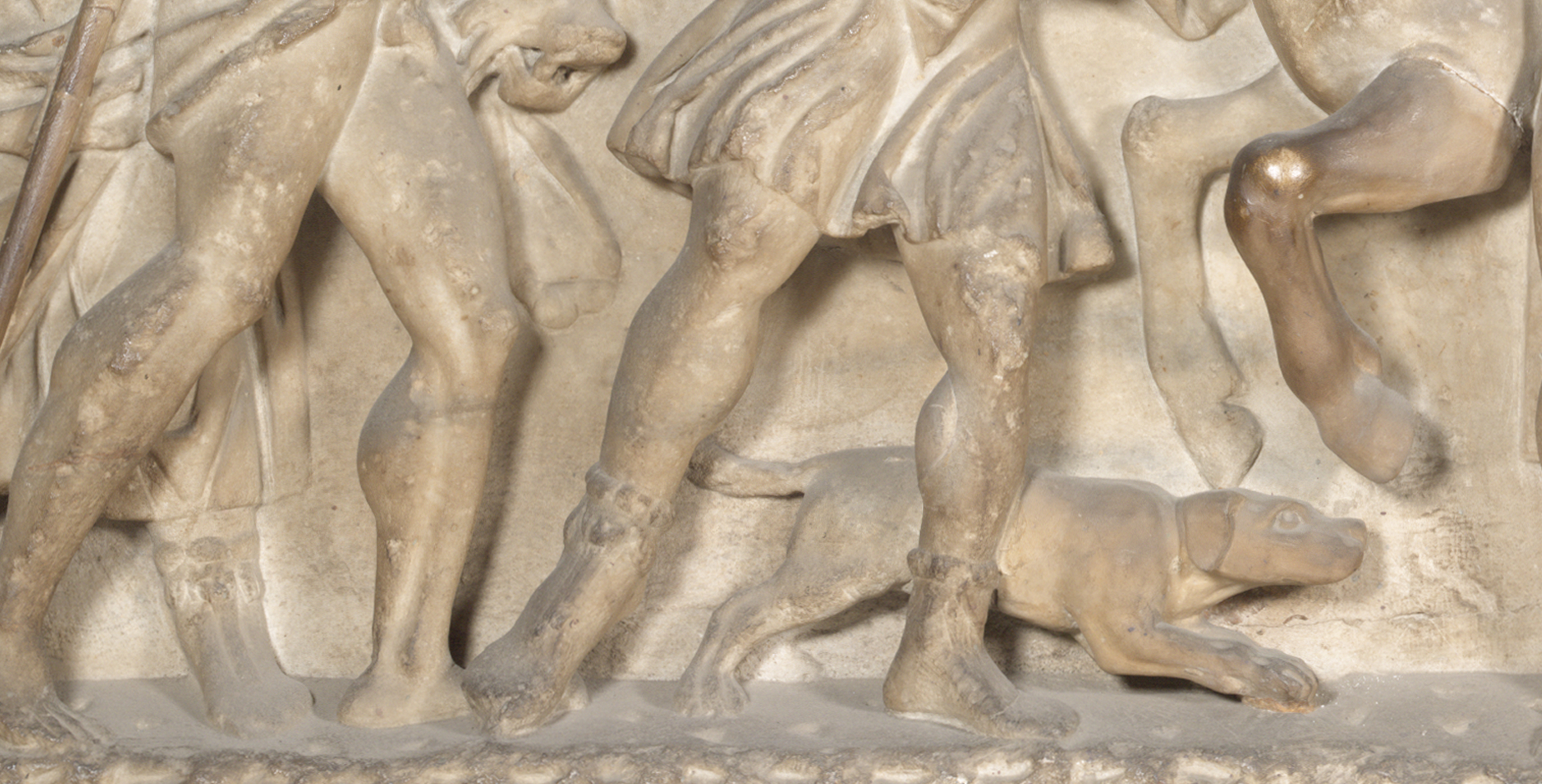 The sarcophagus, of Roman origin, and already present in the villa of Pratolino (FI) from the mid 18th century, was transferred to and exhibited in the Uffizi at the beginning of the 19th century. The monolithic box features a decoration in relief that occupies the front and the short sides. The scene depicted on the front is of the hunt for the legendary wild boar sent by the goddess Artemis to devastate the fields of Calydon; the protagonists are the heroes of the myth, among whom we recognise Meleager in the centre, depicted in the act of killing the boar.