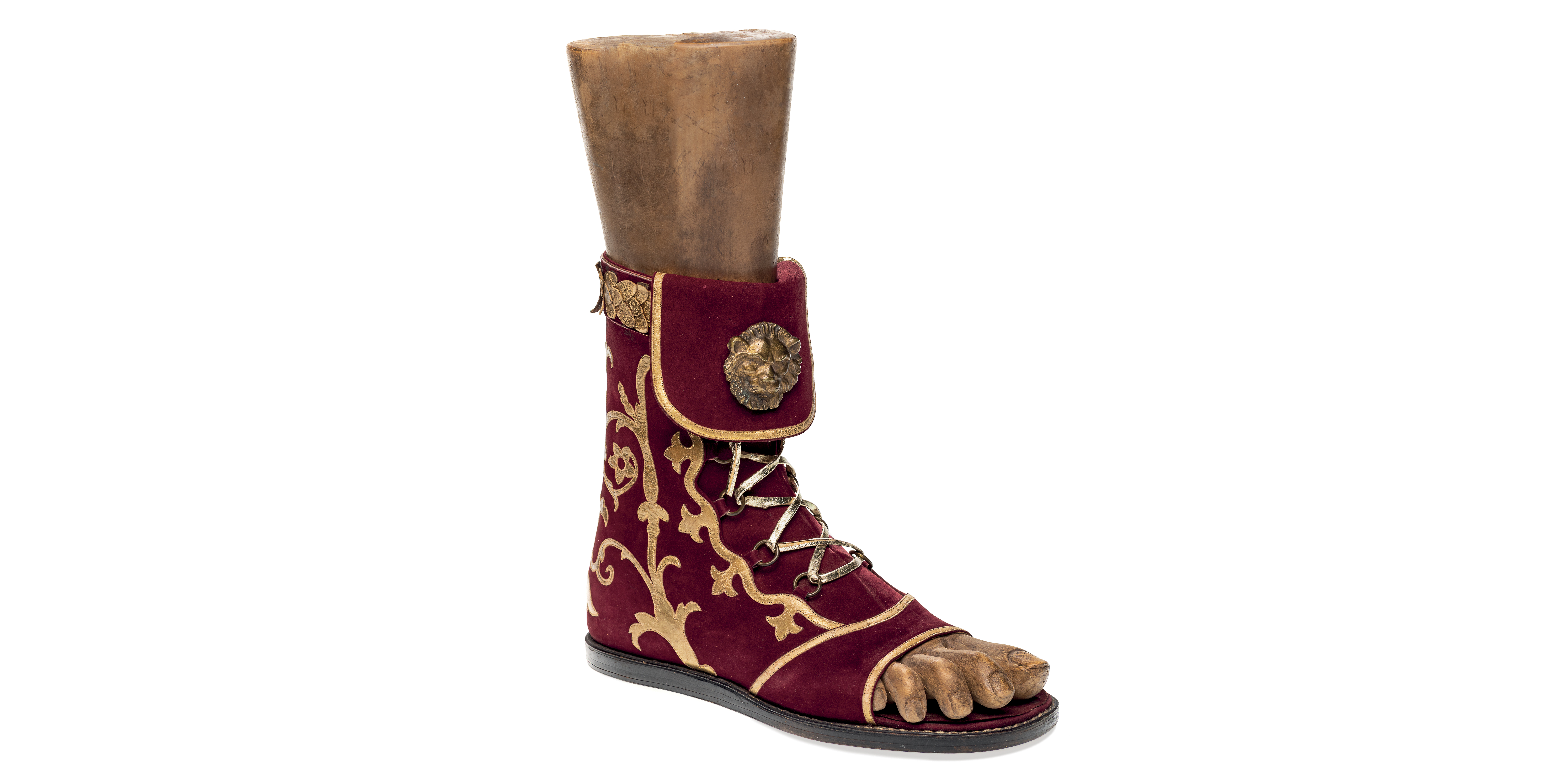 During the twentieth century, thanks to the popular peplum or sword and sandal film genre, the style again became popular, as the footwear of high ranking characters. One example are the mullei of Consul Marcus Vinicius in Quo Vadis, which can be admired in the exhibition “Worn by the Gods” and in which, the designer opted for a metallic applique as the finish on the lion’s head.