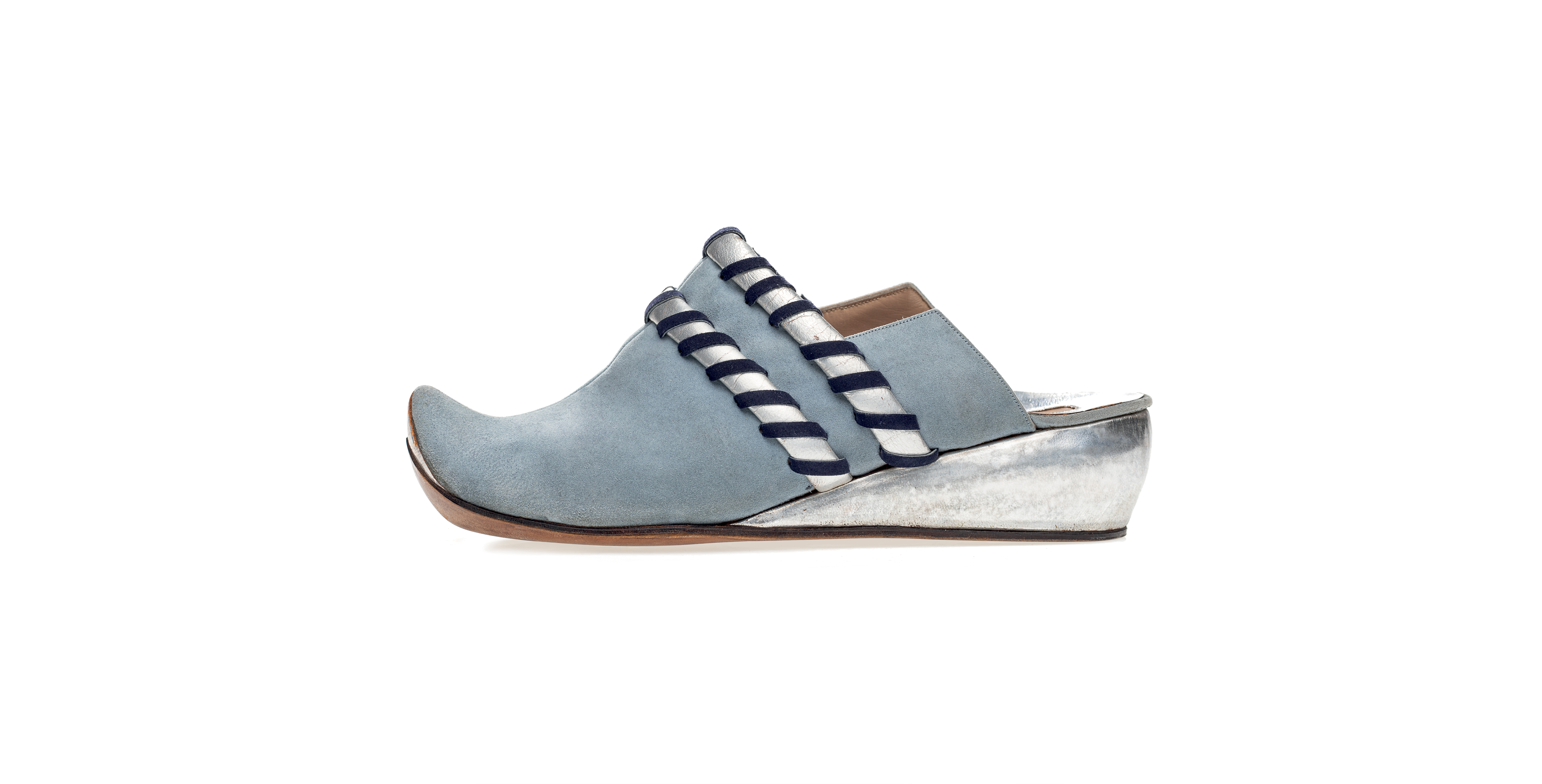In the exhibition “Worn by the Gods”, the Ferragamo chopine, with its closed, soft style, is the exhibit that most resembles the footwear of the Muse. The upturned toe, undoubtedly a detail of oriental inspiration, is also reminiscent of another ancient style, the akation.
