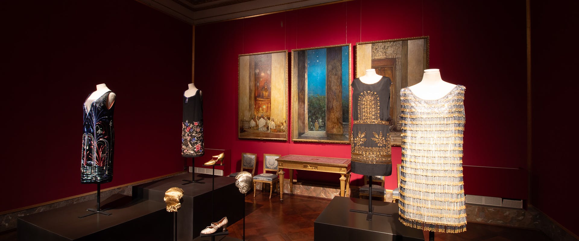 Il primo dei nuovi spazi, dedicato alla ‘Moda Charleston’ tra avanguardie ed esotismo, apre la nuova selezione: lo straordinario Trittico di Galileo Chini trasforma la sala in un set scenografico di pucciniana memoria con l’abito indossato dalla moglie del pittore in occasione della prima di Turandot al Teatro La Scala di Milano il 25 aprile 1926. Altri abiti preziosi realizzati con sete pregiate arricchiti da motivi decorativi ispirati alla Cina, al Giappone e all’India rammentano come l’orientalismo si intrecciasse con il desiderio di emancipazione e sperimentazione tipico delle flapper, giovani donne dell’epoca che rompevano con la tradizione.