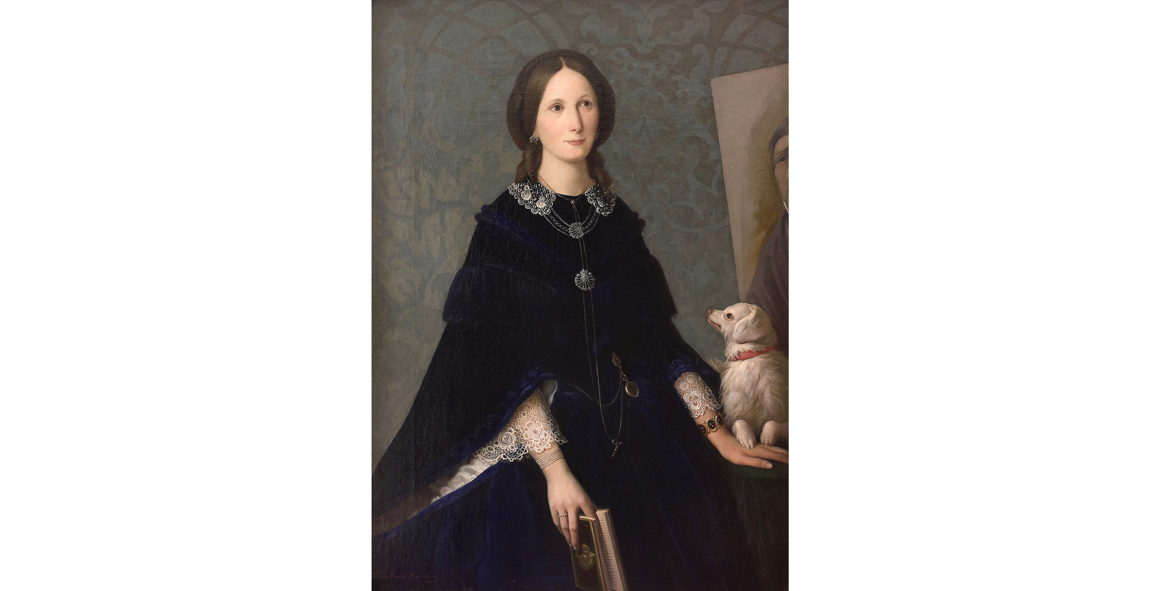 Ella si presenta in una posa disinvolta, in compagnia dell’amata canina Lalla, consegnata alla storia come il cagnolino Flush di Elisabeth Barret Browning, mentre si intravede sulla destra un abbozzo di ritratto, presumibilmente quello paterno, a sancire i suoi grandi affetti. Sappiamo che ella si esercitava nel disegno e nella pittura di illustri maestri come ne attestano le lettere che dimostrano una protratta familiarità con l’ambiente artistico fiorentino e toscano.