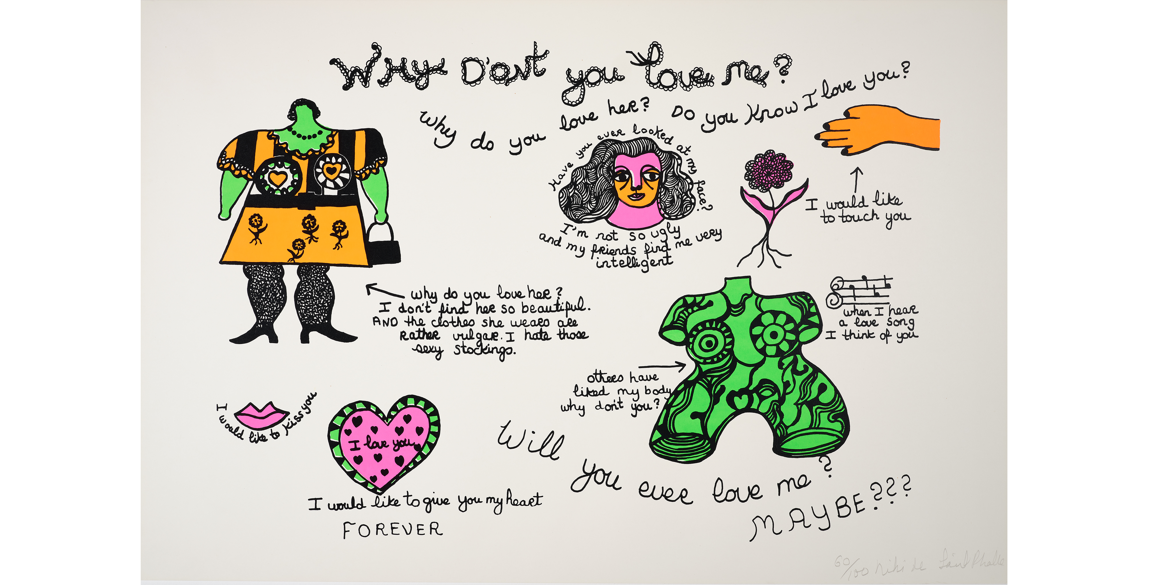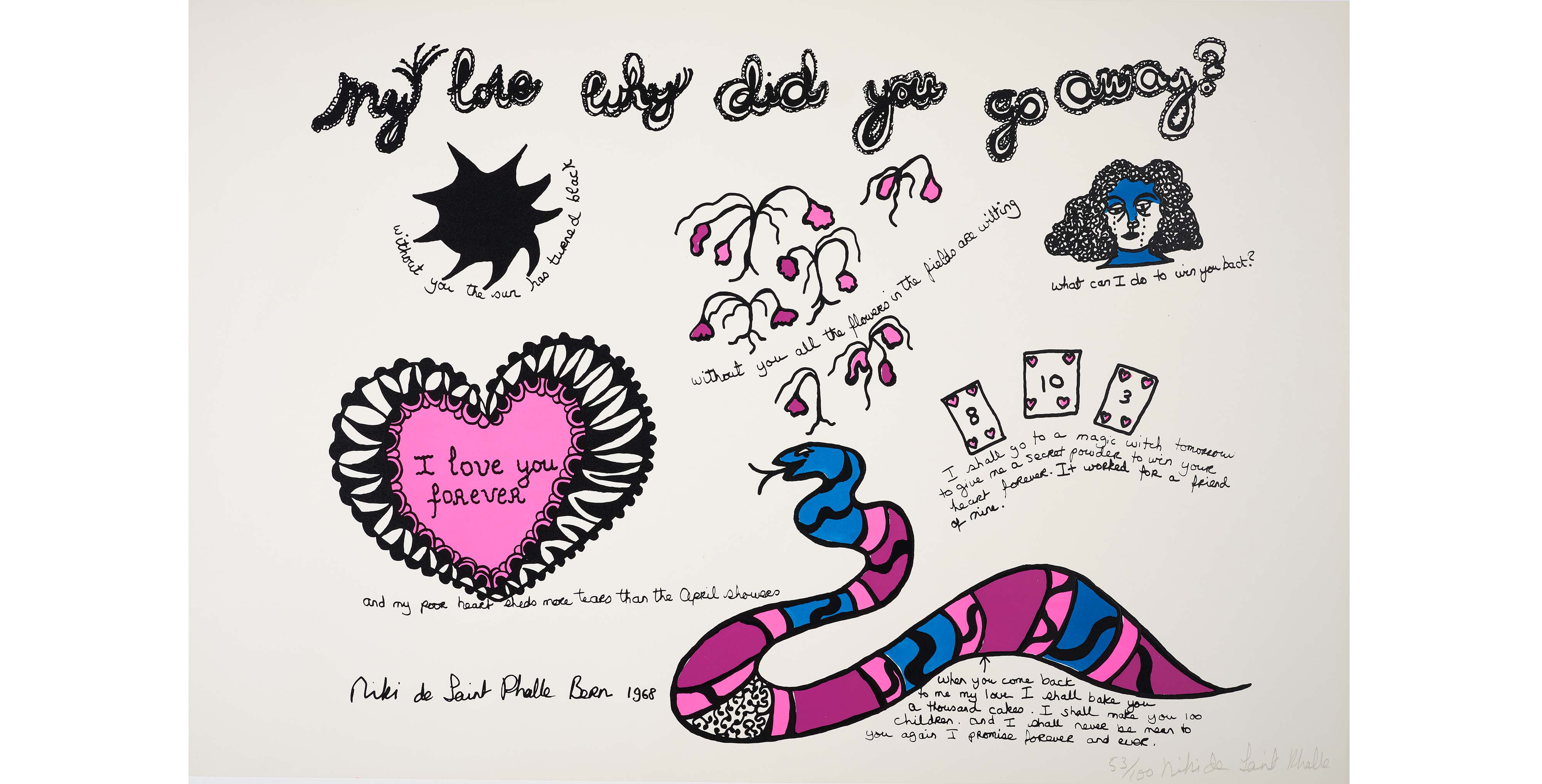 “Nelle mie scelte ho sempre usato il mio istinto più che la mia ragione, e molto spesso le mie scelte si sono rivelate giuste.” L’istinto aveva condotto Niki a cercare la gioia, l’amore, il sogno. La sua arte, che nasce come sfogo di un’anima tormentata, virò verso la vita, il gioco, il colore. Nelle due serigrafie agli Uffizi sono concentrati alcuni elementi del suo immaginario poetico. Niki traccia bizzarre e gioiose figure dai colori brillanti e iridescenti. Echi delle sue Nanas, e poi cuori, carte e un serpentello, accompagnando ogni disegno con i versi di una poesia che chiede e promette amore eterno.