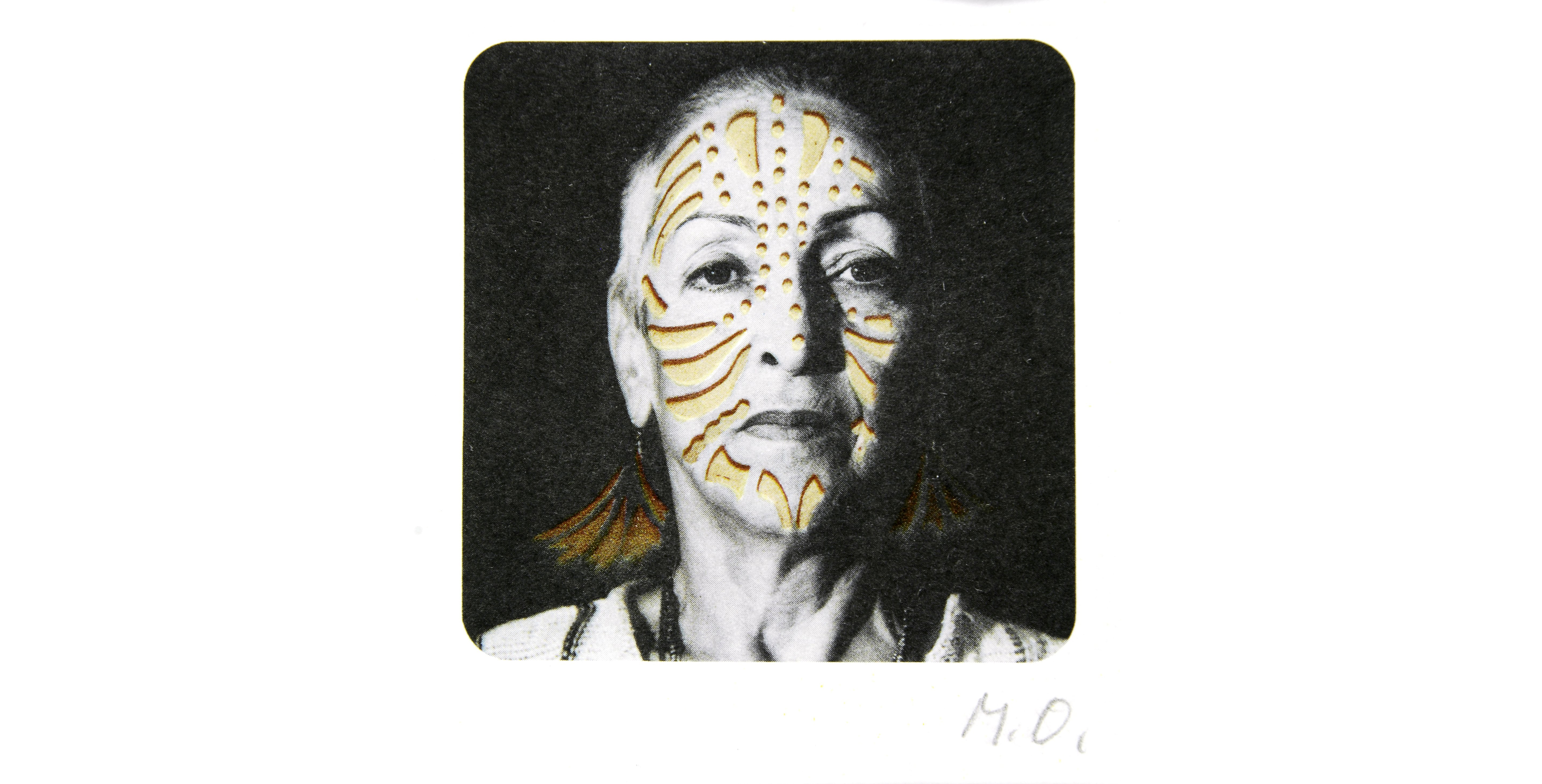 propriamente partecipe della cultura surrealista del tempo, continua tutt’oggi a veicolare con forza un richiamo alla condizione di subalternità del sesso femminile.Con altre opere e performance sconcertanti e trasgressive come e più di queste (sono celebri le serie di fotografie a soggetto erotico realizzate da Man Ray), anche a seguito dei difficili anni vissuti durante il periodo nazista e la seconda guerra mondiale, la Oppenheim continua a utilizzare il proprio corpo per riflettere sulla propria condizione di essere umano e di artista. Come era stato già mezzo secolo prima, il suo corpo diviene il foglio su cui raccontare una storia. In questo celebre autoritratto fotografico, replicato in numerose serie a stampa, l’artista, ormai giunta alla fine della sua lunga carriera, anziché nasconderli, enfatizza gli inevitabili segni lasciati sul suo volto dal passare del tempo, connotandoli con linee vivacemente colorate che richiamano tatuaggi tribali. L’artista si offre al nostro sguardo, nella sua età più matura, in veste sacrale di sacerdotessa, che con sguardo magnetico si auto-proietta in una dimensione spazio temporale perenne.
