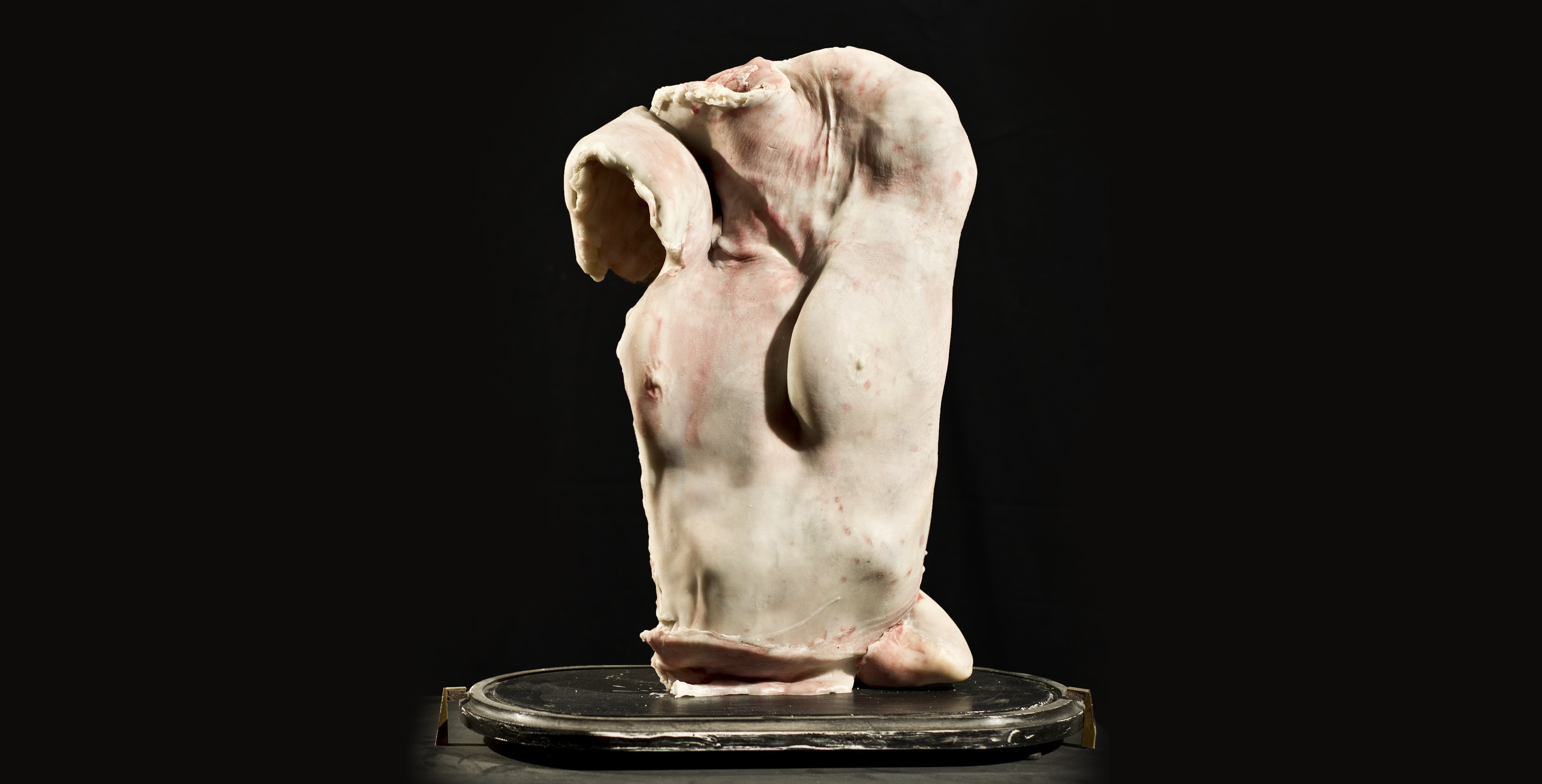 In questo toccante autoritratto, la Bruyckere si presenta sotto una campana di vetro, a mo’ di sacra reliquia, a sottolineare la necessità di protezione che questa donna sembra domandare: con la puntuale resa anatomica della pelle livida, macchiata da schizzi di vernice rosso vivo, e con l’alternanza di pieni e di vuoti che compongono questo busto stropicciato e teso, l’artista rende concreta la propria tensione emotiva e ci trasmette un senso di disagio e vulnerabilità, nel quale empaticamente siamo portati a immedesimarci.