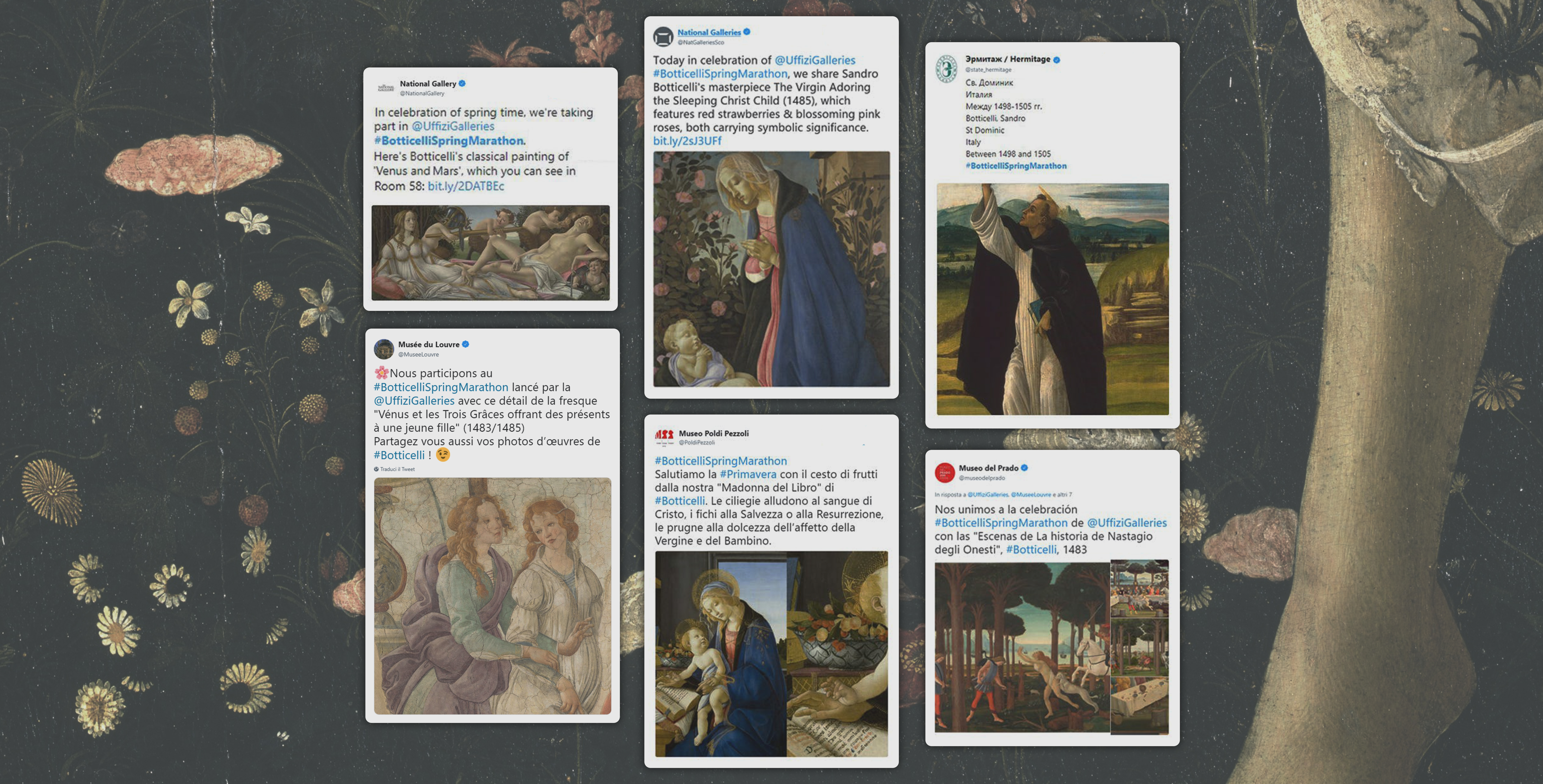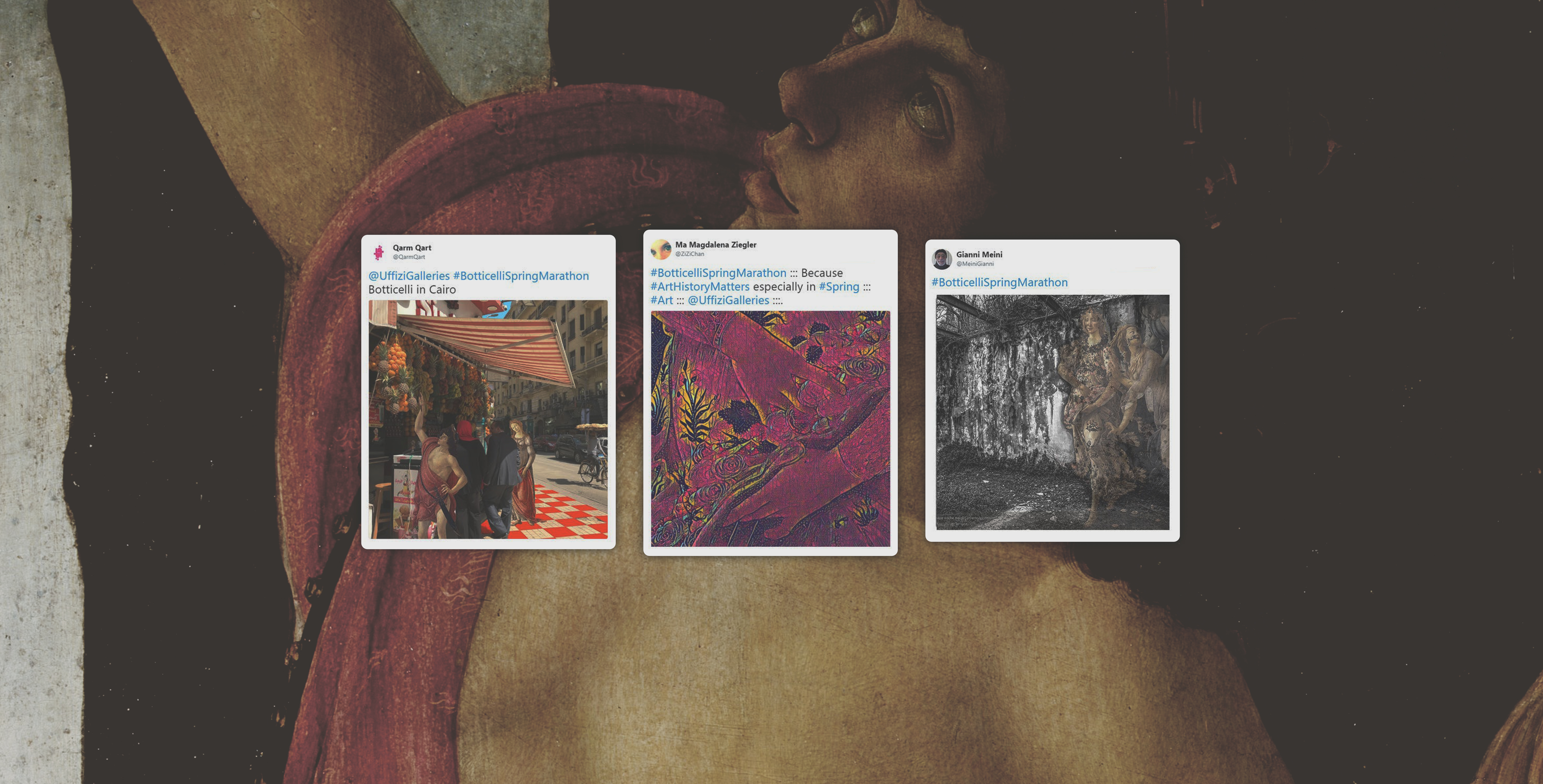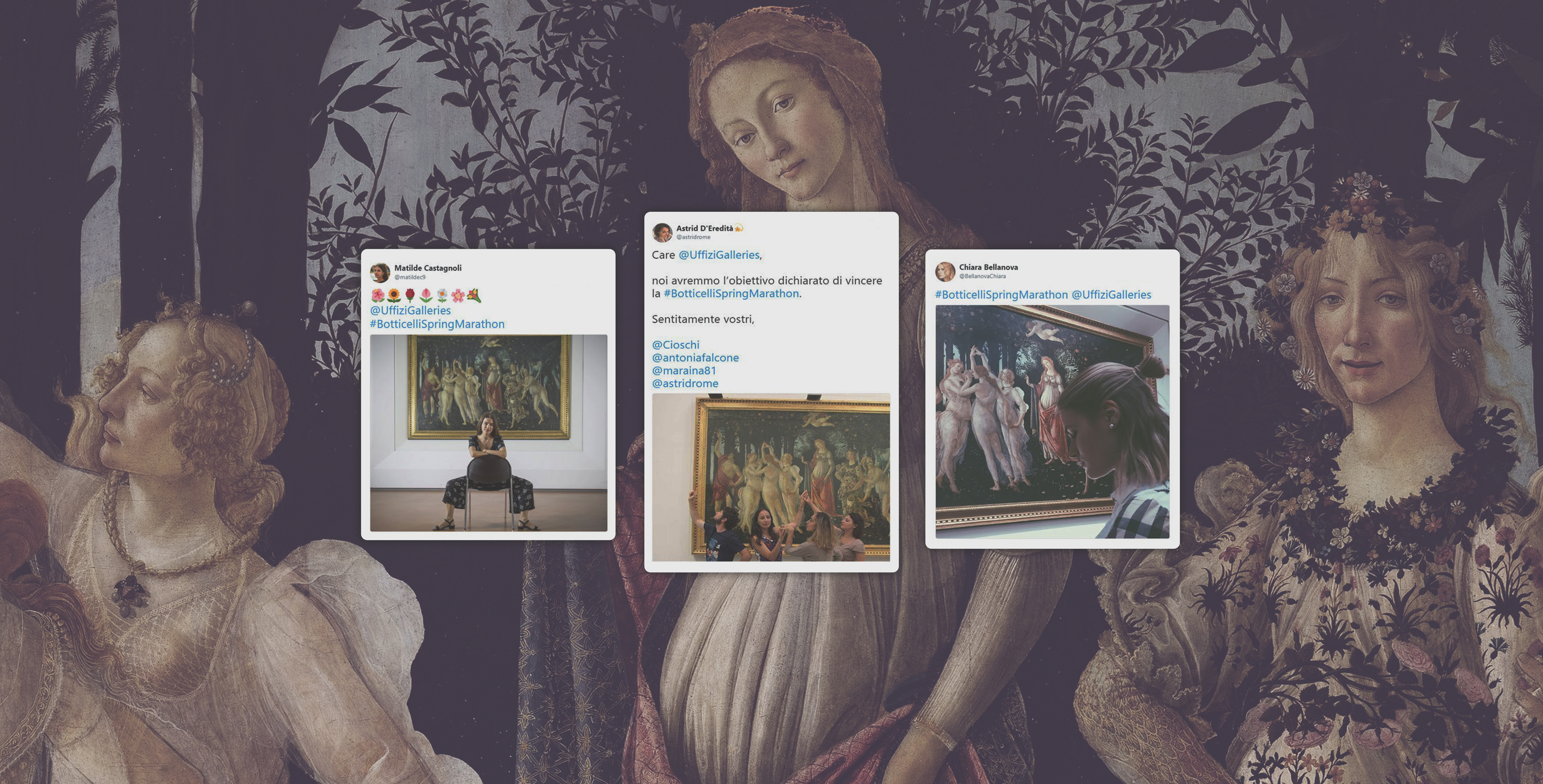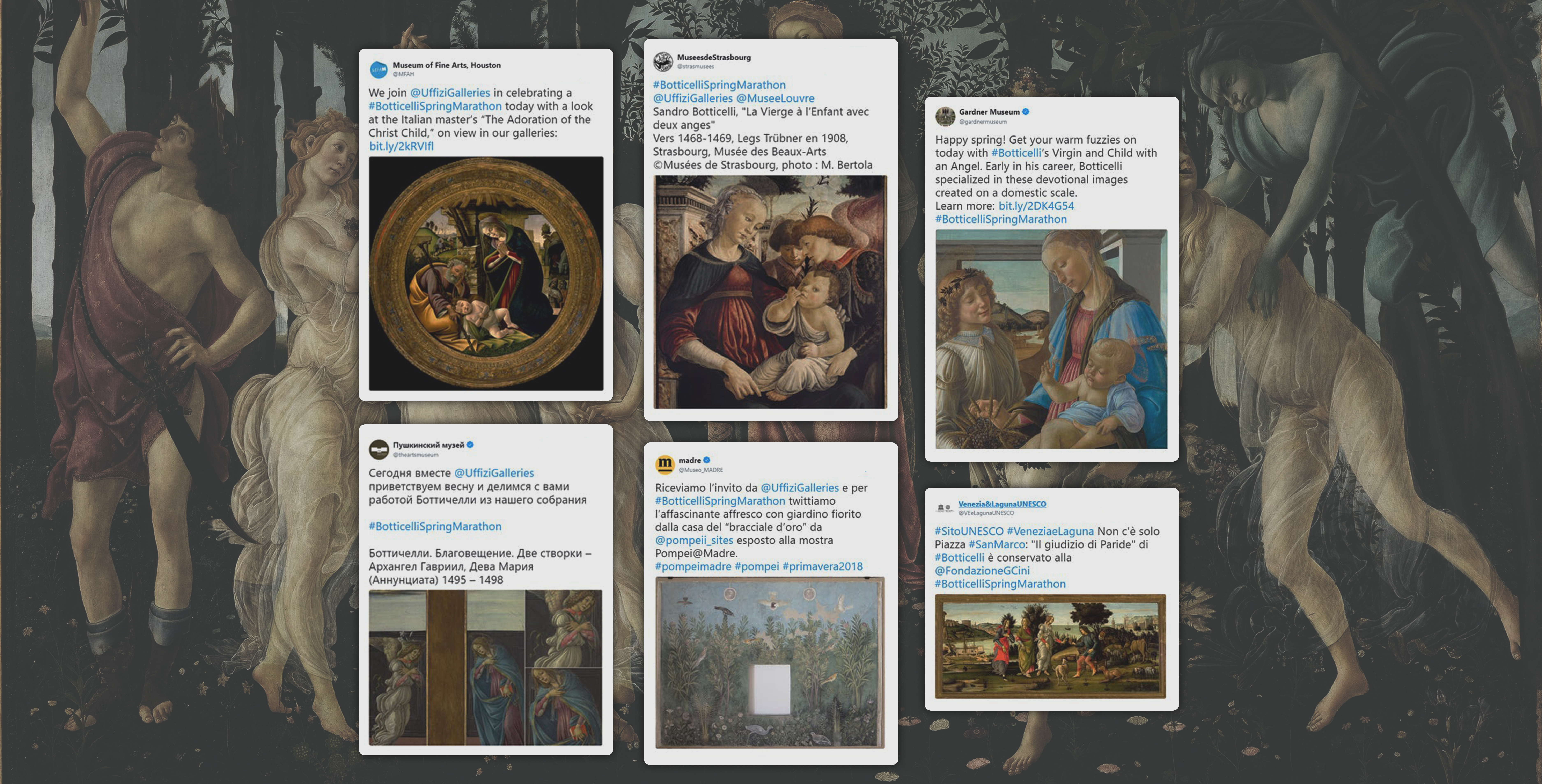 Il 21 marzo 2018 il Dipartimento di Comunicazione Digitale delle Gallerie degli Uffizi ha lanciato una campagna internazionale su Twitter intitolata #BotticelliSpringMarathon in cui ha invitato i follower e i più grandi musei del mondo che conservano opere di Botticelli a condividere sul profilo degli Uffizi un saluto all’arrivo della primavera nel segno dell’arte del grande Maestro fiorentino. All’iniziativa è stato associato un vero e proprio contest fotografico, una maratona digitale di una settimana dove è stato chiesto ai visitatori degli Uffizi e agli utenti online da ogni parte del mondo di inviare sull’account @UffiziGalleries la “propria” visione di una delle opere più iconiche della collezione del museo, oggetto di una vera e propria forma di venerazione: La Primavera di Botticelli. In poche ore la campagna è diventata virale, ne hanno parlato i social e la stampa, è rimbalzata in tutto il mondo fregiandosi anche della partecipazione di grandissimi musei che hanno deciso di omaggiare l’iniziativa degli Uffizi pubblicando dettagli a tema primaverile tratti dai loro capolavori di Botticelli esposti: il Louvre, il Prado, la National Gallery di Londra, il Museo Puškin, l’Hermitage, la National Gallery di Edimburgo, il Museo Isabella Stewart-Gardner, il Museo di Houston, il Museo di Strasburgo e gli italiani Museo Poldi Pezzoli e Fondazione Giorgio Cini sono stati i musei che hanno risposto con entusiasmo e simpatia alla “festa di Primavera digitale” degli Uffizi.