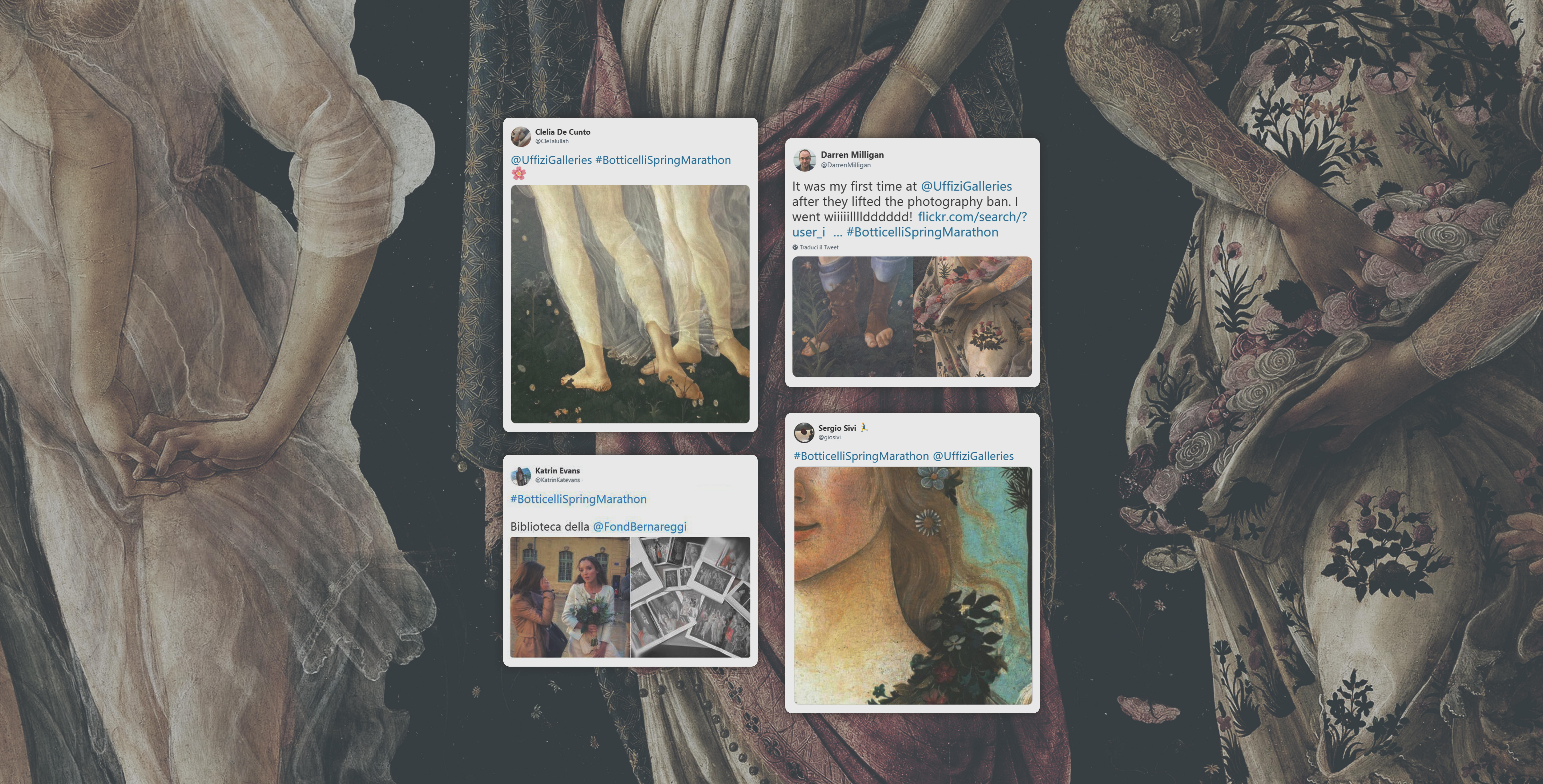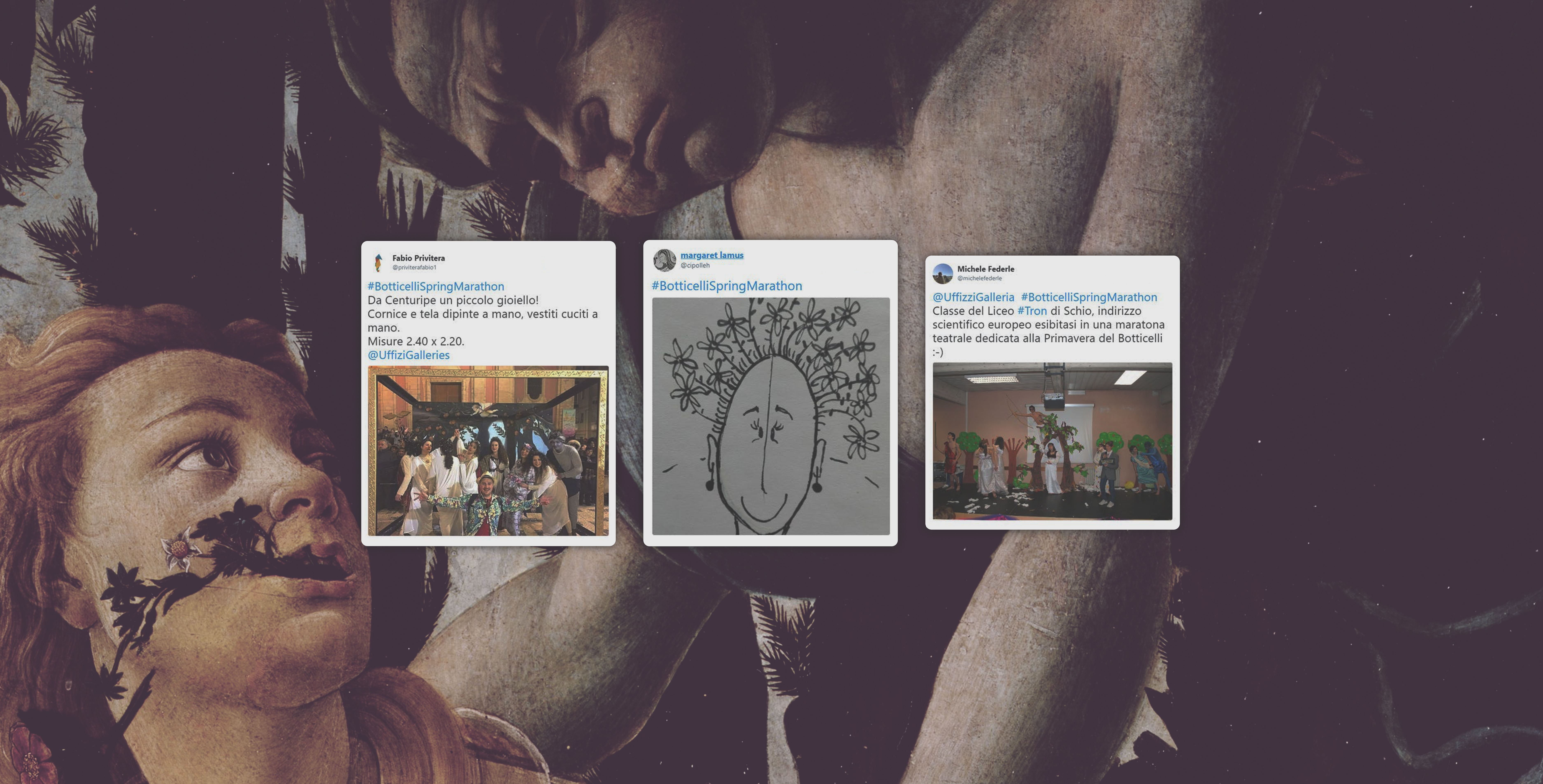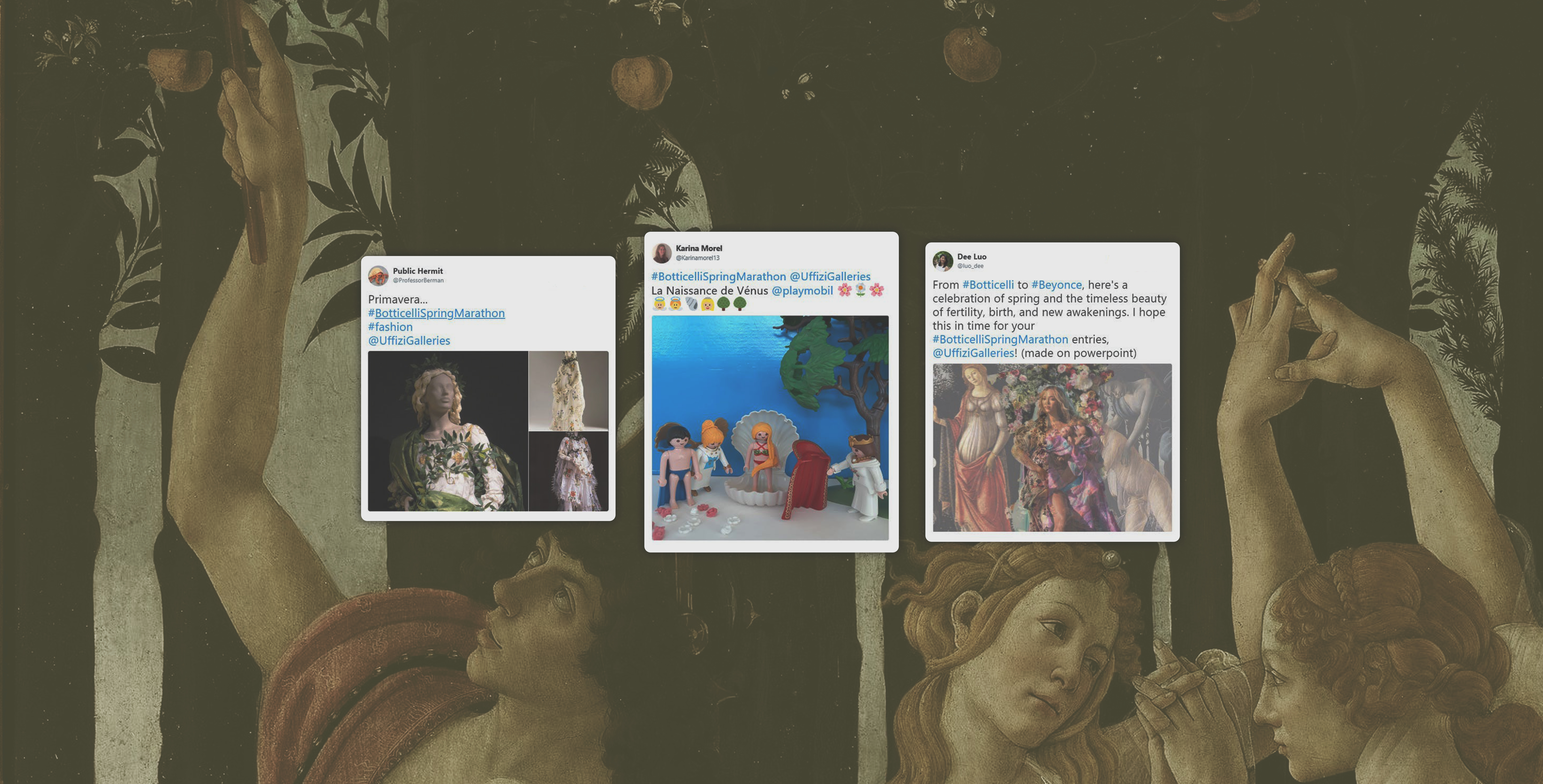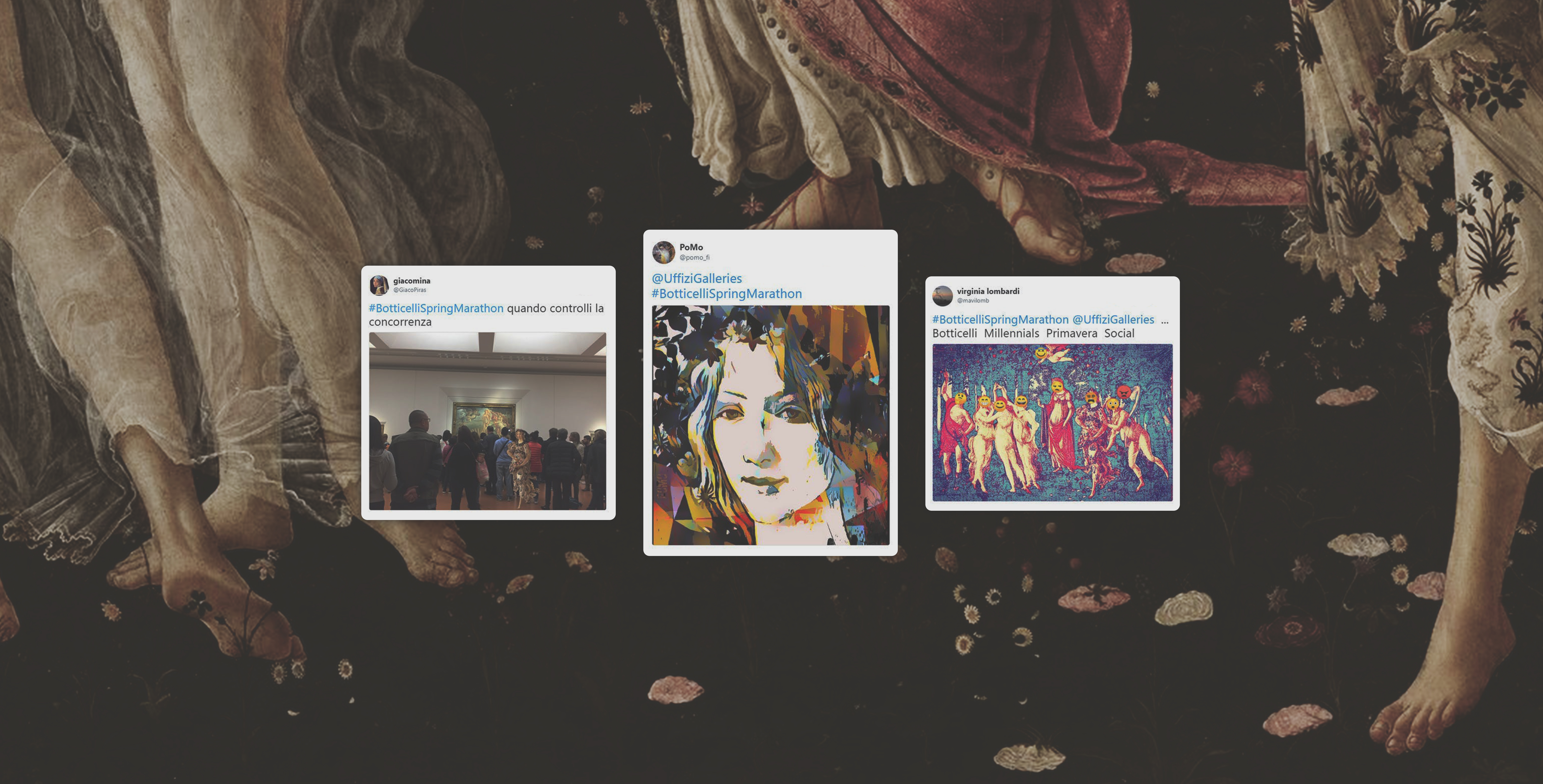Il 21 marzo 2018 il Dipartimento di Comunicazione Digitale delle Gallerie degli Uffizi ha lanciato una campagna internazionale su Twitter intitolata #BotticelliSpringMarathon in cui ha invitato i follower e i più grandi musei del mondo che conservano opere di Botticelli a condividere sul profilo degli Uffizi un saluto all’arrivo della primavera nel segno dell’arte del grande Maestro fiorentino. All’iniziativa è stato associato un vero e proprio contest fotografico, una maratona digitale di una settimana dove è stato chiesto ai visitatori degli Uffizi e agli utenti online da ogni parte del mondo di inviare sull’account @UffiziGalleries la “propria” visione di una delle opere più iconiche della collezione del museo, oggetto di una vera e propria forma di venerazione: La Primavera di Botticelli. In poche ore la campagna è diventata virale, ne hanno parlato i social e la stampa, è rimbalzata in tutto il mondo fregiandosi anche della partecipazione di grandissimi musei che hanno deciso di omaggiare l’iniziativa degli Uffizi pubblicando dettagli a tema primaverile tratti dai loro capolavori di Botticelli esposti: il Louvre, il Prado, la National Gallery di Londra, il Museo Puškin, l’Hermitage, la National Gallery di Edimburgo, il Museo Isabella Stewart-Gardner, il Museo di Houston, il Museo di Strasburgo e gli italiani Museo Poldi Pezzoli e Fondazione Giorgio Cini sono stati i musei che hanno risposto con entusiasmo e simpatia alla “festa di Primavera digitale” degli Uffizi.