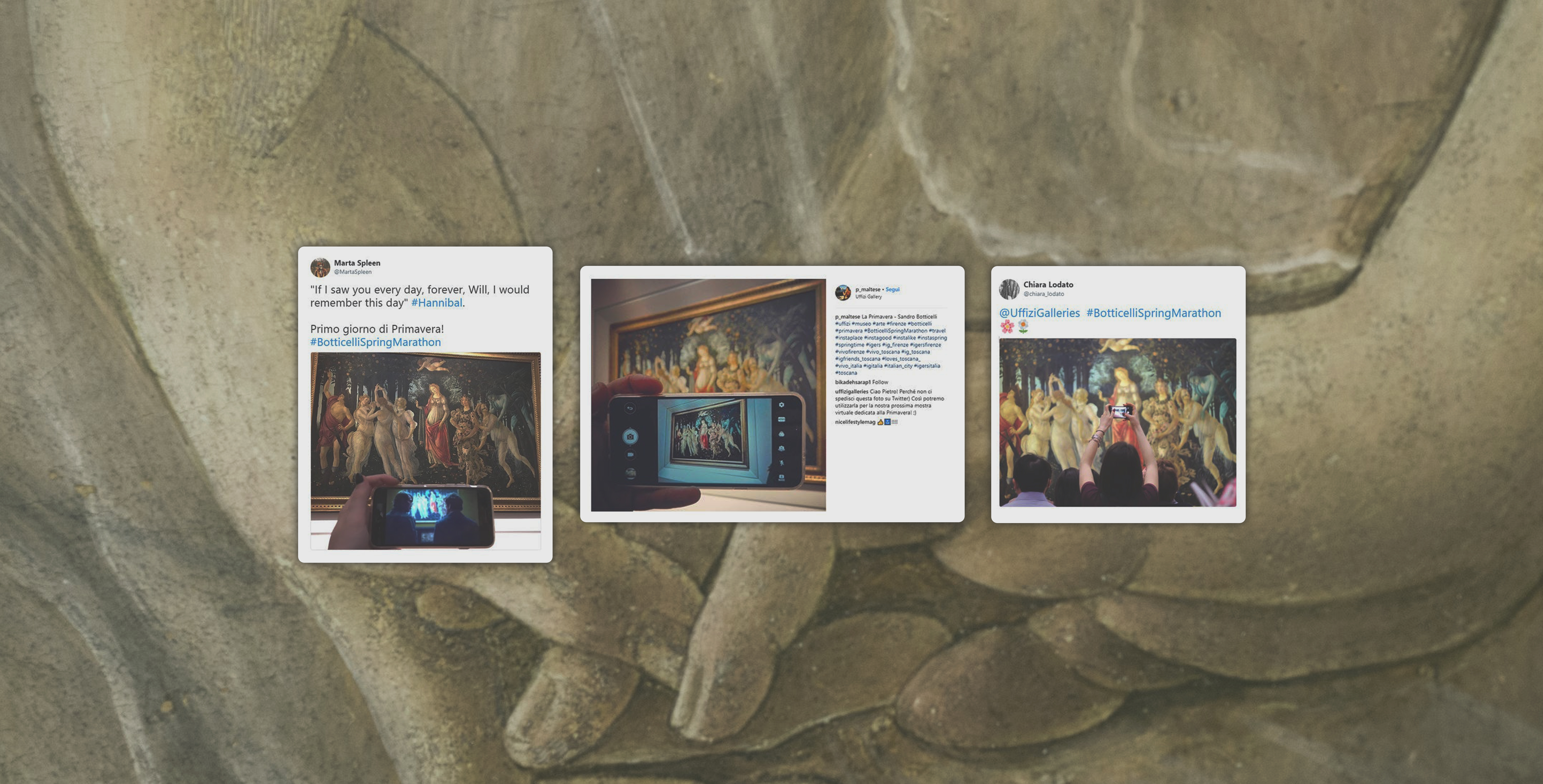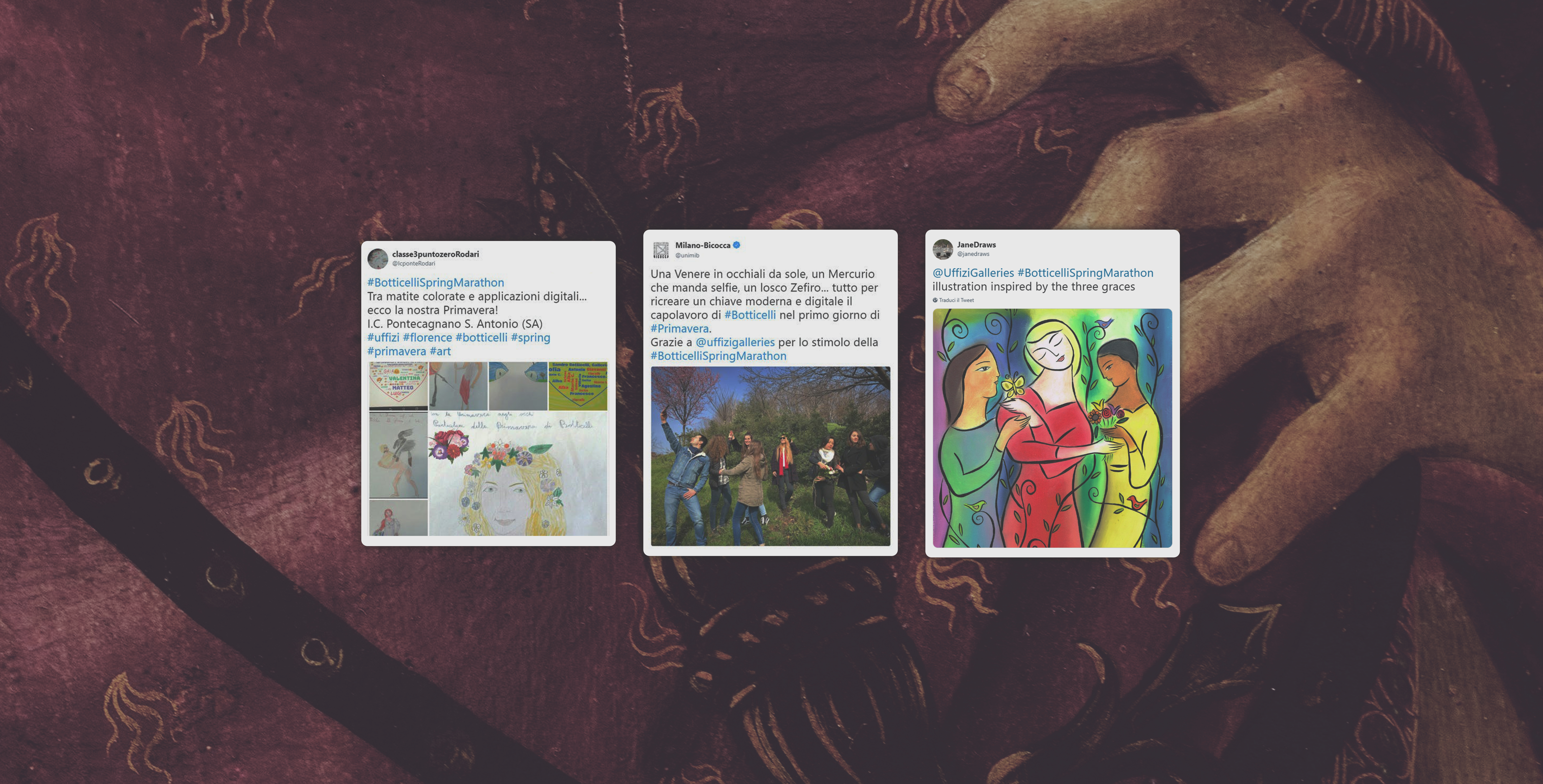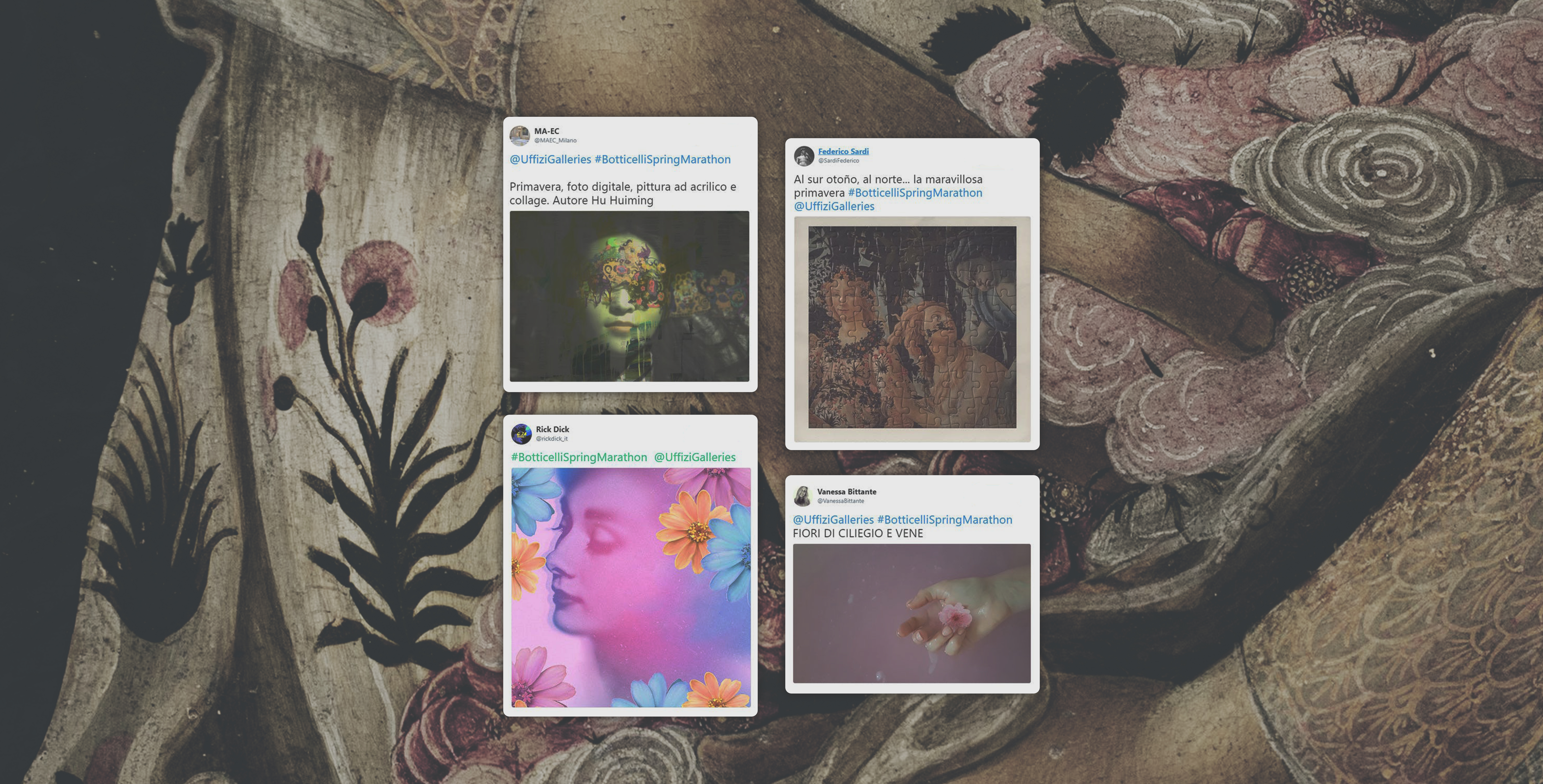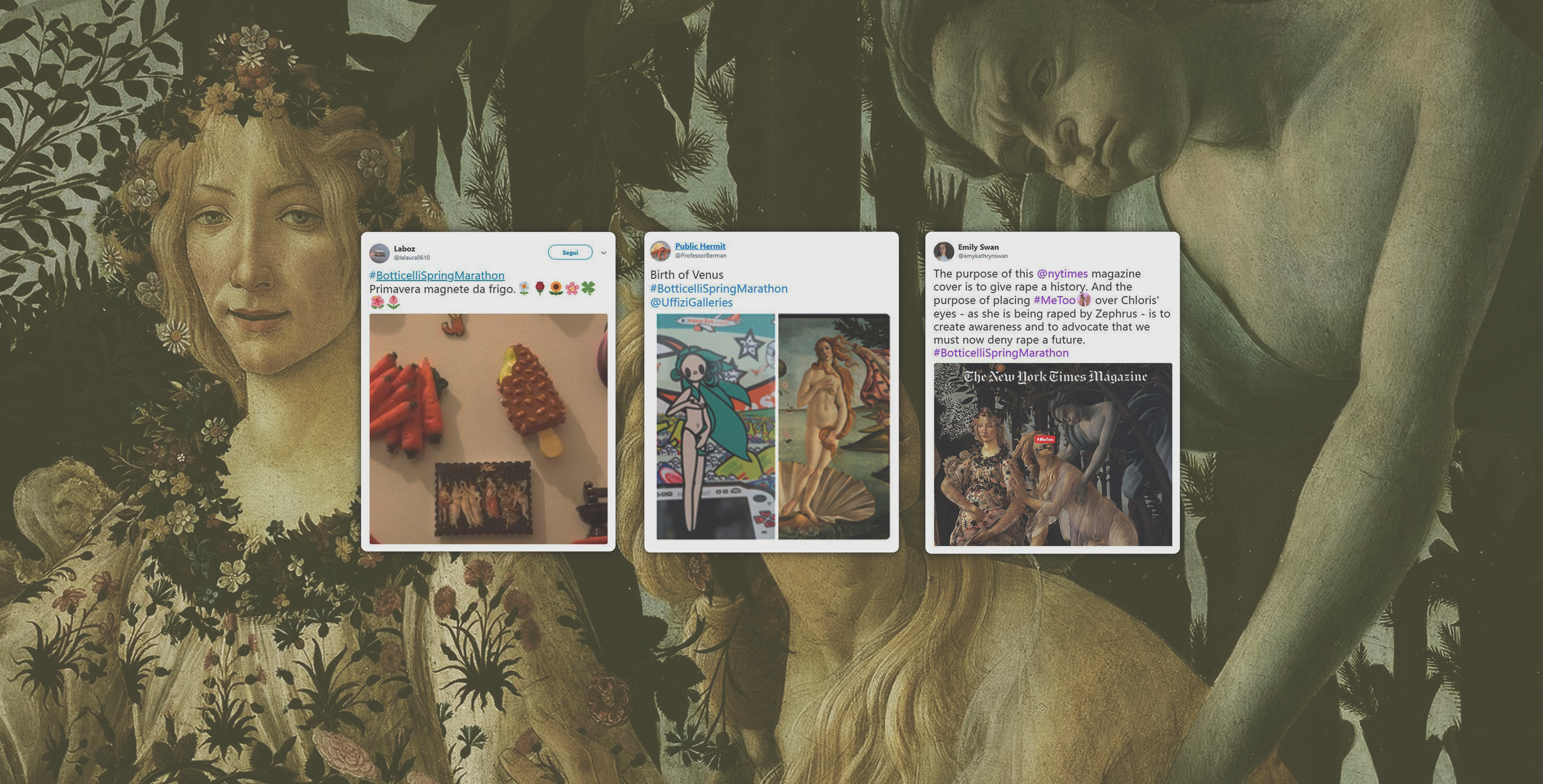 Il 21 marzo 2018 il Dipartimento di Comunicazione Digitale delle Gallerie degli Uffizi ha lanciato una campagna internazionale su Twitter intitolata #BotticelliSpringMarathon in cui ha invitato i follower e i più grandi musei del mondo che conservano opere di Botticelli a condividere sul profilo degli Uffizi un saluto all’arrivo della primavera nel segno dell’arte del grande Maestro fiorentino. All’iniziativa è stato associato un vero e proprio contest fotografico, una maratona digitale di una settimana dove è stato chiesto ai visitatori degli Uffizi e agli utenti online da ogni parte del mondo di inviare sull’account @UffiziGalleries la “propria” visione di una delle opere più iconiche della collezione del museo, oggetto di una vera e propria forma di venerazione: La Primavera di Botticelli. In poche ore la campagna è diventata virale, ne hanno parlato i social e la stampa, è rimbalzata in tutto il mondo fregiandosi anche della partecipazione di grandissimi musei che hanno deciso di omaggiare l’iniziativa degli Uffizi pubblicando dettagli a tema primaverile tratti dai loro capolavori di Botticelli esposti: il Louvre, il Prado, la National Gallery di Londra, il Museo Puškin, l’Hermitage, la National Gallery di Edimburgo, il Museo Isabella Stewart-Gardner, il Museo di Houston, il Museo di Strasburgo e gli italiani Museo Poldi Pezzoli e Fondazione Giorgio Cini sono stati i musei che hanno risposto con entusiasmo e simpatia alla “festa di Primavera digitale” degli Uffizi.