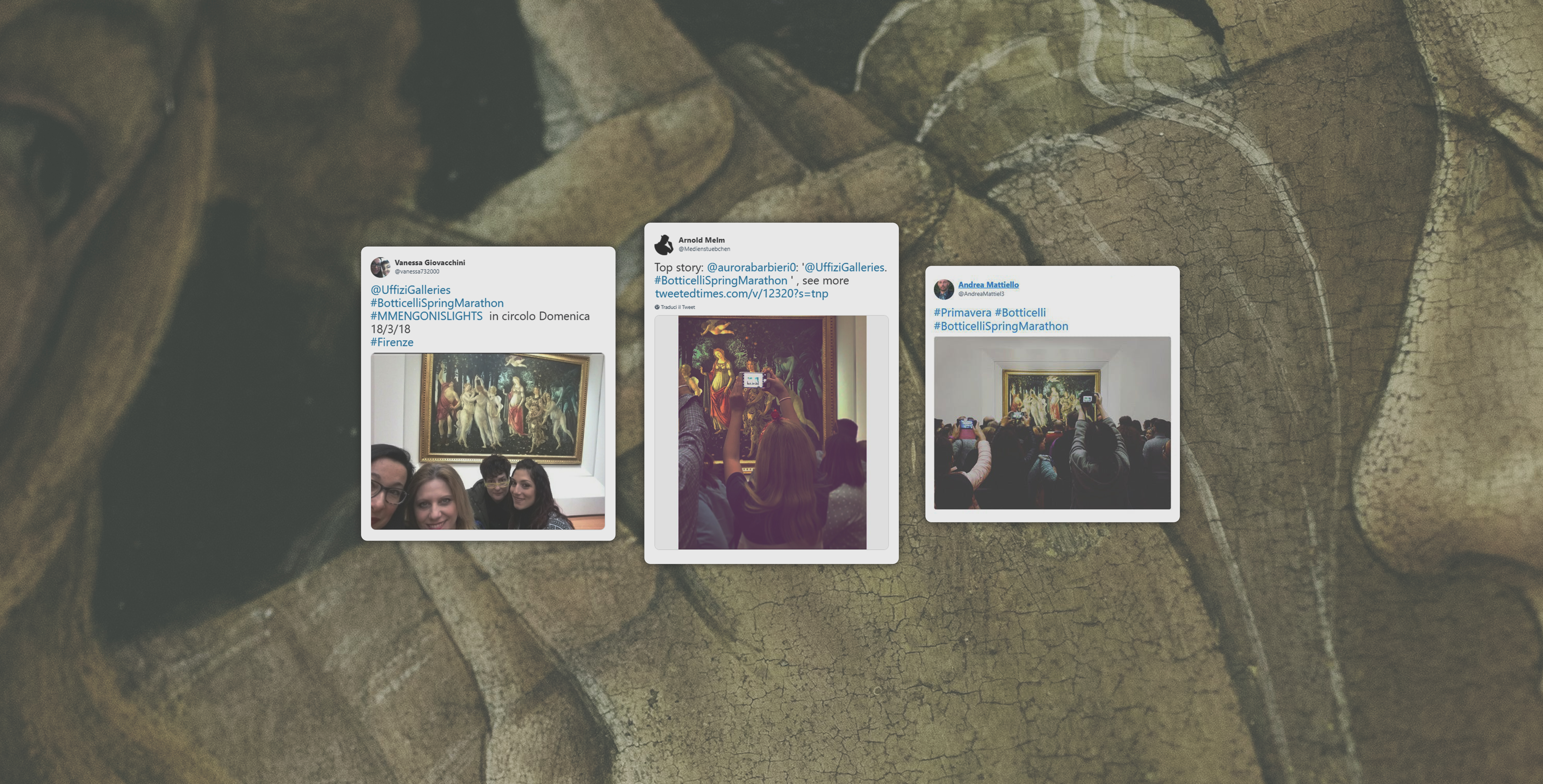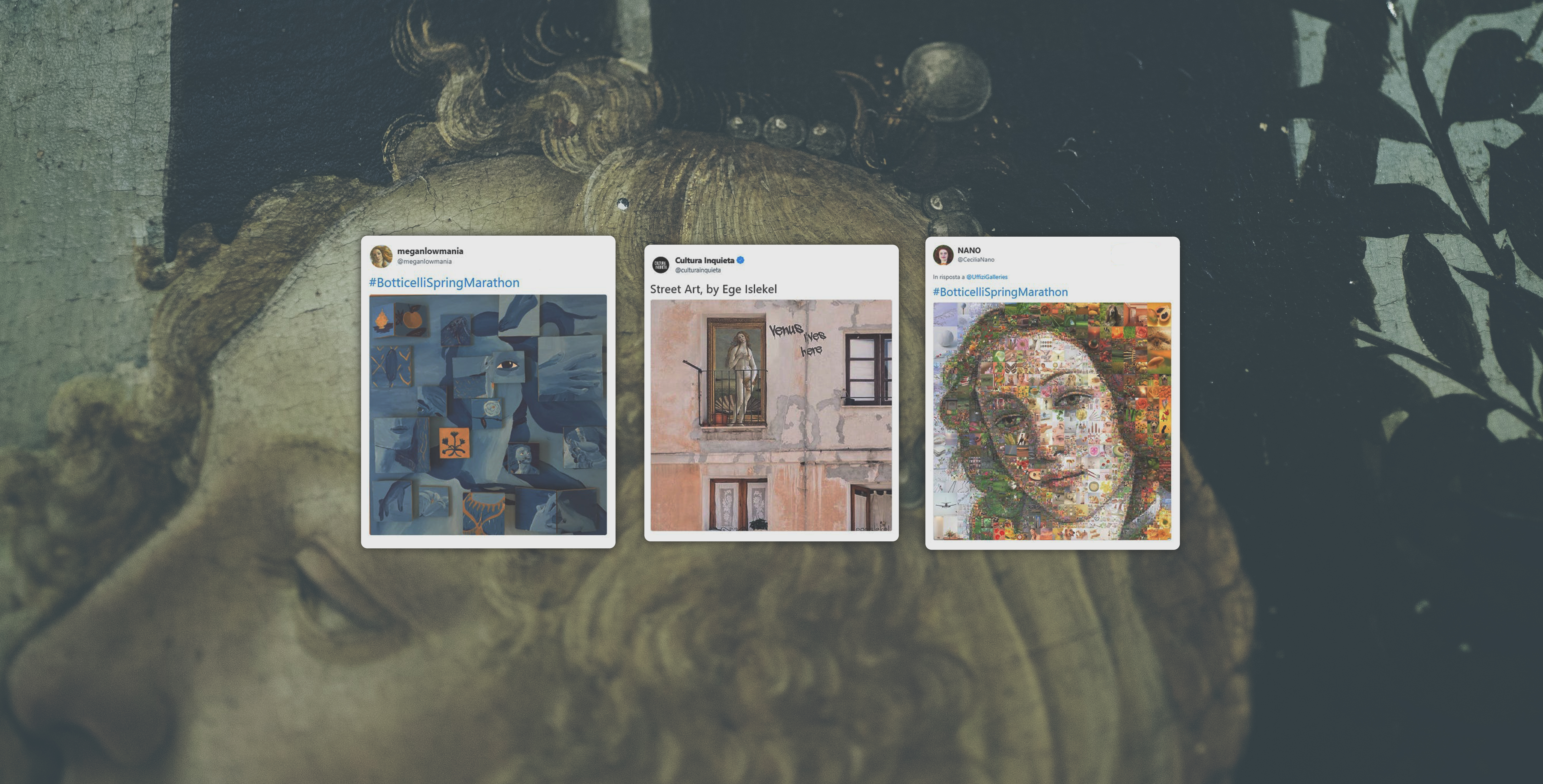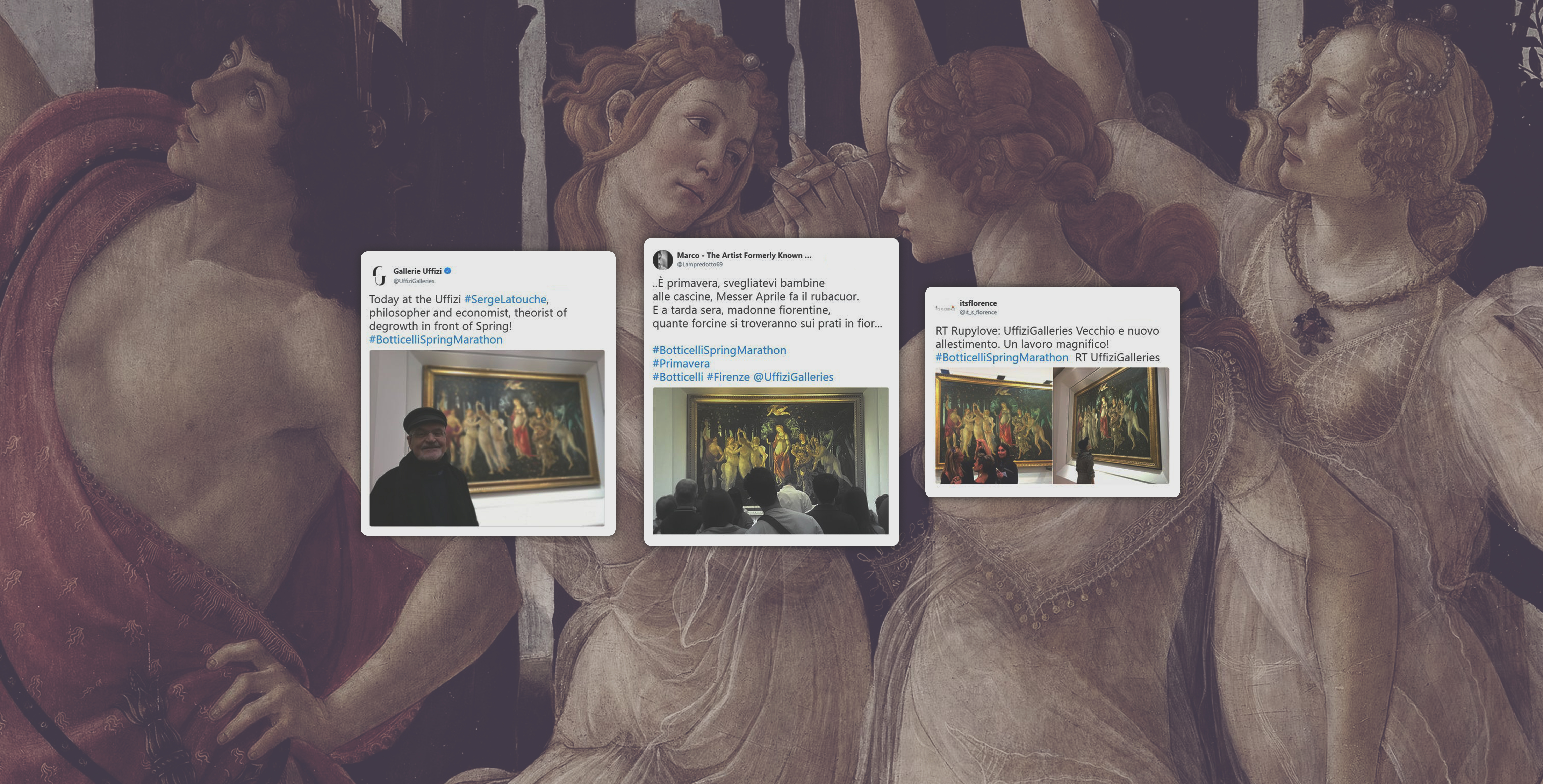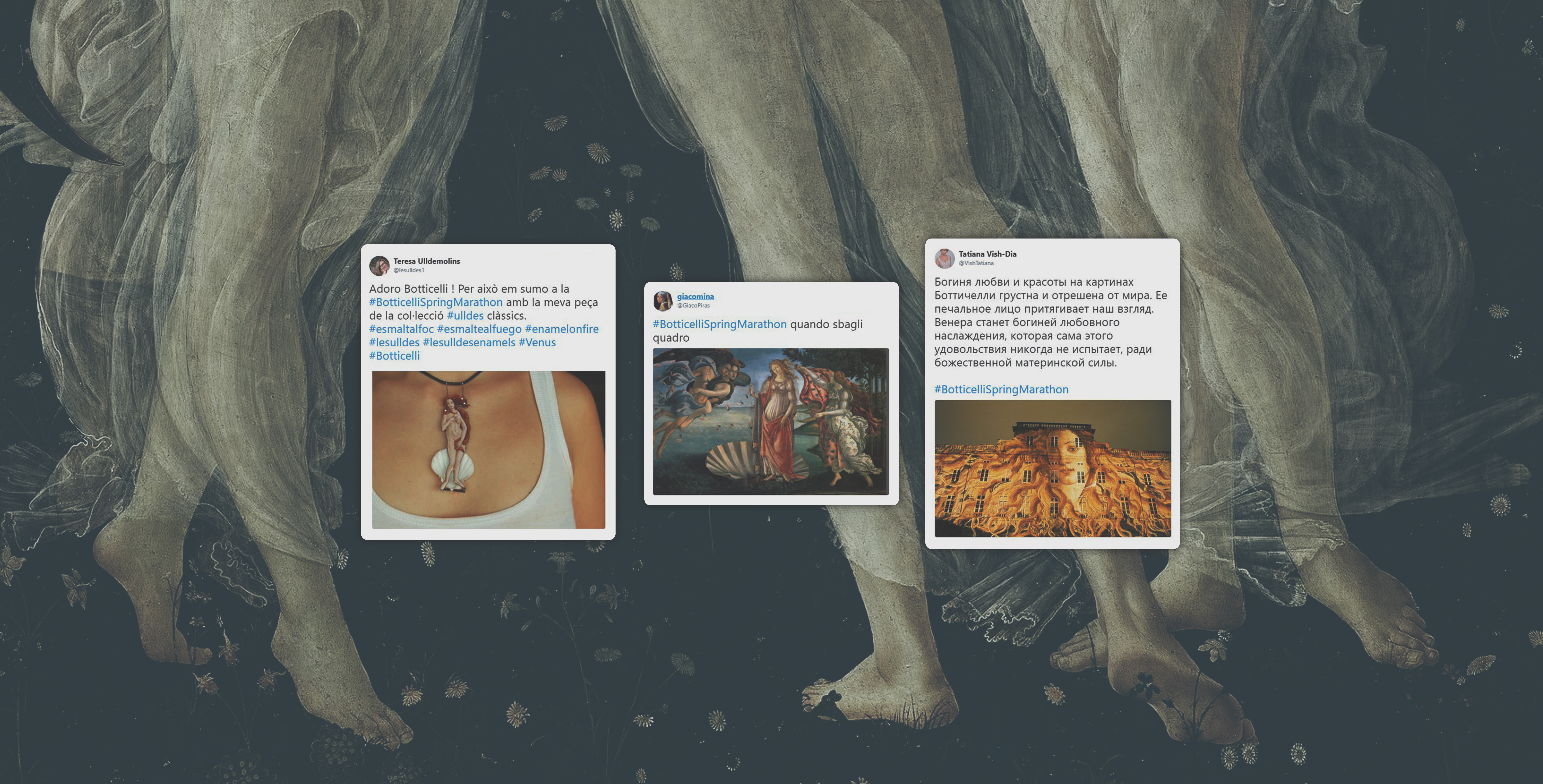 Il 21 marzo 2018 il Dipartimento di Comunicazione Digitale delle Gallerie degli Uffizi ha lanciato una campagna internazionale su Twitter intitolata #BotticelliSpringMarathon in cui ha invitato i follower e i più grandi musei del mondo che conservano opere di Botticelli a condividere sul profilo degli Uffizi un saluto all’arrivo della primavera nel segno dell’arte del grande Maestro fiorentino. All’iniziativa è stato associato un vero e proprio contest fotografico, una maratona digitale di una settimana dove è stato chiesto ai visitatori degli Uffizi e agli utenti online da ogni parte del mondo di inviare sull’account @UffiziGalleries la “propria” visione di una delle opere più iconiche della collezione del museo, oggetto di una vera e propria forma di venerazione: La Primavera di Botticelli. In poche ore la campagna è diventata virale, ne hanno parlato i social e la stampa, è rimbalzata in tutto il mondo fregiandosi anche della partecipazione di grandissimi musei che hanno deciso di omaggiare l’iniziativa degli Uffizi pubblicando dettagli a tema primaverile tratti dai loro capolavori di Botticelli esposti: il Louvre, il Prado, la National Gallery di Londra, il Museo Puškin, l’Hermitage, la National Gallery di Edimburgo, il Museo Isabella Stewart-Gardner, il Museo di Houston, il Museo di Strasburgo e gli italiani Museo Poldi Pezzoli e Fondazione Giorgio Cini sono stati i musei che hanno risposto con entusiasmo e simpatia alla “festa di Primavera digitale” degli Uffizi.