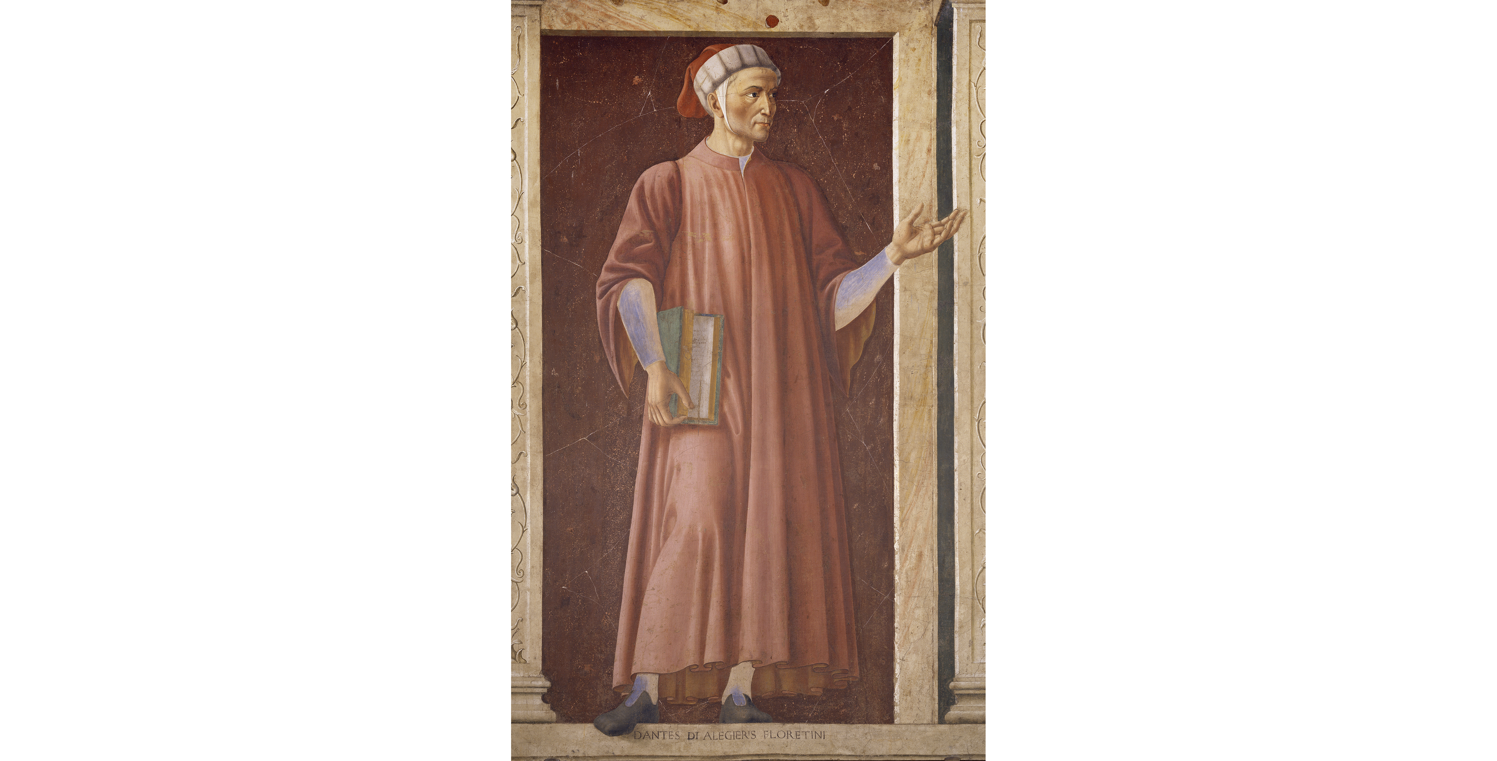 Fra i più antichi ritratti di Dante Alighieri pervenuti fino ad oggi, questa raffigurazione presenta molti degli attributi divenuti nei secoli peculiari dell’iconografia del poeta. Dante indossa una lunga e ampia sopravveste rossa, l’abito accademico che contraddistingueva i dotti e gli uomini di elevata estrazione sociale. Ha la testa coperta da una cuffia su cui indossa il berretto foderato di pelliccia, chiuso dietro da un corto becchetto secondo la moda d’inizio Trecento. Il volto maturo, solcato da rughe, è caratterizzato dal naso leggermente aquilino e dal mento prominente. Tali tratti somatici trovano riscontro nella descrizione del sommo poeta tracciata da Giovanni Boccaccio nel Trattatello in laude di Dante, possibile fonte di ispirazione per la pittura di Andrea del Castagno insieme alle effigi dell’Alighieri che fin dal Trecento trovavano posto nelle decorazioni sulle pareti di edifici pubblici e privati a Firenze.