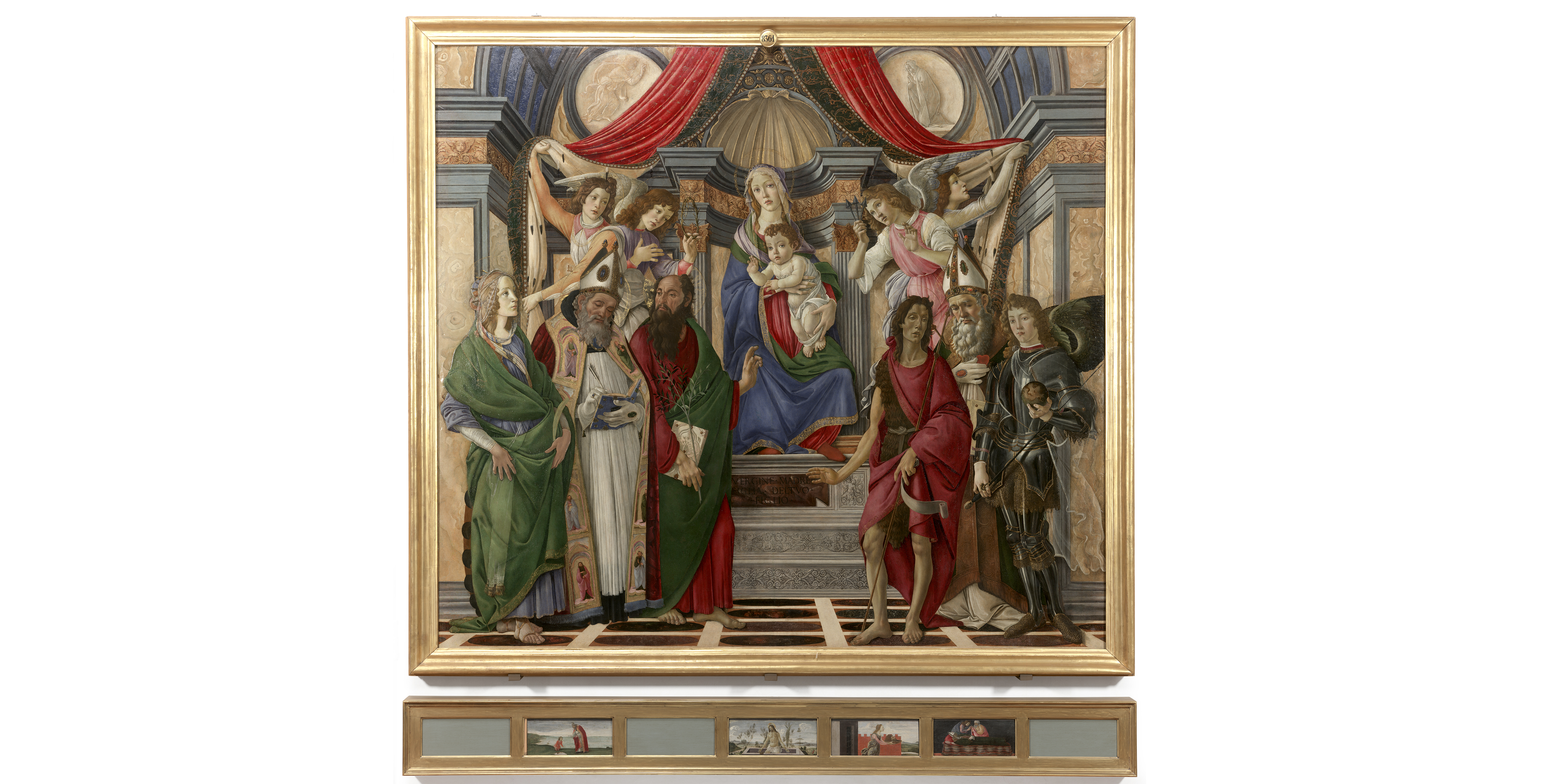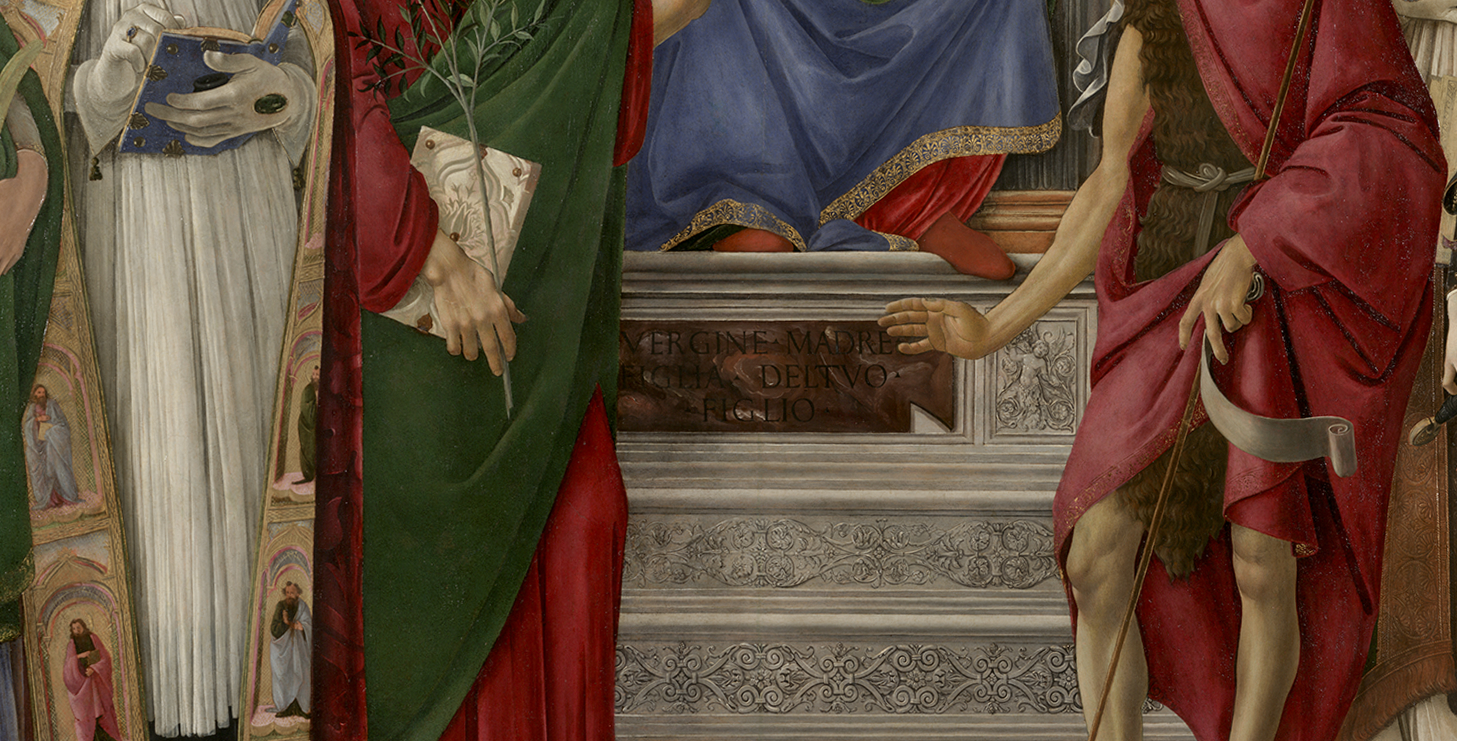 Nel dipinto di Sandro Botticelli, come nella visione di Dante, angeli e alcuni santi circondano la Madonna, intercedendo per i devoti come Bernardo in favore del poeta. La grande pala sormontava l’altare maggiore della chiesa di San Barnaba a Firenze, chiesa fondata per celebrare la vittoria dei guelfi a Campaldino, nel 1289, nel giorno della festa di san Barnaba. L’Arte dei Medici e Speziali aveva il patronato della chiesa, la cui cura spettava ai frati agostiniani. Nel dipinto sono rappresentati, da sinistra, Caterina d’Alessandria, Agostino, Barnaba, Giovanni Battista, Ignazio d’Antiochia e Michele, santi legati non solo ai committenti ma anche alla devozione cittadina. Il dipinto di Botticelli attesta la fortuna della preghiera dantesca, entrata a far parte del repertorio di litanie dedicate alla Vergine. Lo stesso passo “Vergine madre, figlia del tuo figlio” accompagna l’effigie della Madonna in altri dipinti fiorentini del XV secolo, come l’Adorazione del Bambino del Maestro di Città di Castello al Museo civico di Villa Mimbelli a Livorno.