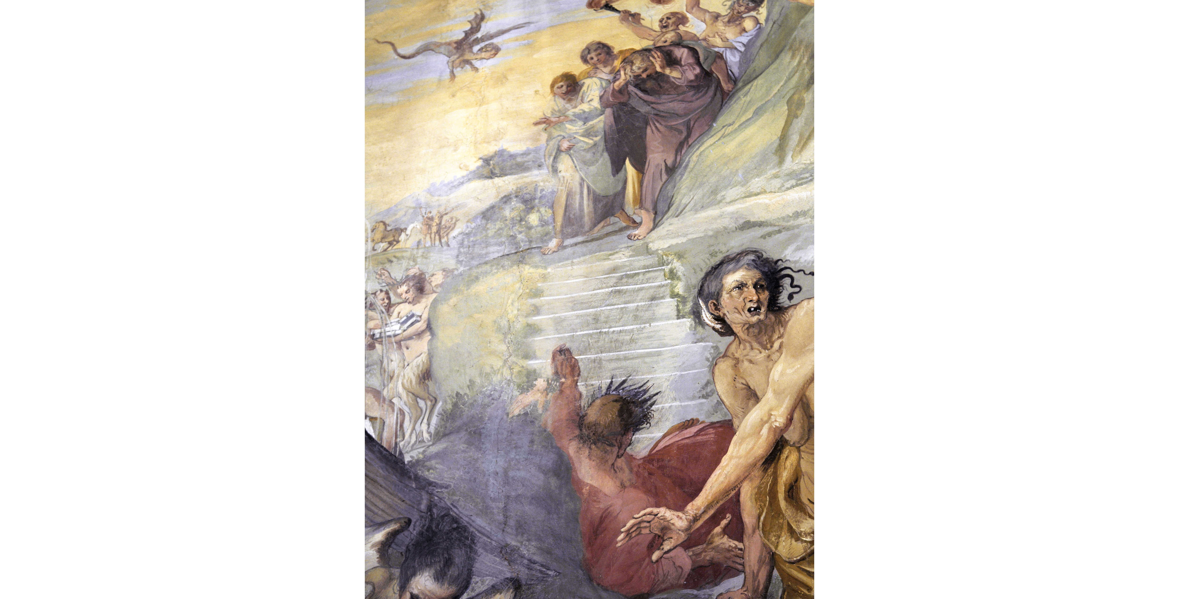 L’ironia di Giovanni da San Giovanni non risparmia nemmeno gli altri personaggi: il Pegaso viene atterrato e morsicato da grottesche arpie e Omero, cieco e barcollante, procede a tentoni, dirigendosi addirittura fuori dallo spazio dipinto. Fuggono dal Parnaso anche Platone, Aristotele, Saffo ed Empedocle, figure tratte dalla Scuola di Atene di Raffaello nelle Stanze vaticane. Il ciclo proseguì, dopo la morte di Giovanni, nel 1636, per mano di altri pittori chiamati ad illustrare l’apoteosi di Lorenzo il Magnifico, mecenate e fondatore dell’Accademia Neoplatonica, attorniato dai suoi artisti, poeti e filosofi del Rinascimento. L’ambizione di Firenze di farsi erede della cultura greca e romana trova esempi nell’arte fin dalla fine del Trecento, quando Coluccio Salutati, cancelliere della Repubblica, si fece promotore in città di un doppio progetto: in Palazzo della Signoria volle un affresco, andato perduto, ispirato al “De Viribus Illustribus” del Petrarca raffigurante 22 glorie dell’antichità greca e romana, mentre promosse in Santa Maria del Fiore la celebrazione delle maggiori glorie toscane, tra cui Dante, Petrarca e Boccaccio, con l’intento di far rientrare in patria la salma del sommo poeta. Quest’ultimo progetto fallì, ma trovò esito, entro la fine del secolo, nel Palazzo dei Giudici e Notai, che custodiva fin dalla metà del Trecento sulle sue pareti affrescate uno dei più antichi ritratti di Dante. Com’è ovvio non esiste alcun nesso iconografico tra il Dante in veste di fiero e illustre letterato, codificato tra Tre e Quattrocento, con il Dante del Mannozzi. Tuttavia l’artista, in piena licenza d’autore, per il suo Dante in caduta libera può aver tratto ispirazione dai tanti passi nella Commedia in cui il poeta manifesta timore, smarrimento e paura dinanzi a diavoli e creature mostruose, come qui con le arpie e i satiri. Un Dante fragile che ci ricorda come sia necessario superare ogni sorta di ostacolo per conseguire la salvezza.