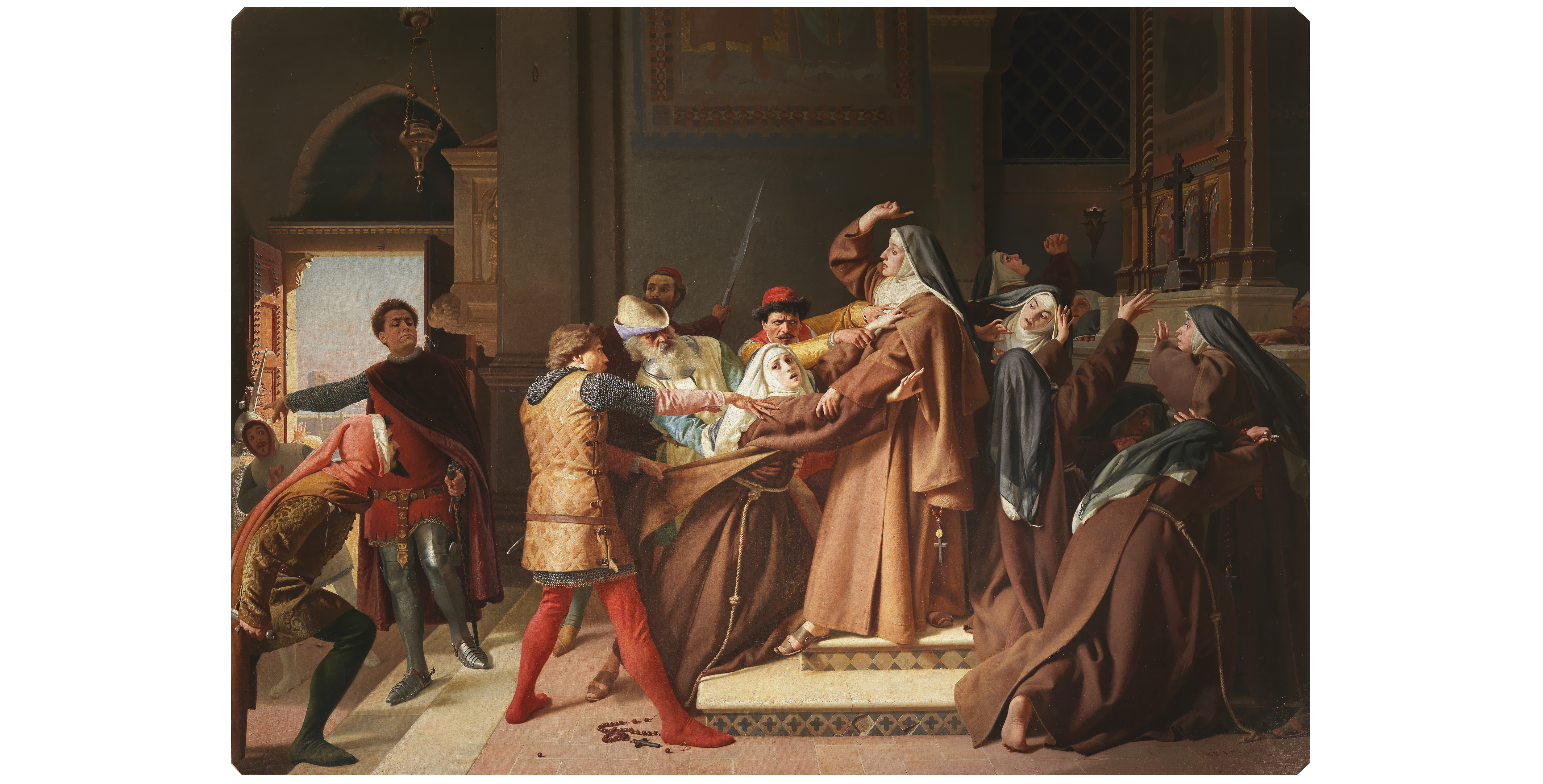 Raffaello Sorbi rappresenta il culmine dello scontro tra due volontà opposte: da una parte la vocazione alla vita claustrale di Piccarda, dall’altra la bieca ragione politica del fratello. La carica espressiva, accentuata dalla contrapposizione tra gruppo maschile e femminile, si concentra nell’enfasi teatrale delle braccia tese e nella gestualità eloquente delle mani: alcune suore implorano Dio, altre si proteggono, la madre superiora ammonisce gli usurpatori mentre Piccarda si aggrappa invano a lei e cerca di divincolarsi dalla morsa violenta degli sgherri, sotto gli occhi di Corso, che impugna saldo una spada e le impone con superbo disprezzo la sua volontà. Il rosario spezzato e calpestato è il simbolo della vocazione mortificata di Piccarda, che accanto all’amore represso di Francesca da Rimini e alla malinconica rassegnazione di Pia de’ Tolomei compone una trilogia femminile, tragicamente attuale e perfettamente coerente con gli ideali del Romanticismo storico che ispiravano arte e letteratura poco oltre la metà dell’Ottocento.