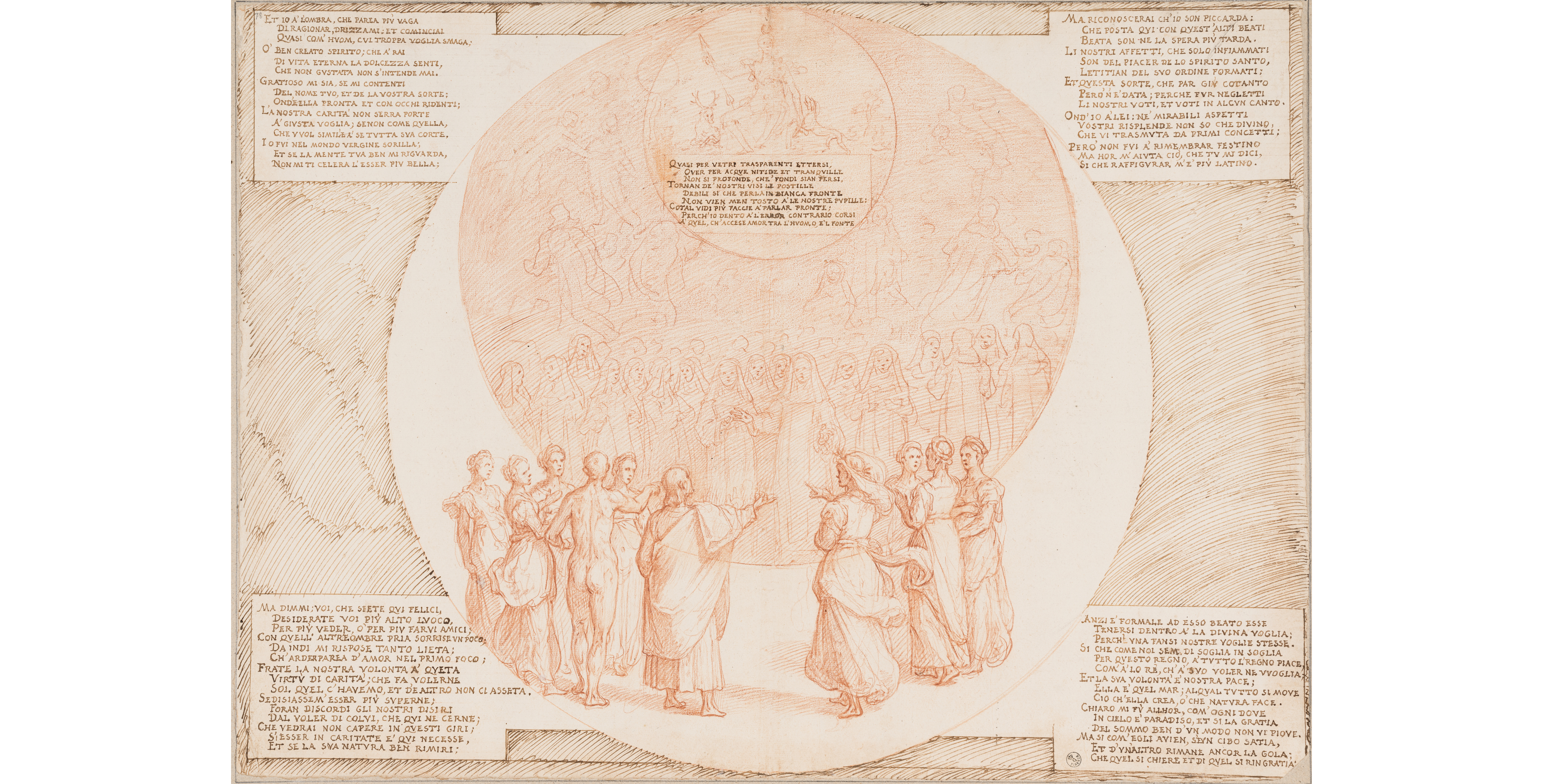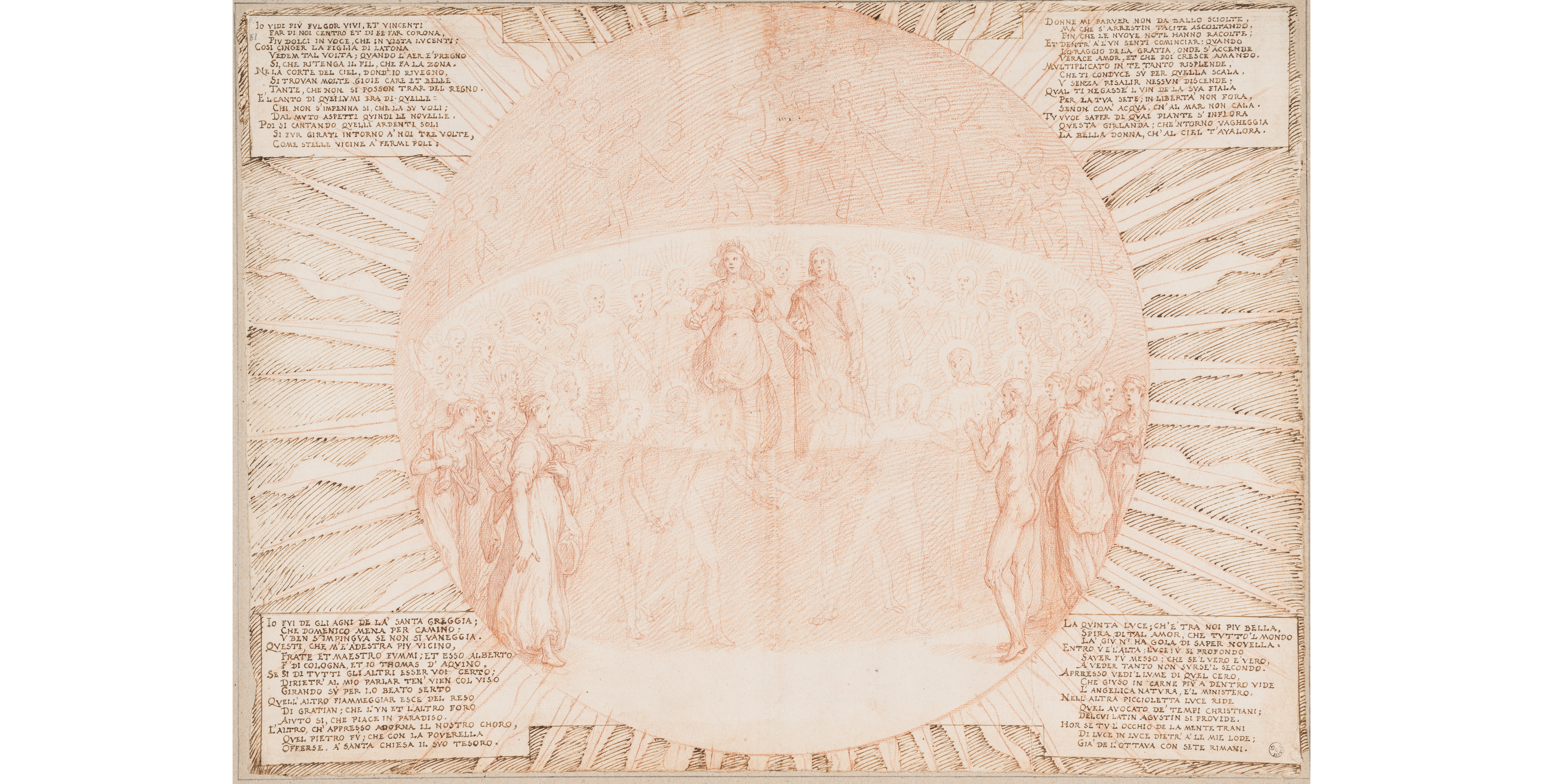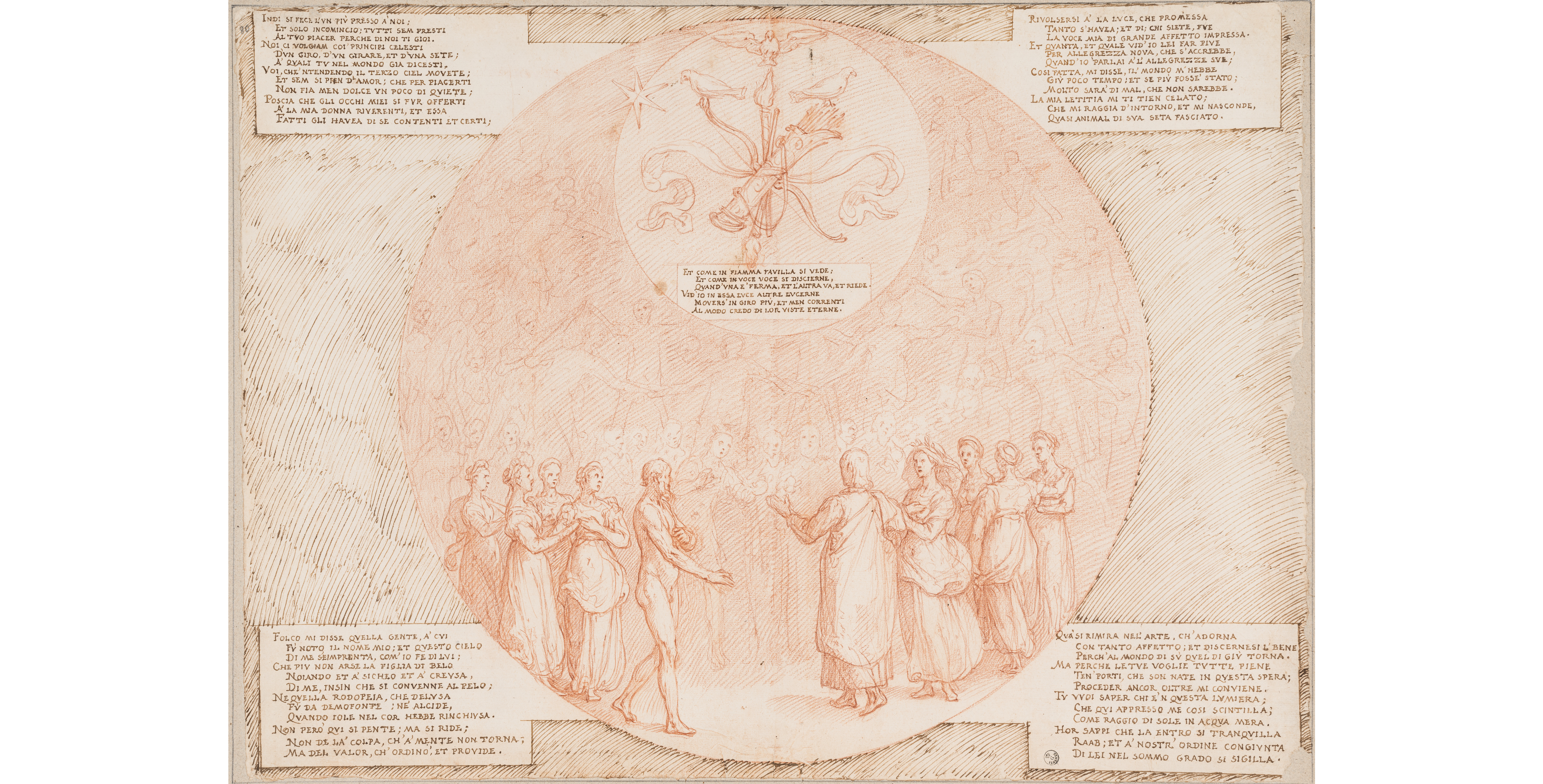 Commento di Federico Zuccari: «Paradiso. Ottava sfera. Canto XXII e XXIII. Sale il poeta all’ottava sfera e di quella nel segno di Gemini, del qual luogo voltatosi indietro vien di grado in grado a rivedere tutta la sua peregrinatione fin qua giuso in terra, di dove prima s’era partito. Inoltre dice esserli apparso in quell’ottava sfera il trionfo di Christo, cioè la chiesa trionfante, il qual trionfo era seguito da infinito numero de’ beati, sopra de’ quali esso Christo risplendeva come il sole splende ne’ superiori, et in questi inferiori corpi» (fol. 84 verso).