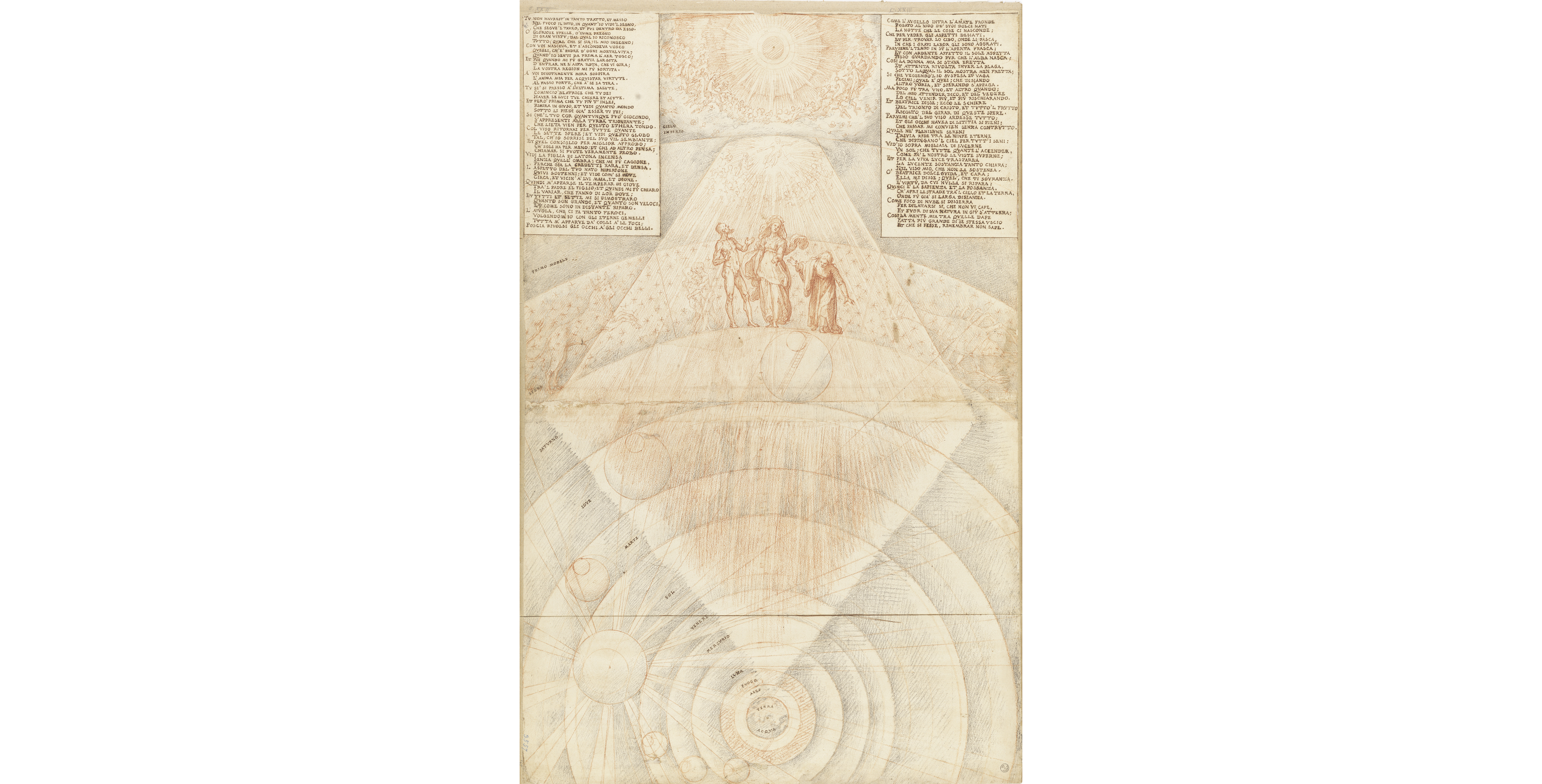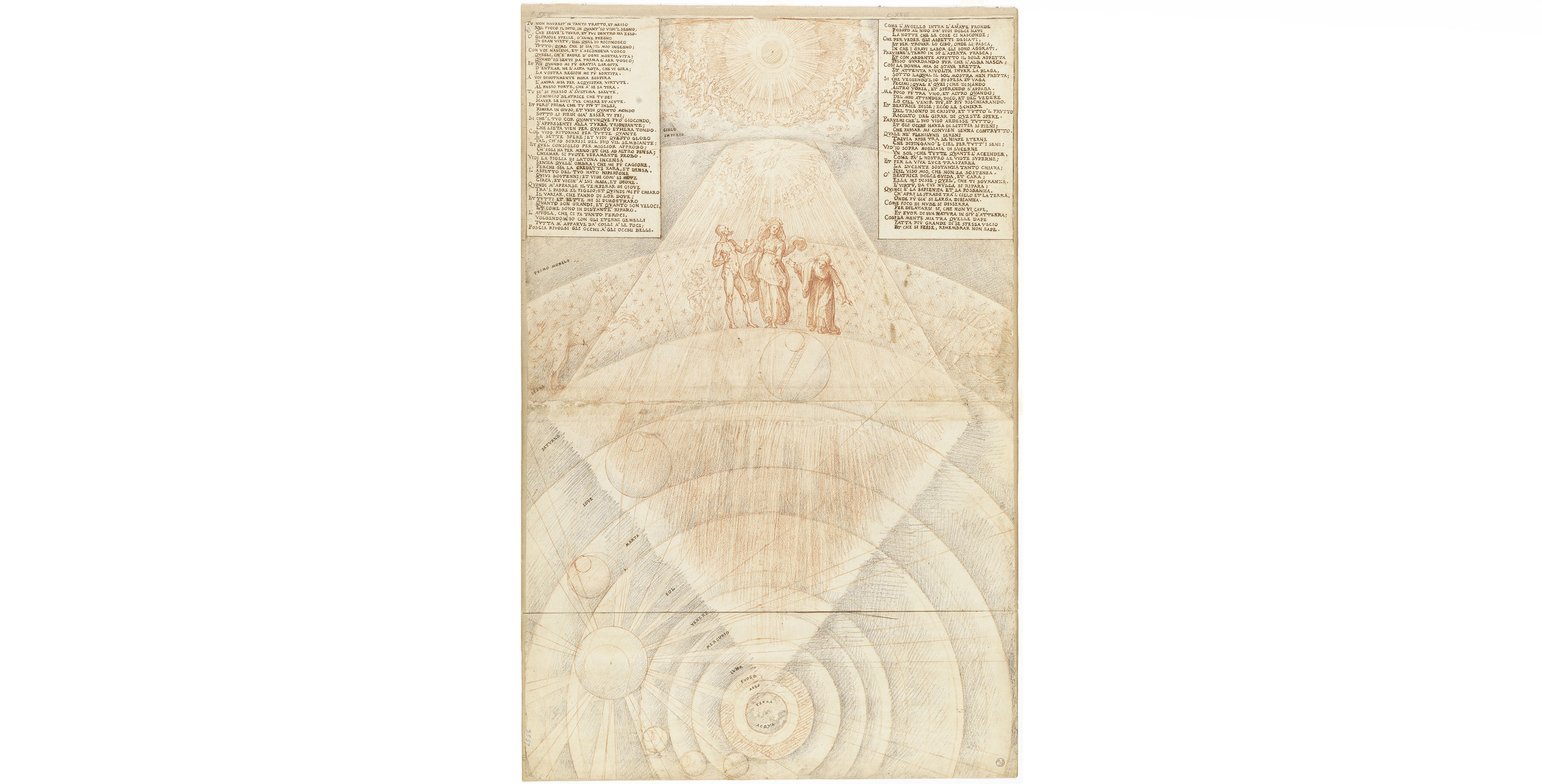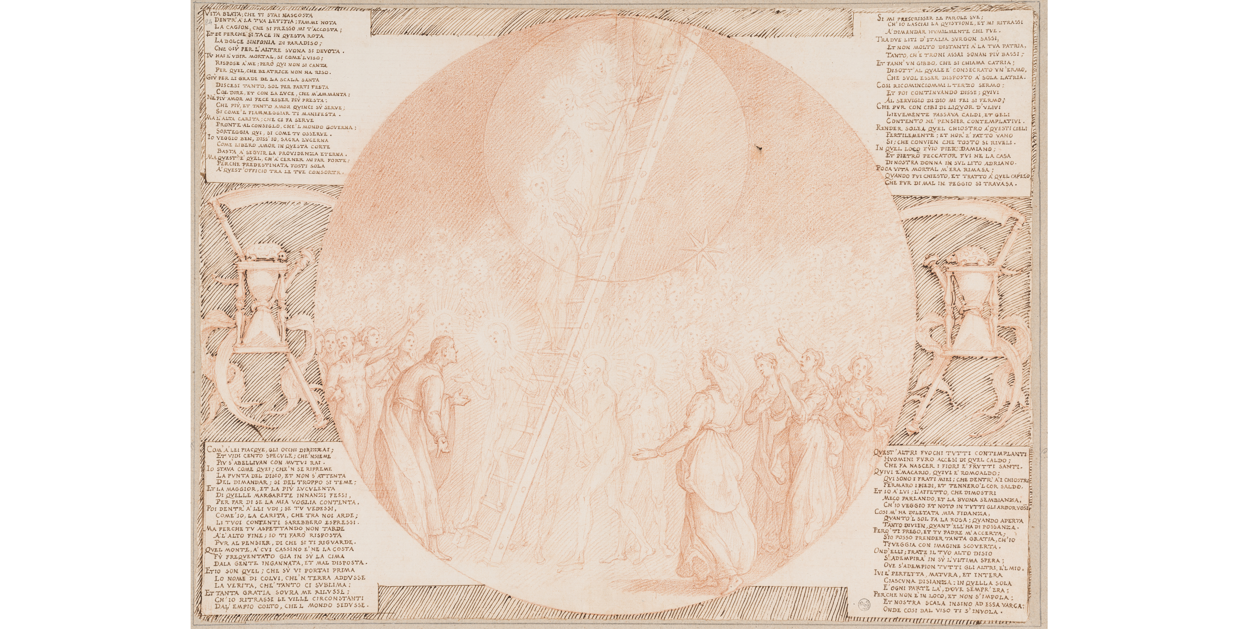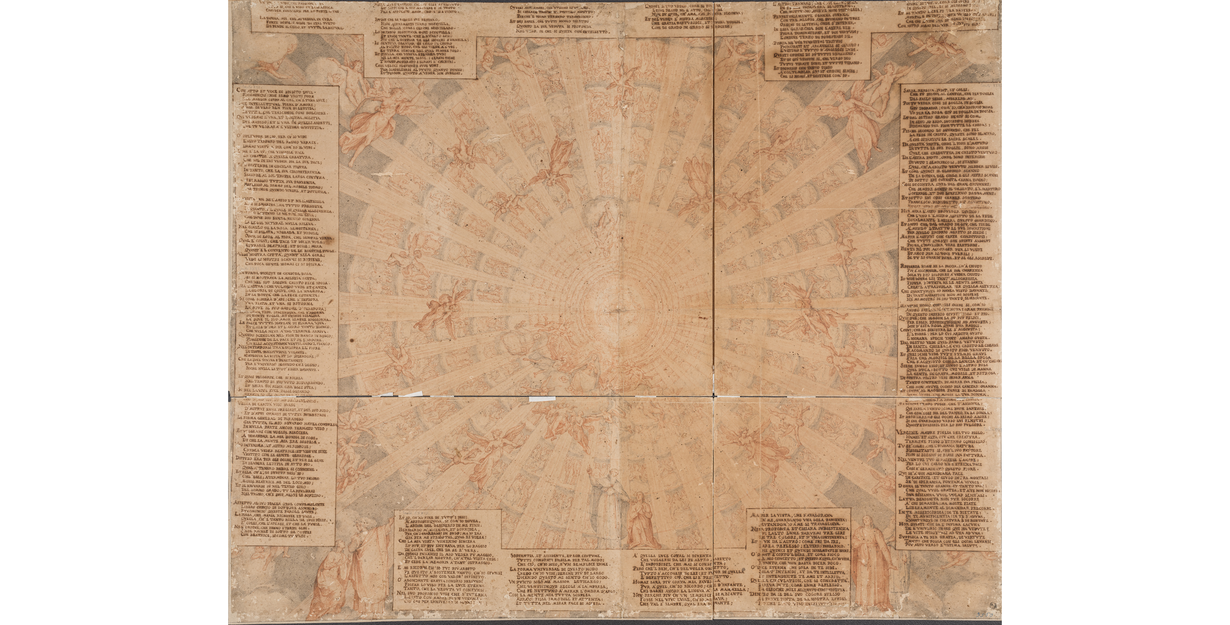 Commento di Federico Zuccari: «Paradiso. Ottava sfera. Canto XXII e XXIII. Sale il poeta all’ottava sfera e di quella nel segno di Gemini, del qual luogo voltatosi indietro vien di grado in grado a rivedere tutta la sua peregrinatione fin qua giuso in terra, di dove prima s’era partito. Inoltre dice esserli apparso in quell’ottava sfera il trionfo di Christo, cioè la chiesa trionfante, il qual trionfo era seguito da infinito numero de’ beati, sopra de’ quali esso Christo risplendeva come il sole splende ne’ superiori, et in questi inferiori corpi» (fol. 84 verso).