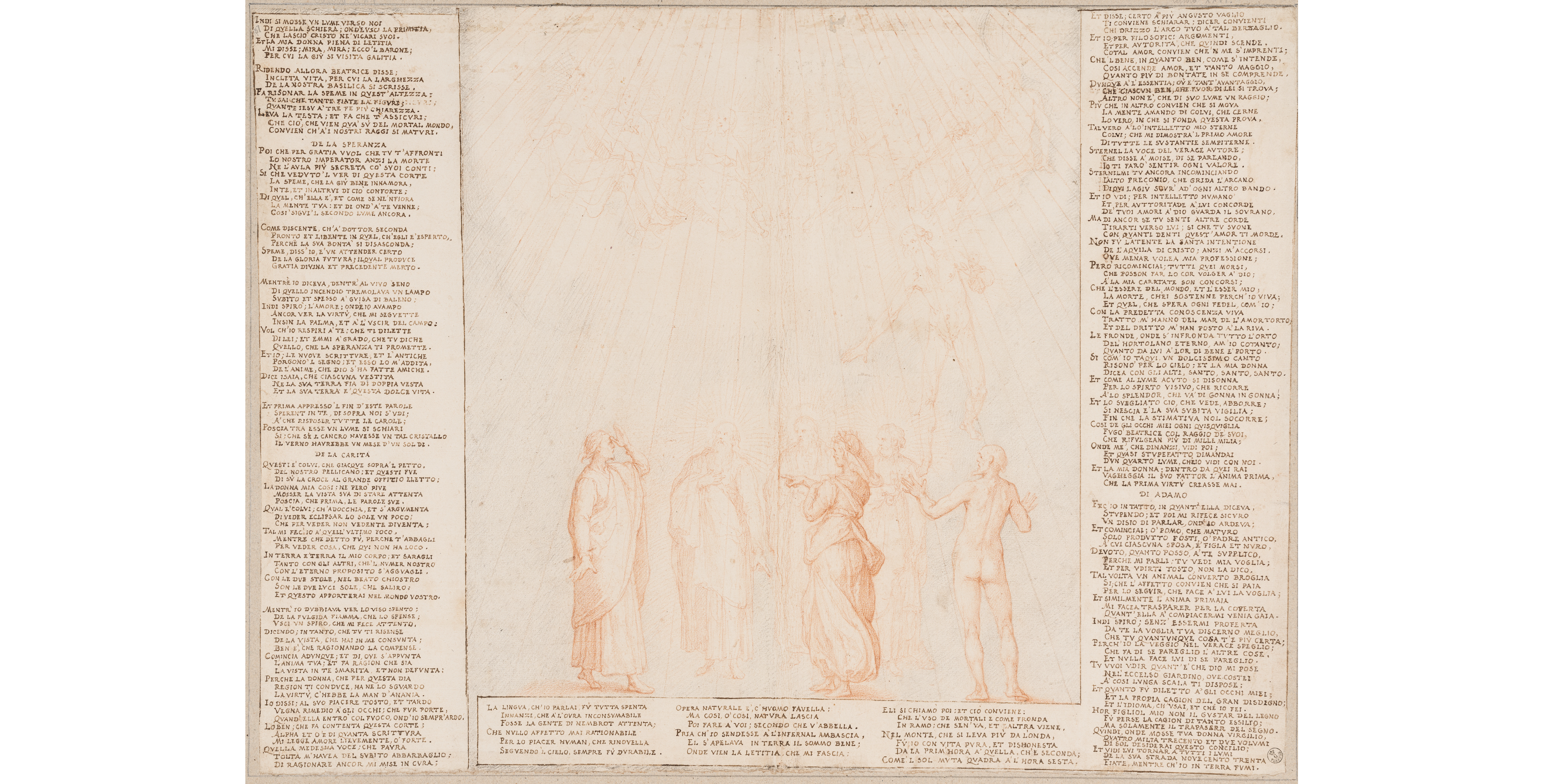 Il disegno illustra nella sfera in alto gli attributi di Amore: l’arco, la faretra e le colombe; nella sfera in basso sono invece raffigurati, a sinistra, Stazio e le quattro Virtù cardinali e, a destra, Dante in compagnia di Beatrice e delle tre Virtù teologali.