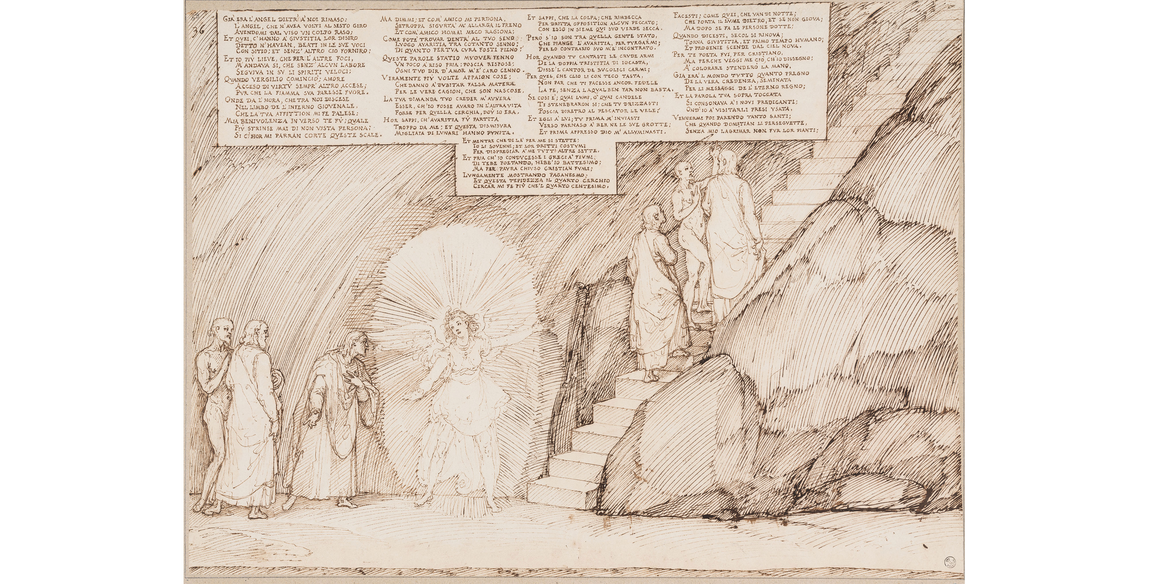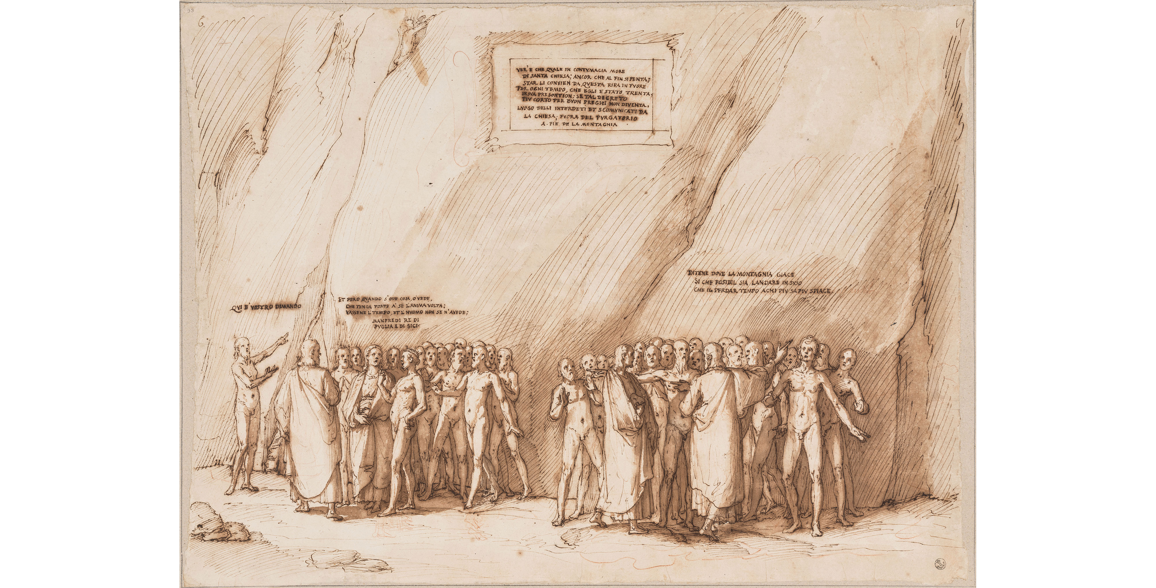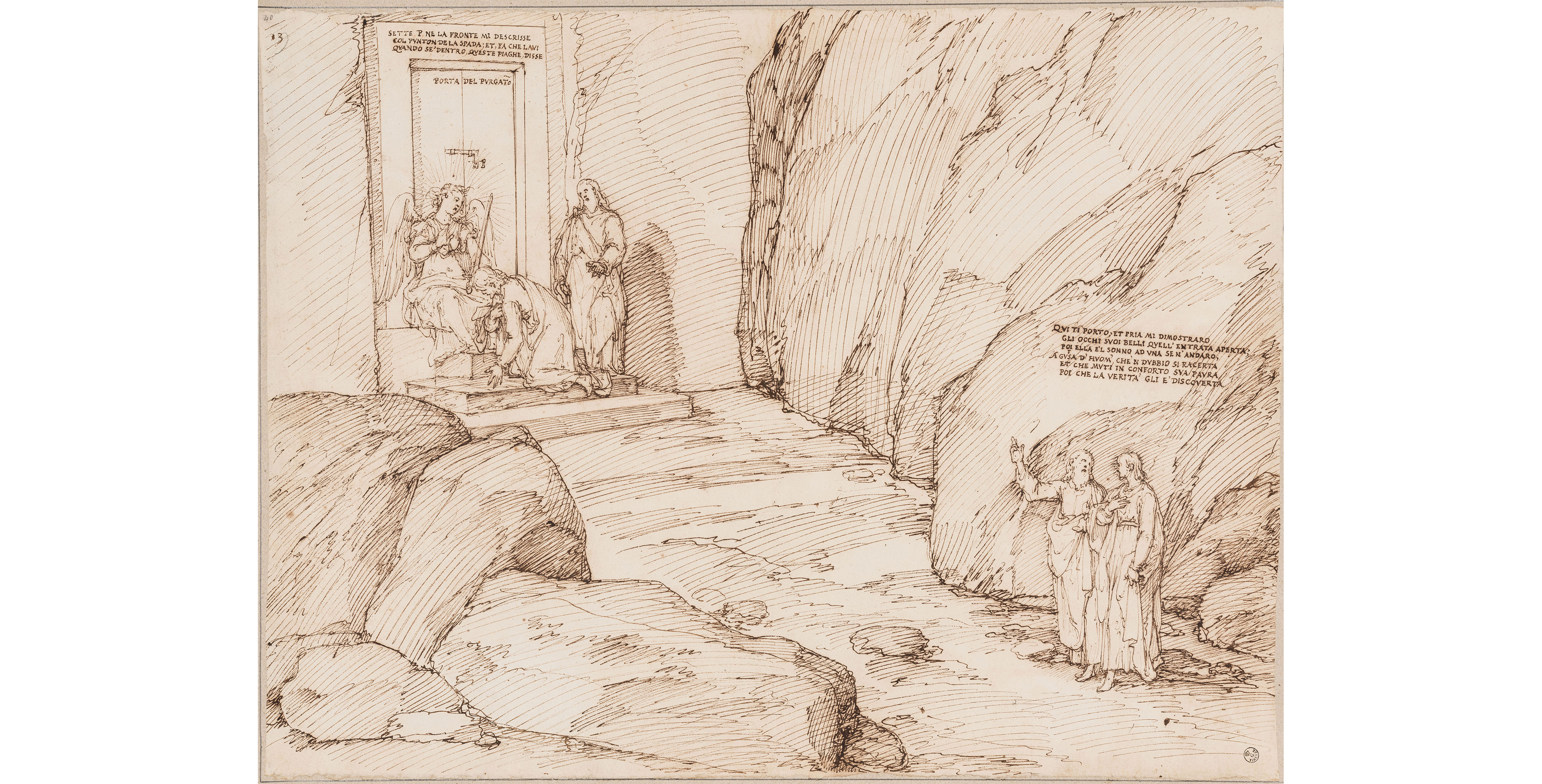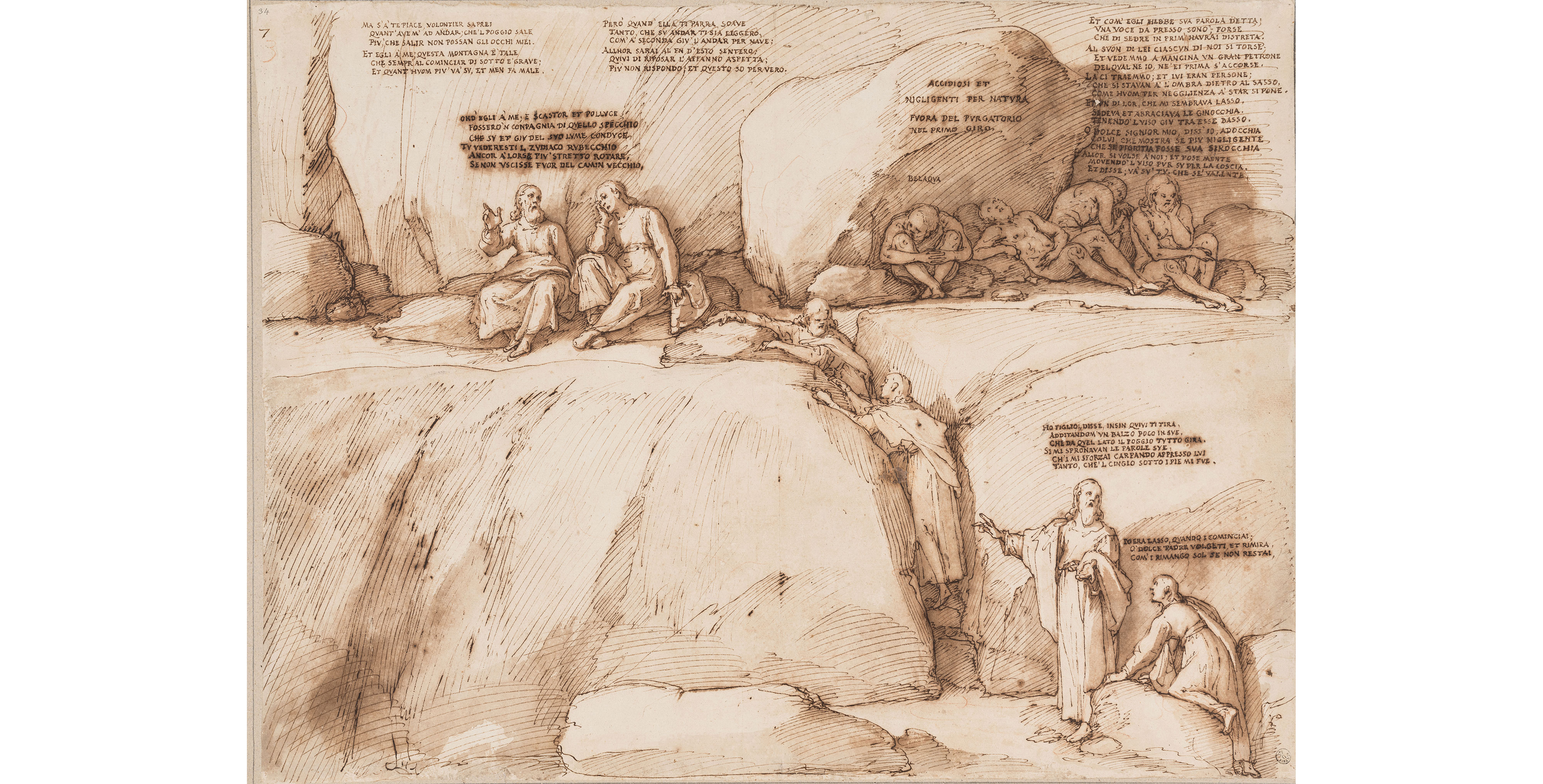 Il Purgatorio è senz’altro la cantica della Commedia su cui Federico Zuccari ha avuto occasione di riflettere più a lungo, come dimostra non solo il considerevole numero di illustrazioni dedicate ai trentaquattro canti corrispondenti, ma anche la quantità di pentimenti e di rifacimenti che hanno interessato in varia misura i disegni.