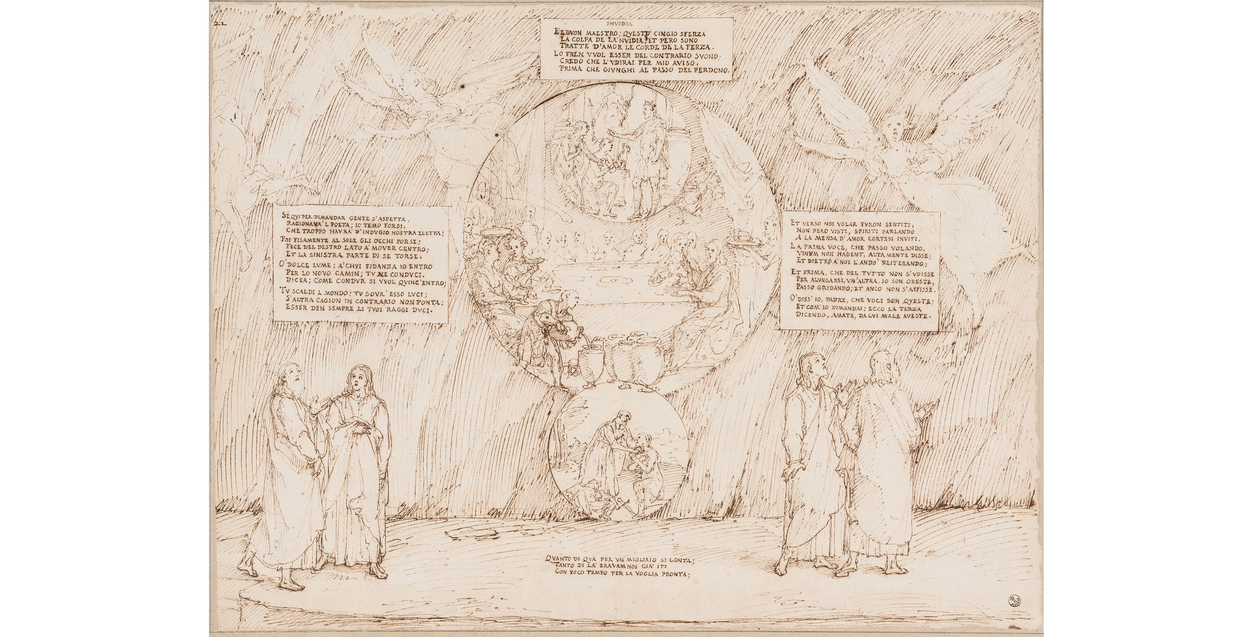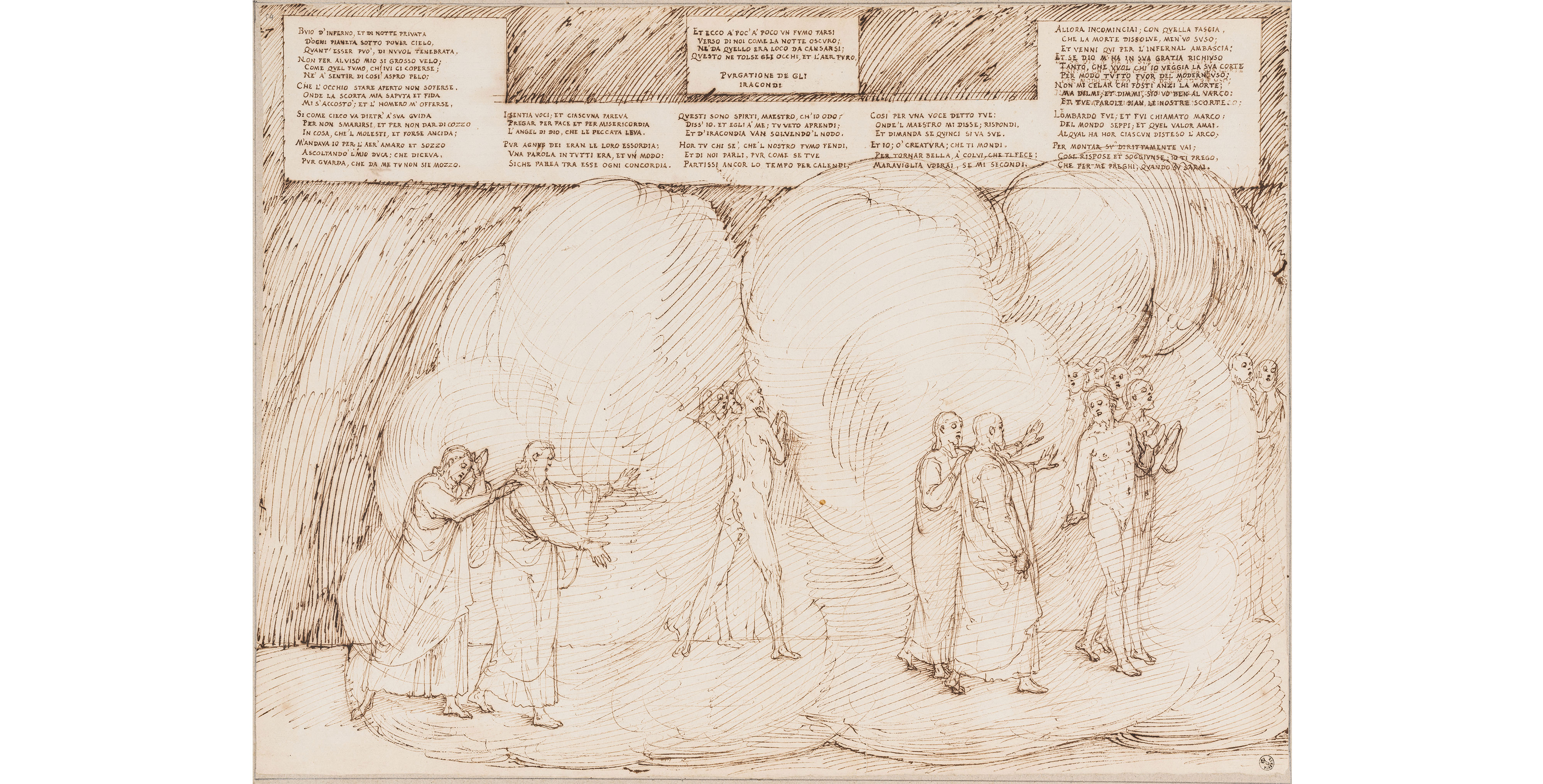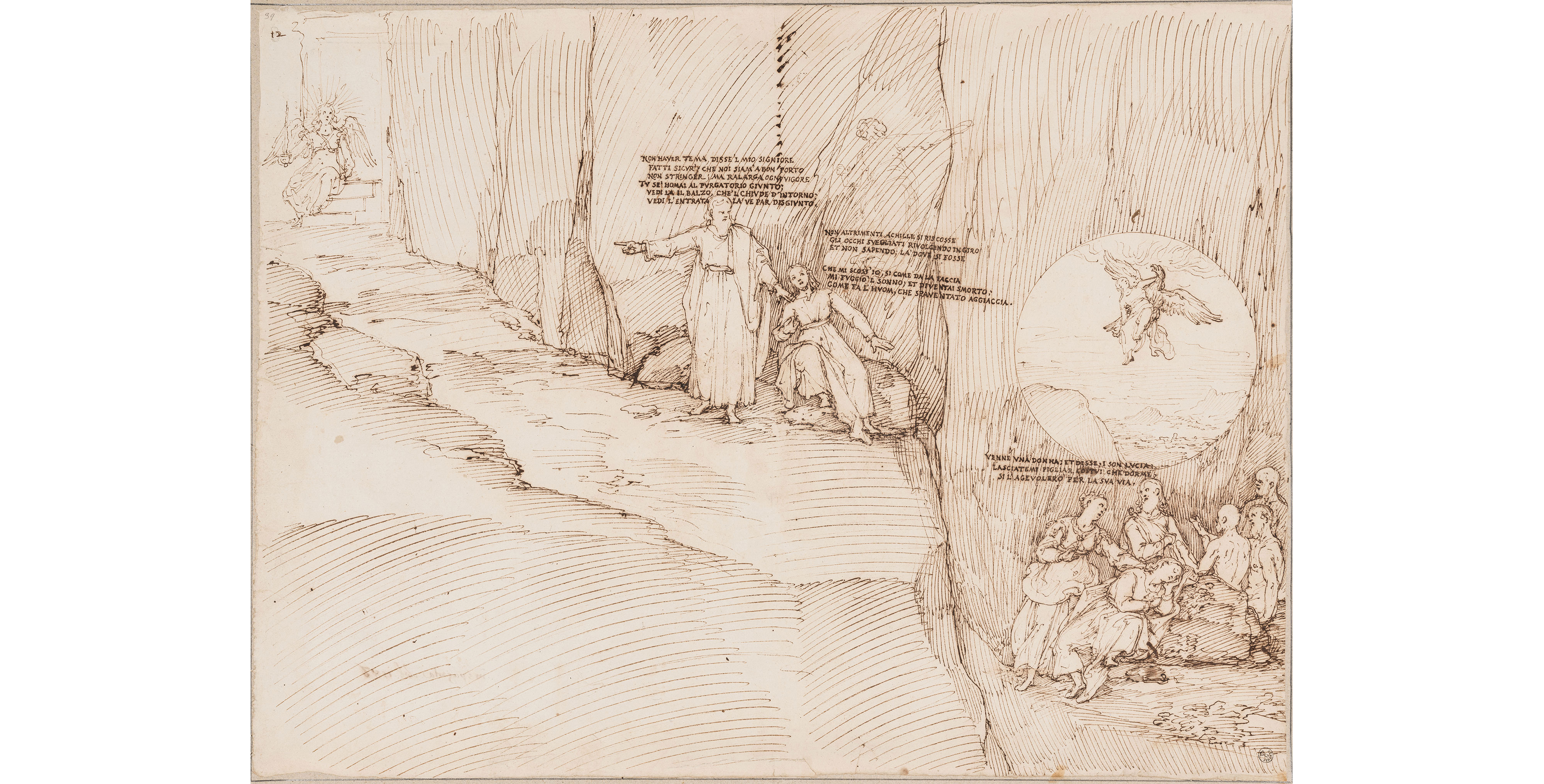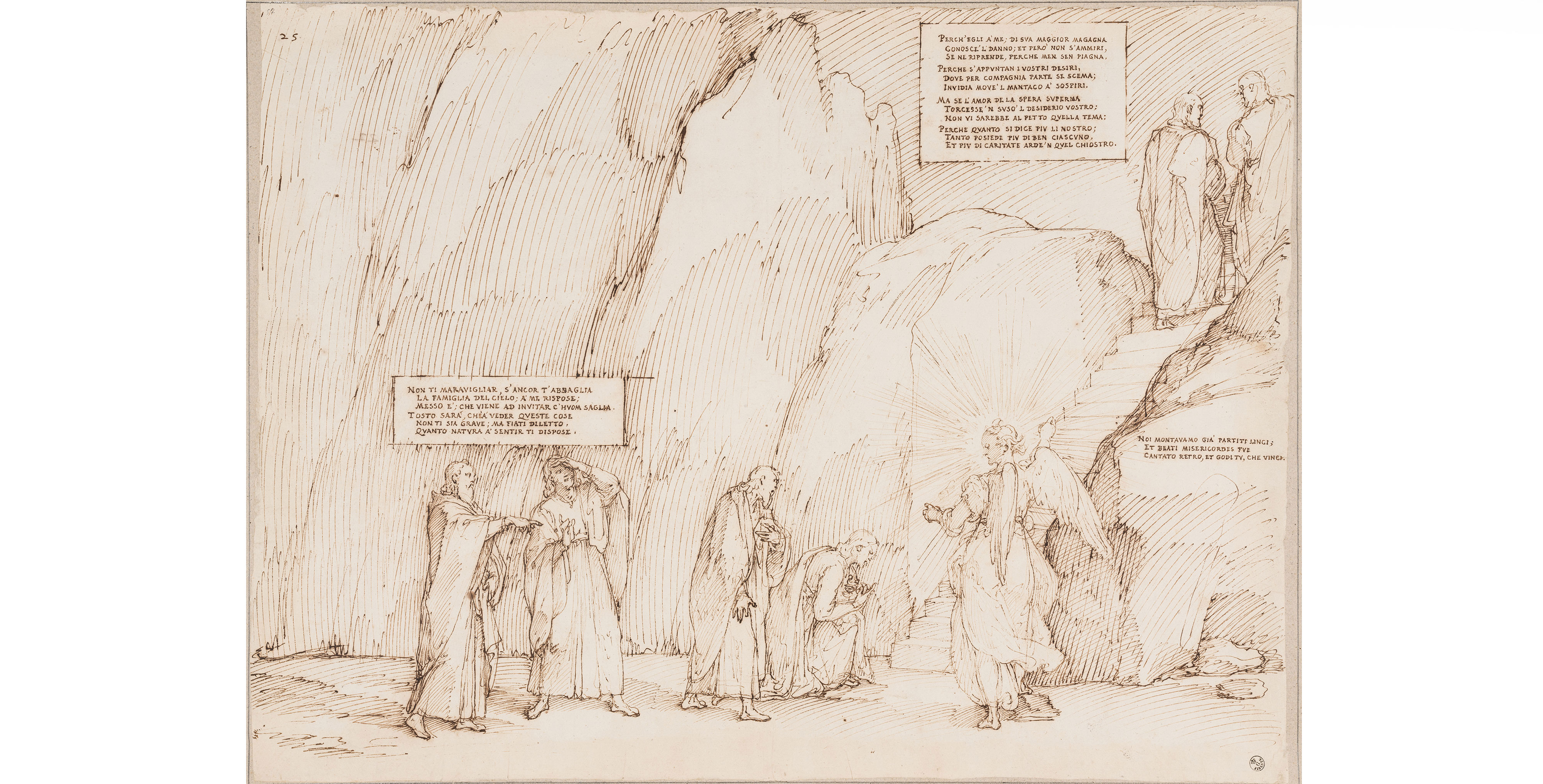 Il Purgatorio è senz’altro la cantica della Commedia su cui Federico Zuccari ha avuto occasione di riflettere più a lungo, come dimostra non solo il considerevole numero di illustrazioni dedicate ai trentaquattro canti corrispondenti, ma anche la quantità di pentimenti e di rifacimenti che hanno interessato in varia misura i disegni.