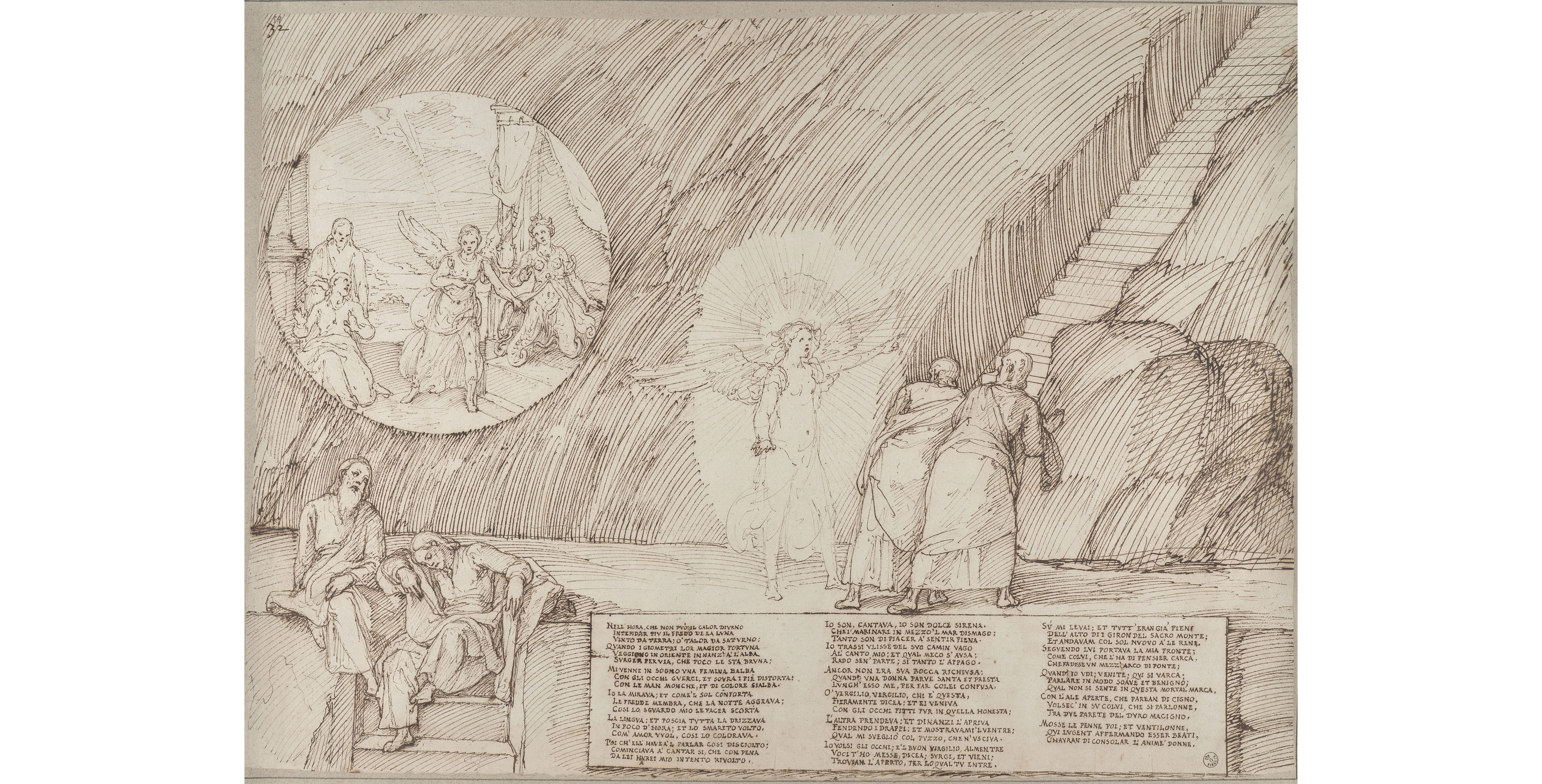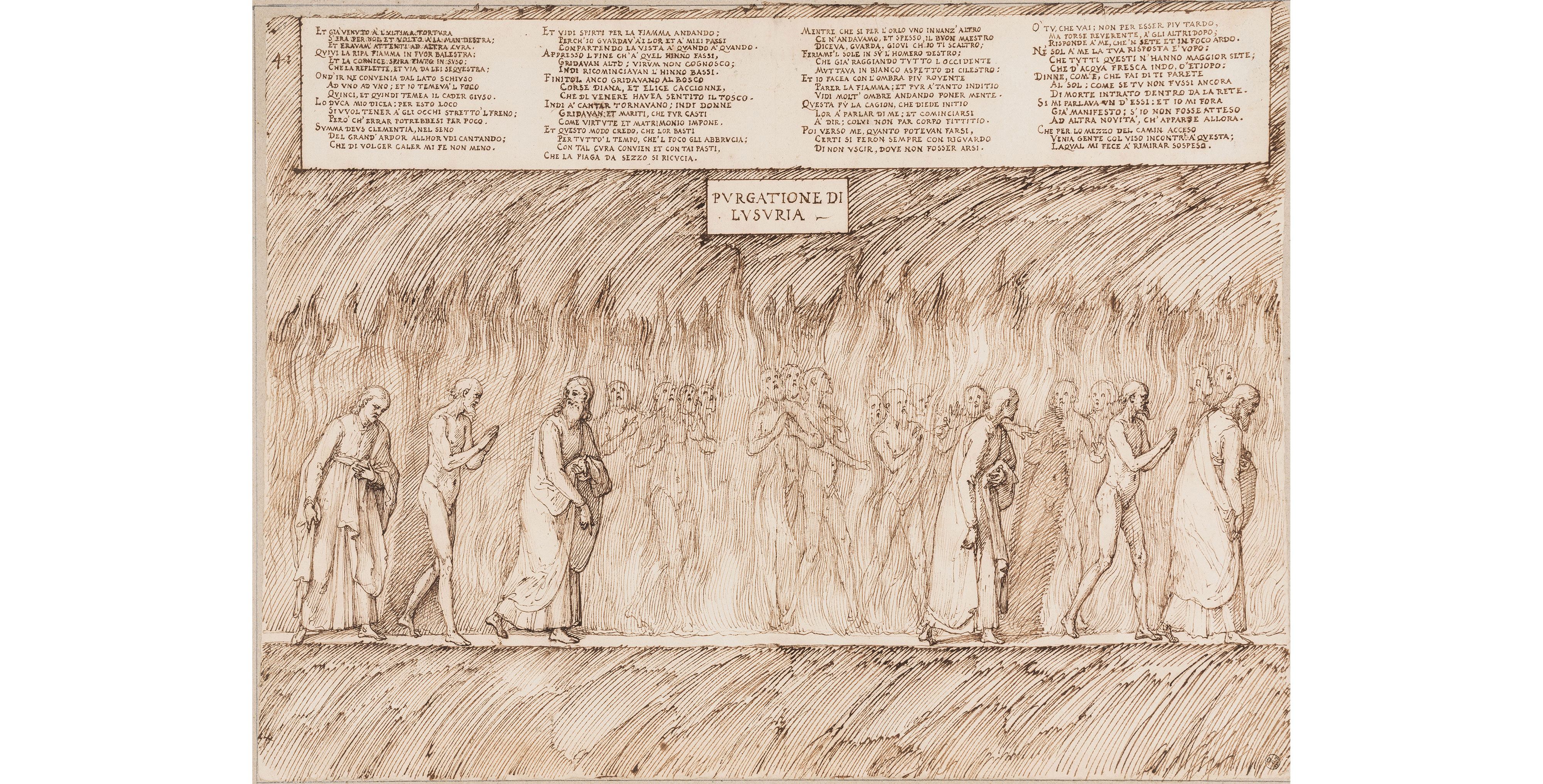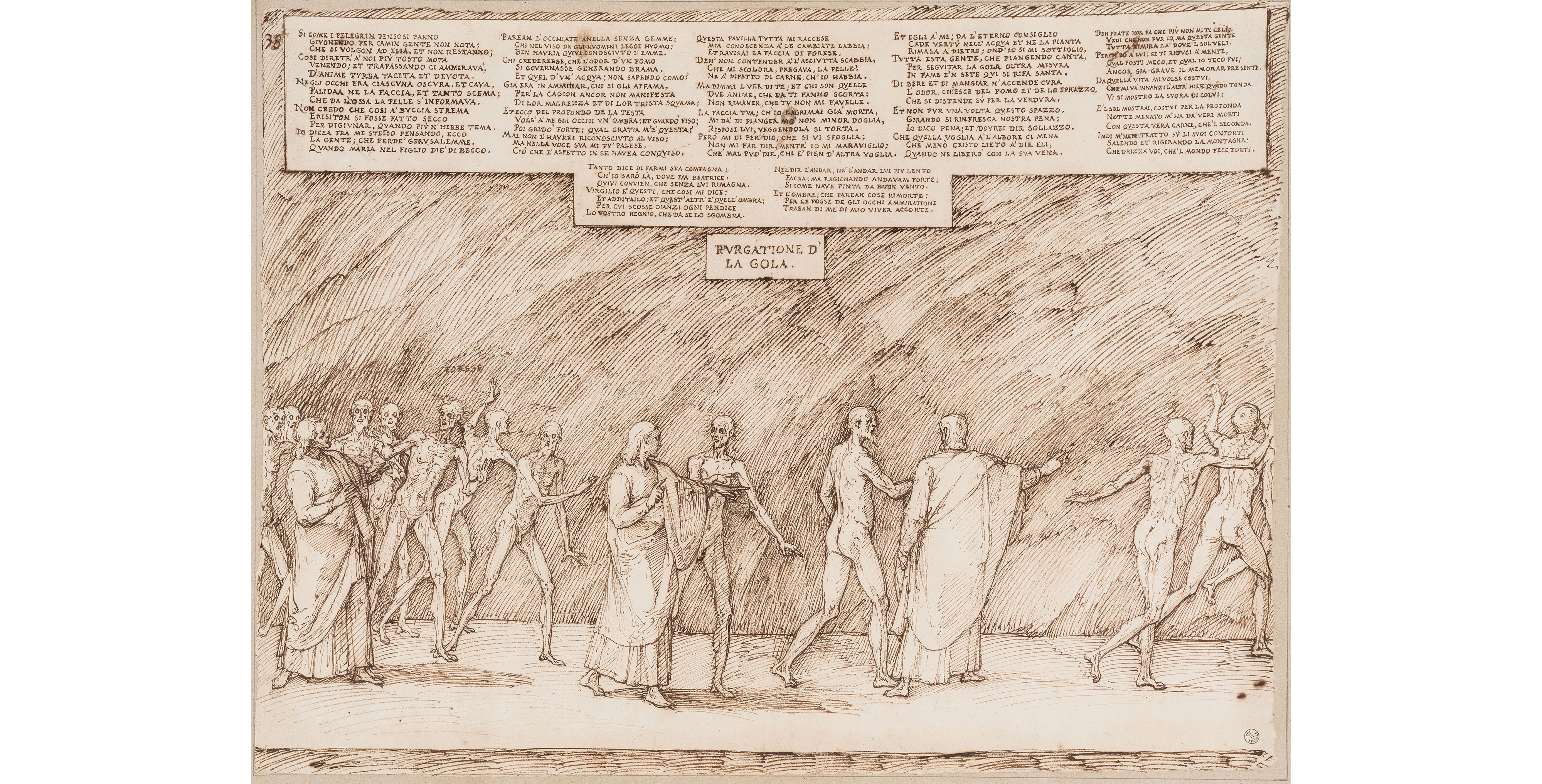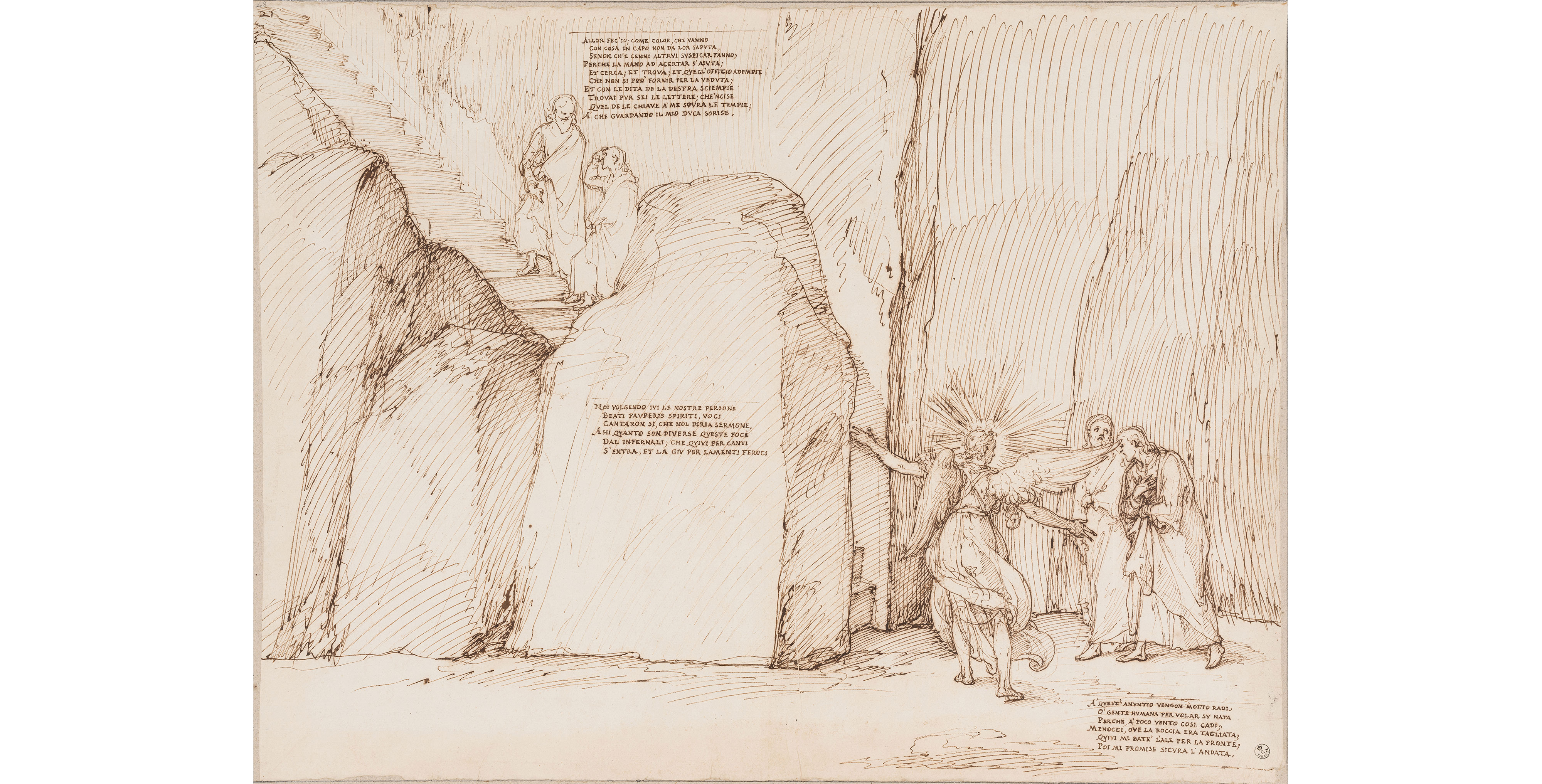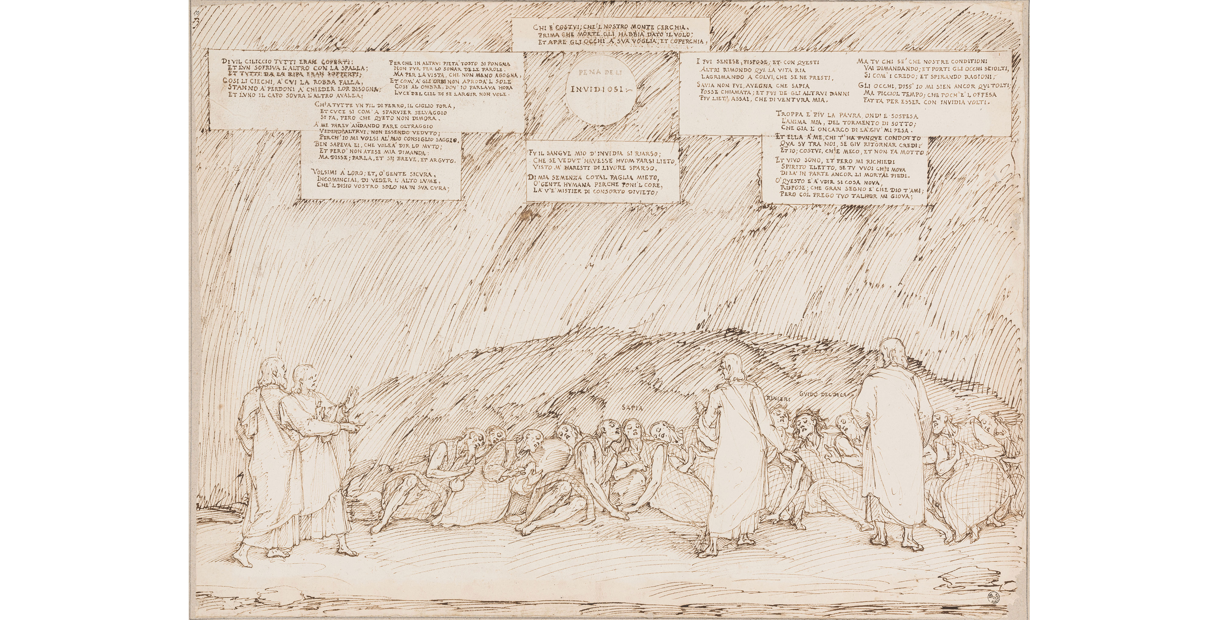 Il Purgatorio è senz’altro la cantica della Commedia su cui Federico Zuccari ha avuto occasione di riflettere più a lungo, come dimostra non solo il considerevole numero di illustrazioni dedicate ai trentaquattro canti corrispondenti, ma anche la quantità di pentimenti e di rifacimenti che hanno interessato in varia misura i disegni.