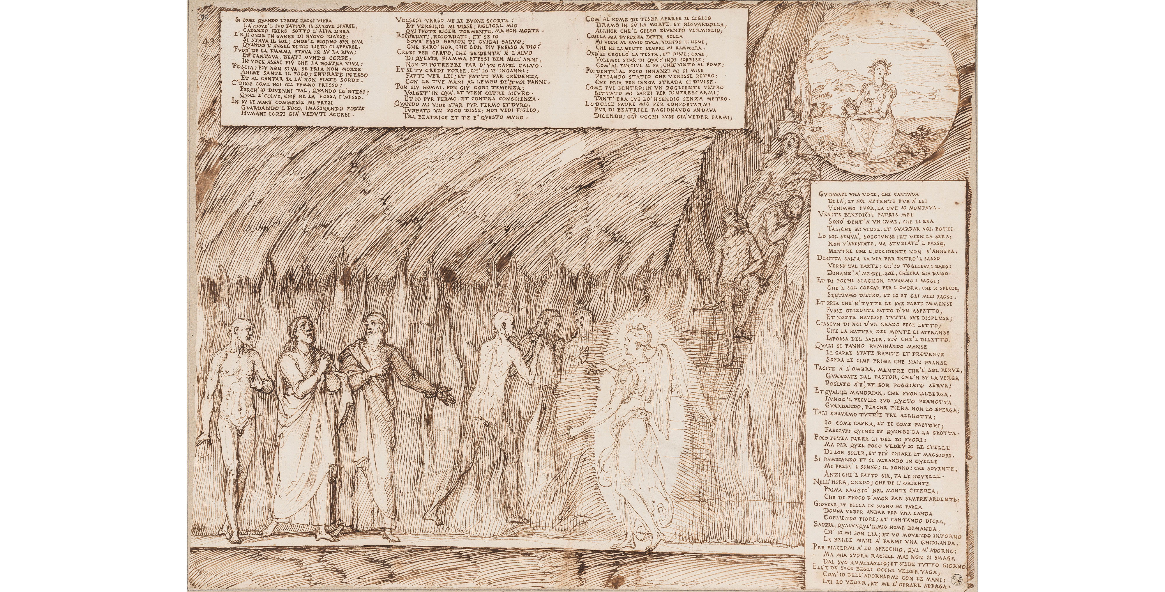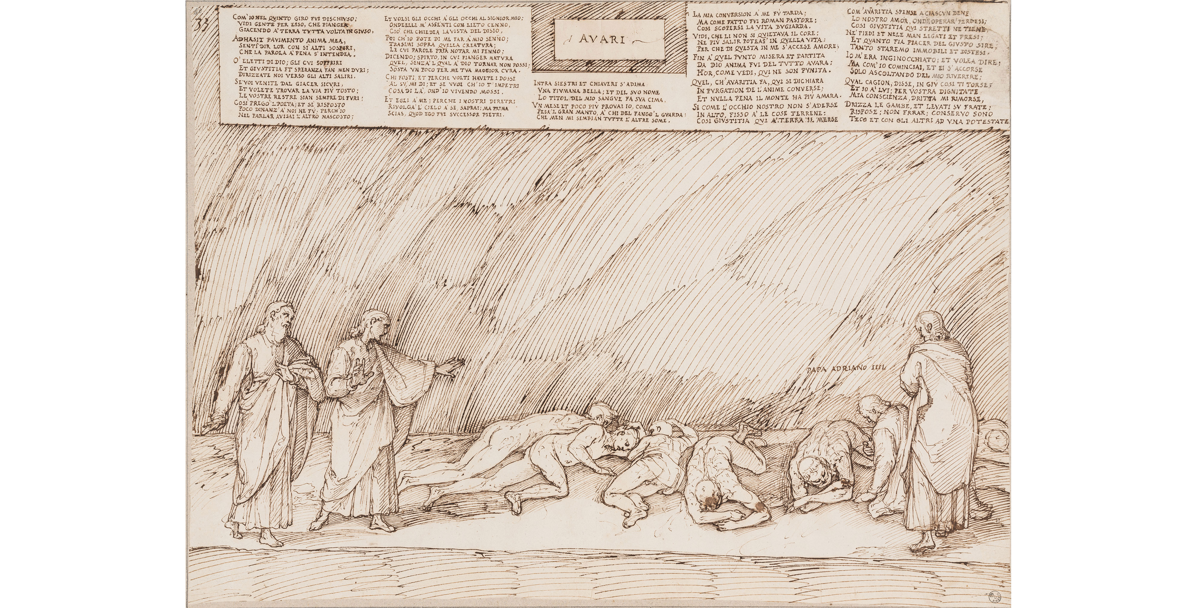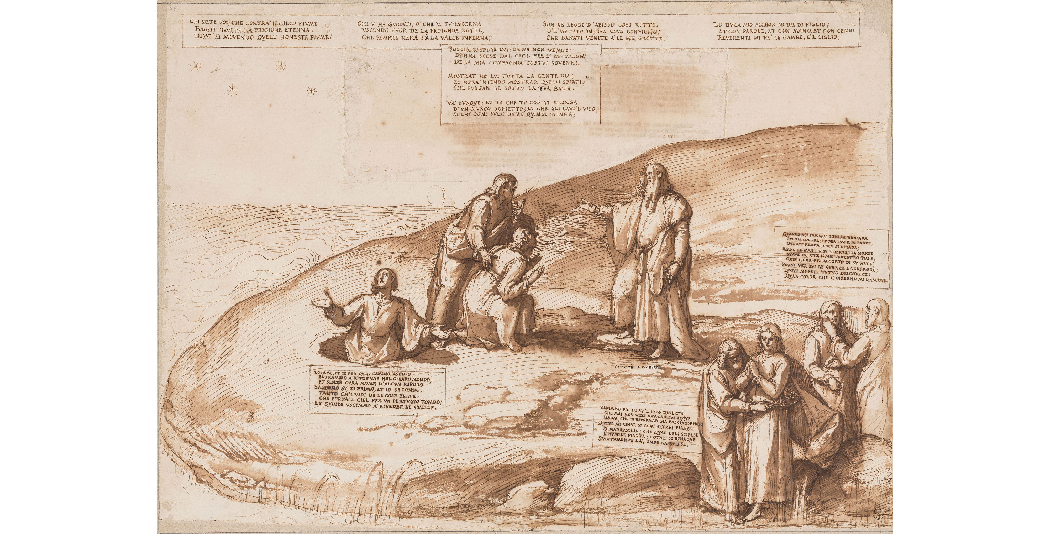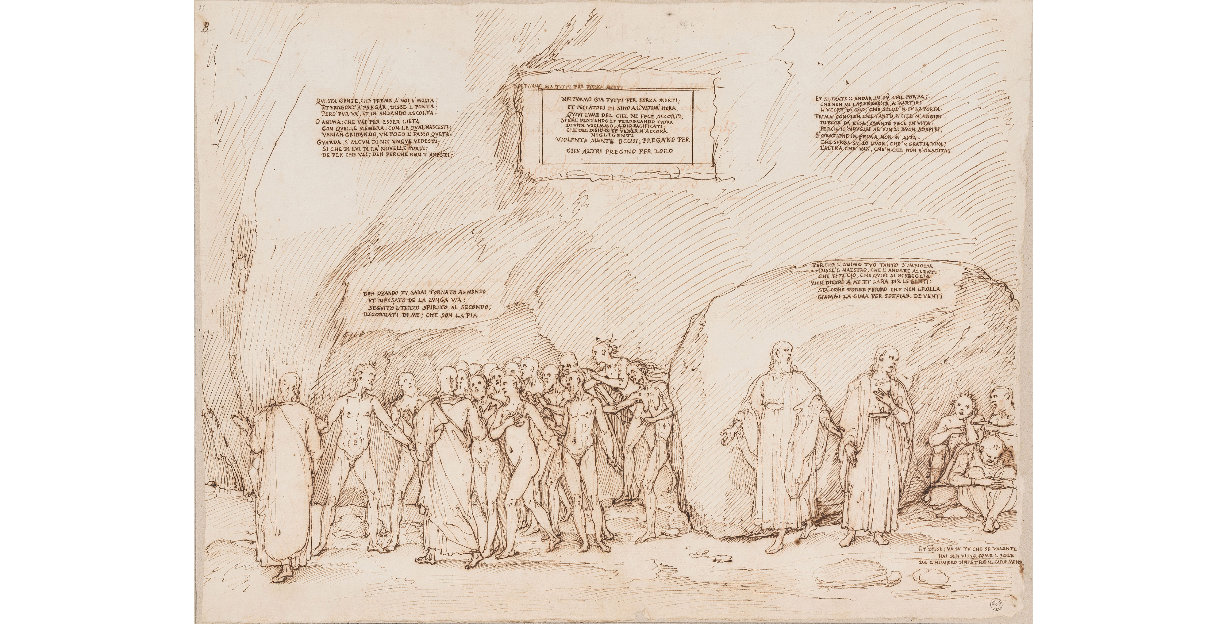 Il Purgatorio è senz’altro la cantica della Commedia su cui Federico Zuccari ha avuto occasione di riflettere più a lungo, come dimostra non solo il considerevole numero di illustrazioni dedicate ai trentaquattro canti corrispondenti, ma anche la quantità di pentimenti e di rifacimenti che hanno interessato in varia misura i disegni.