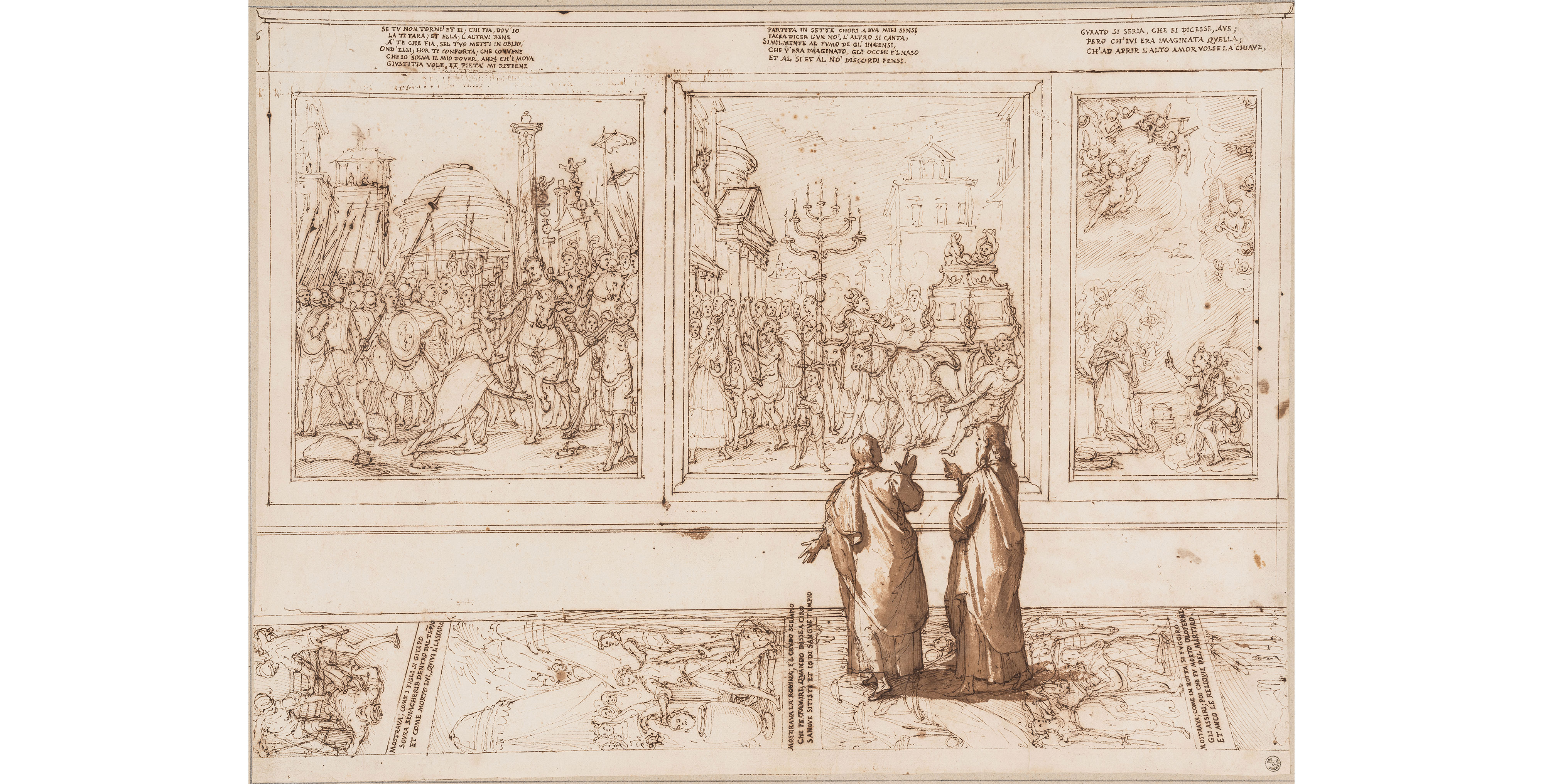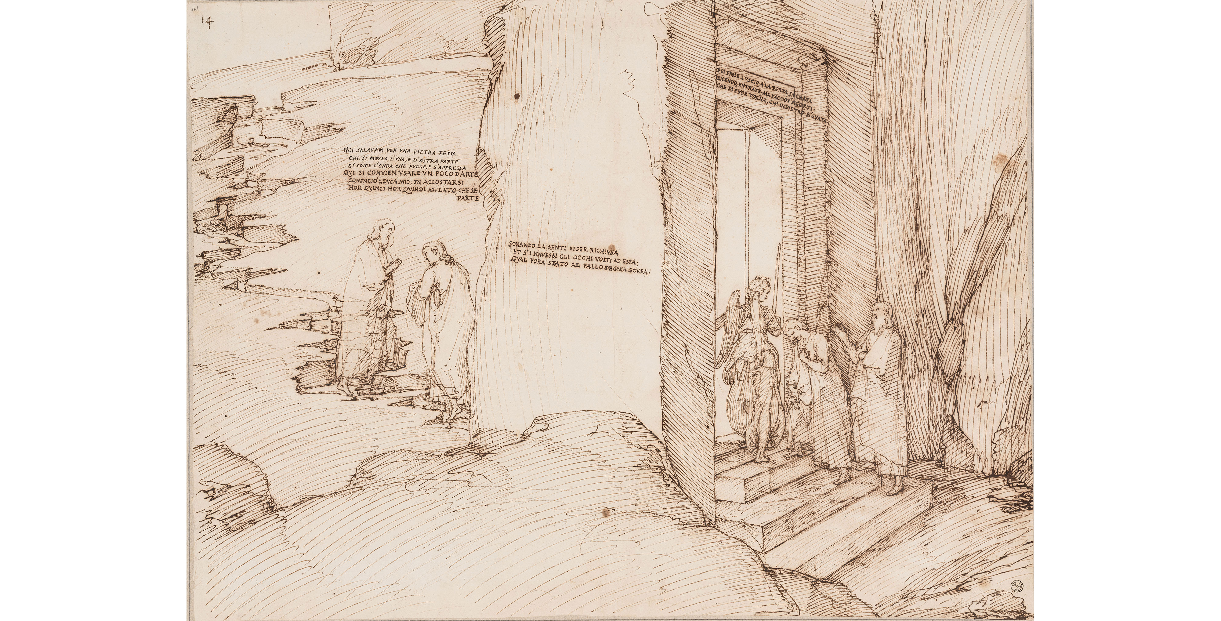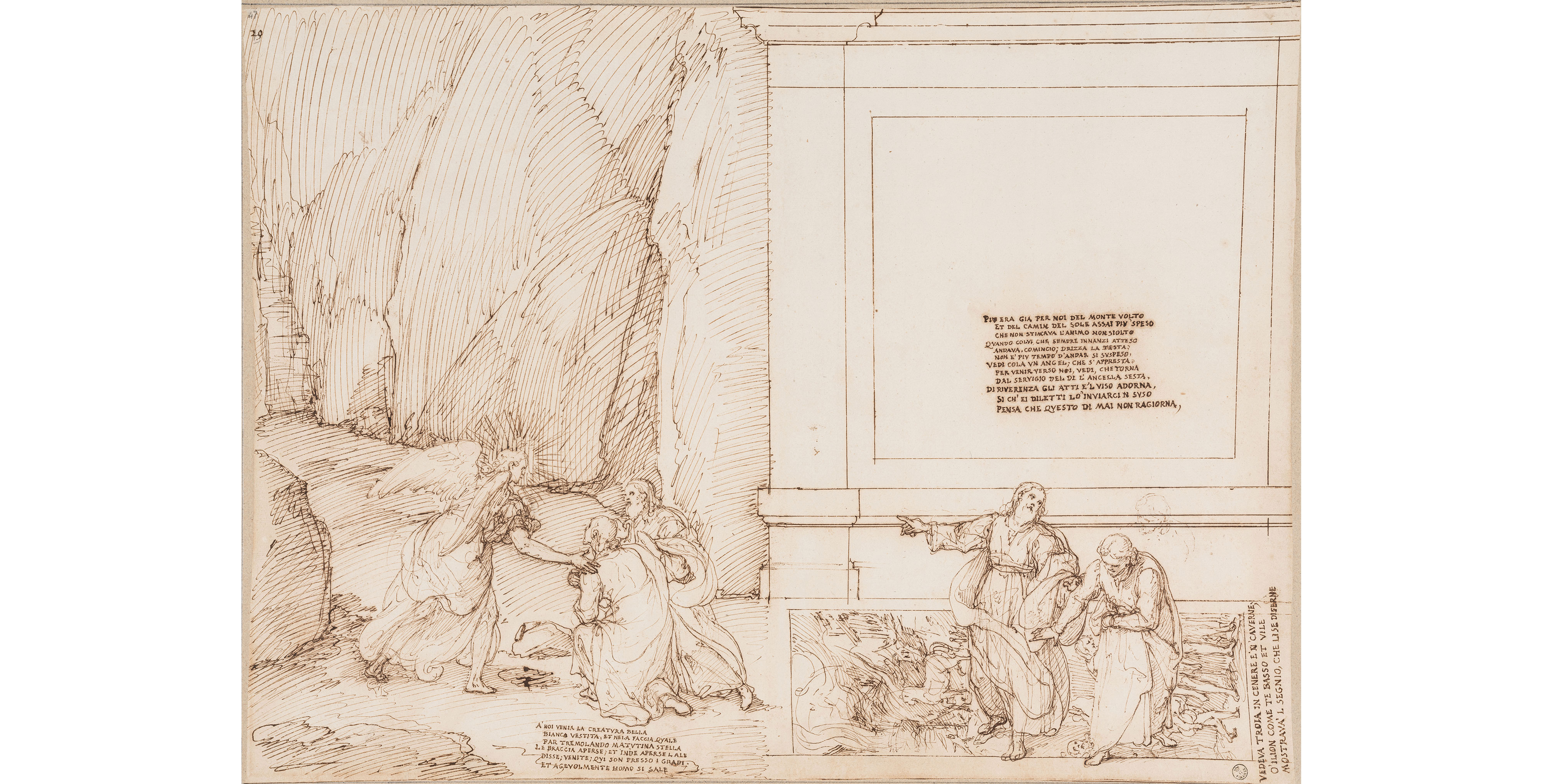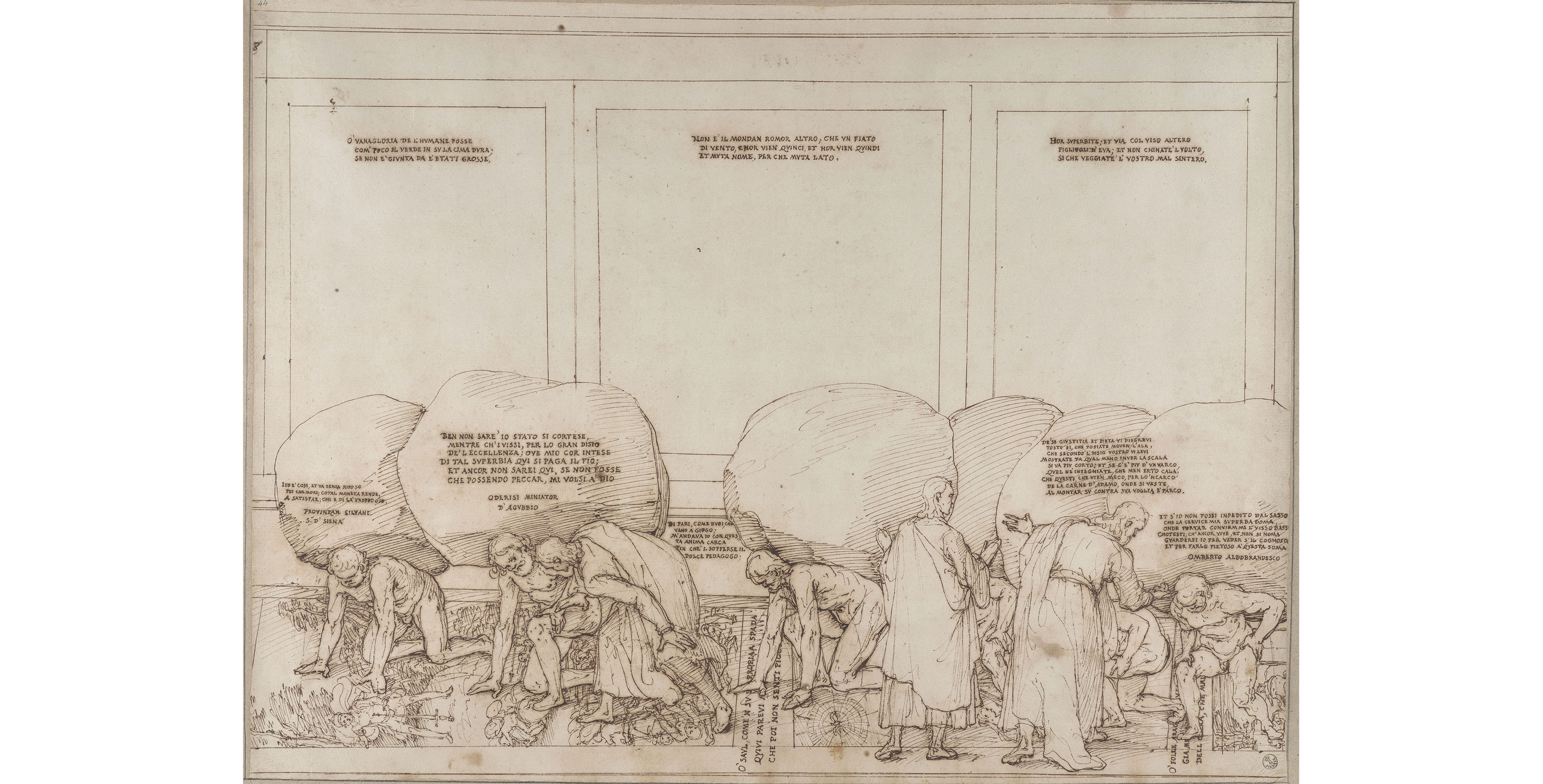 Il dialogo che si svolge tra i personaggi venne inizialmente trascritto da Zuccari nella parte centrale del foglio; poi, per una variazione in corso d’opera, fu occultato con una striscia di carta e ritrascritto nella fascia superiore della tavola al fine di conferire maggiore respiro all’immagine.