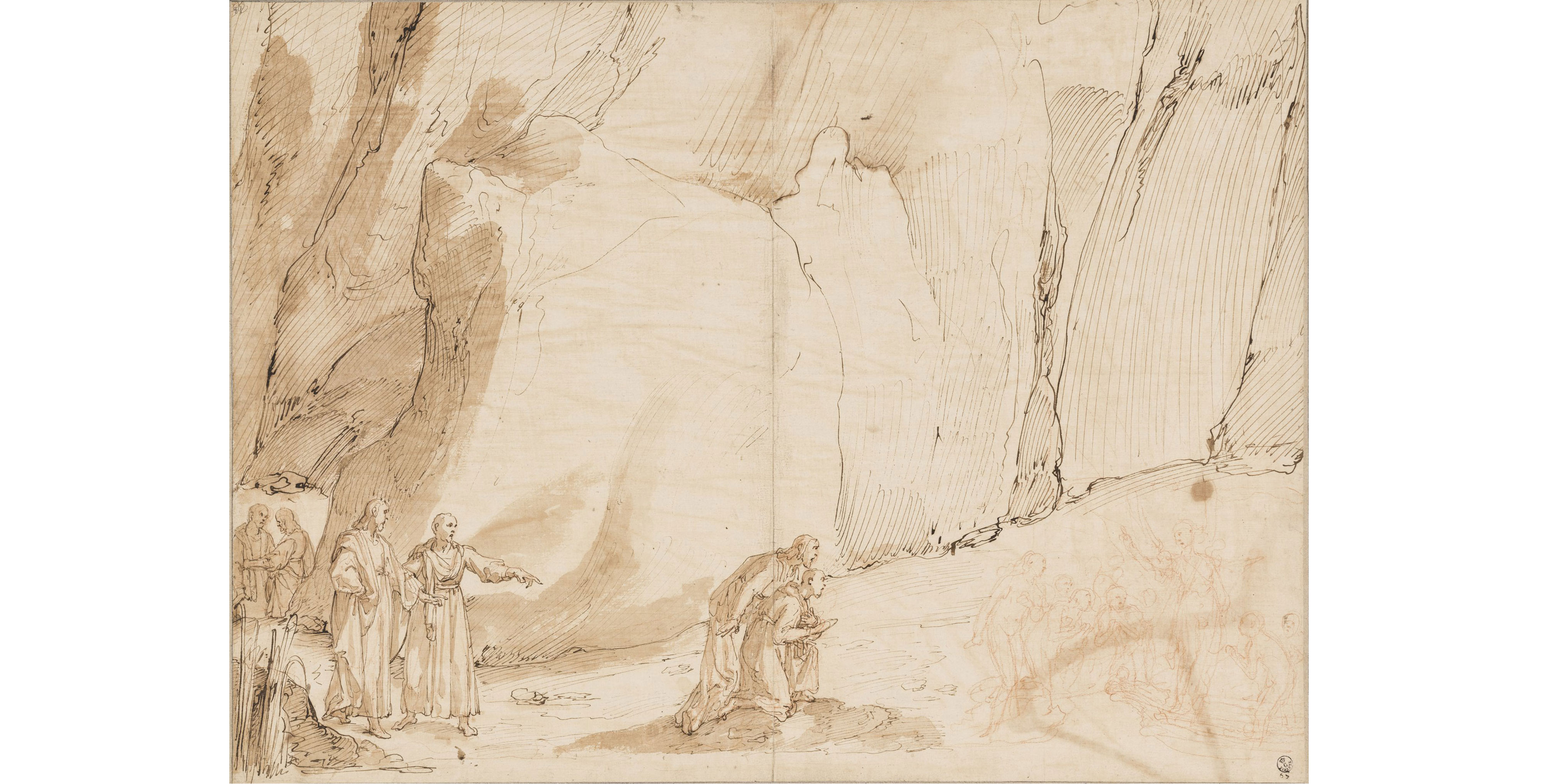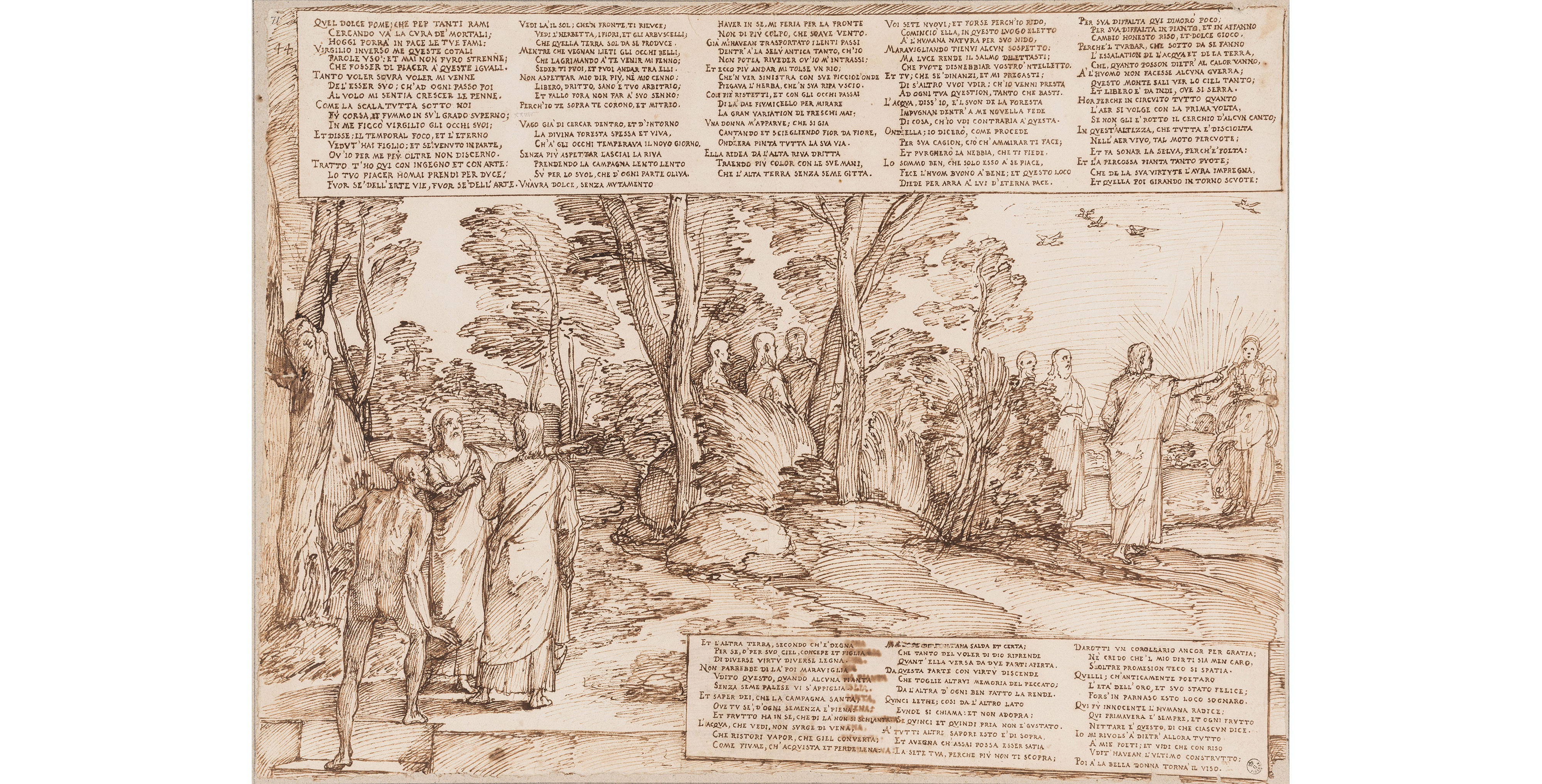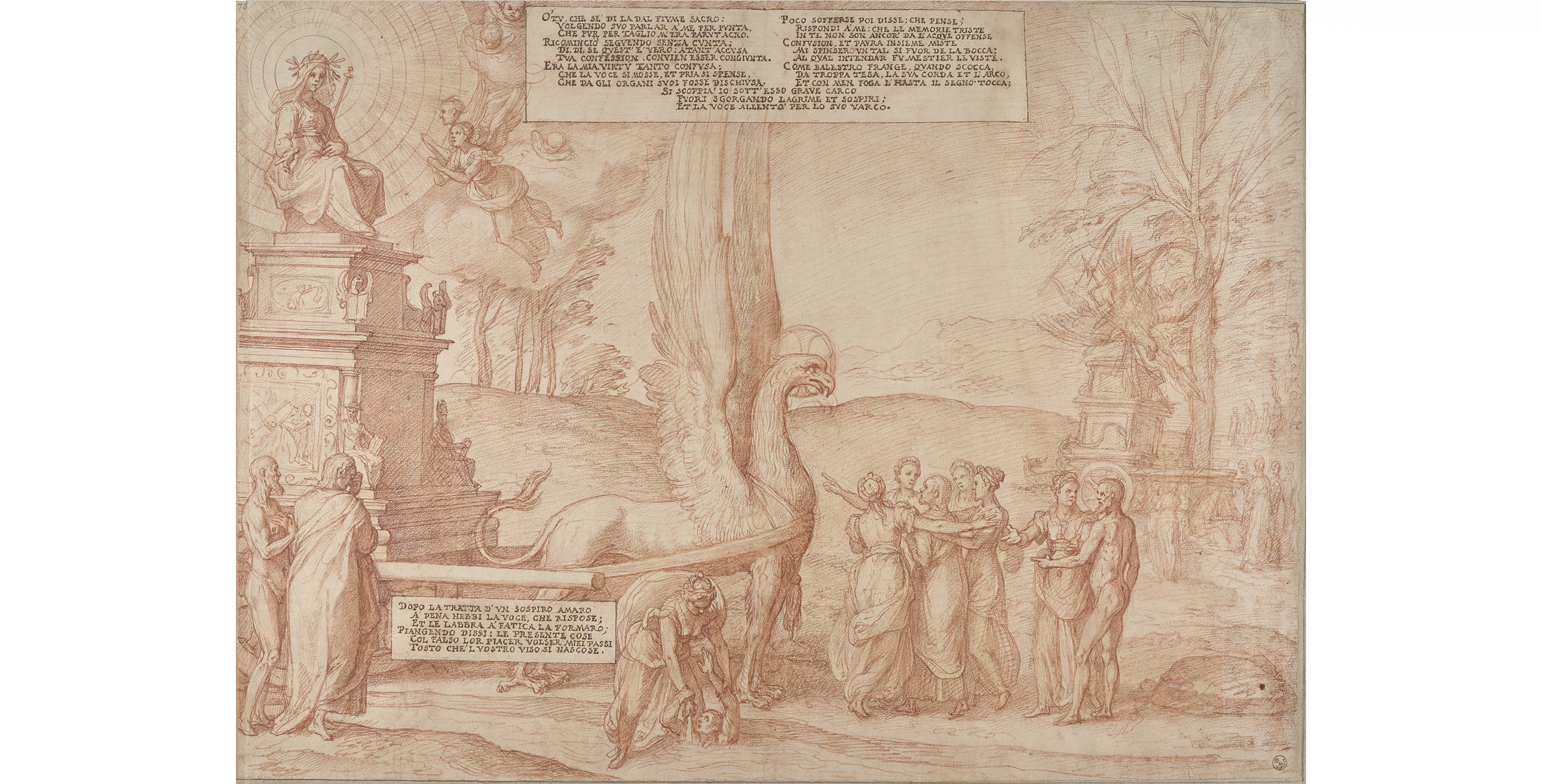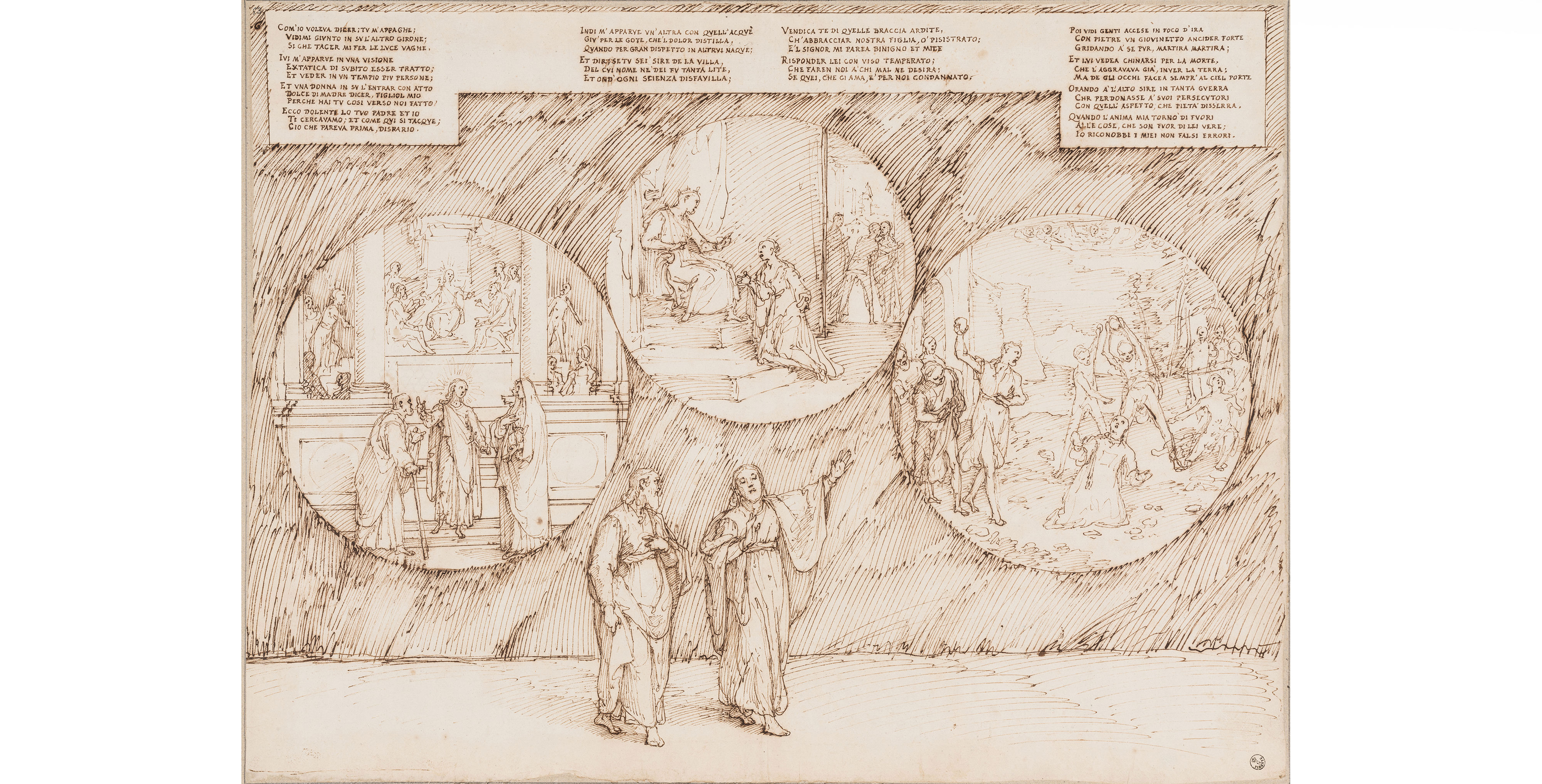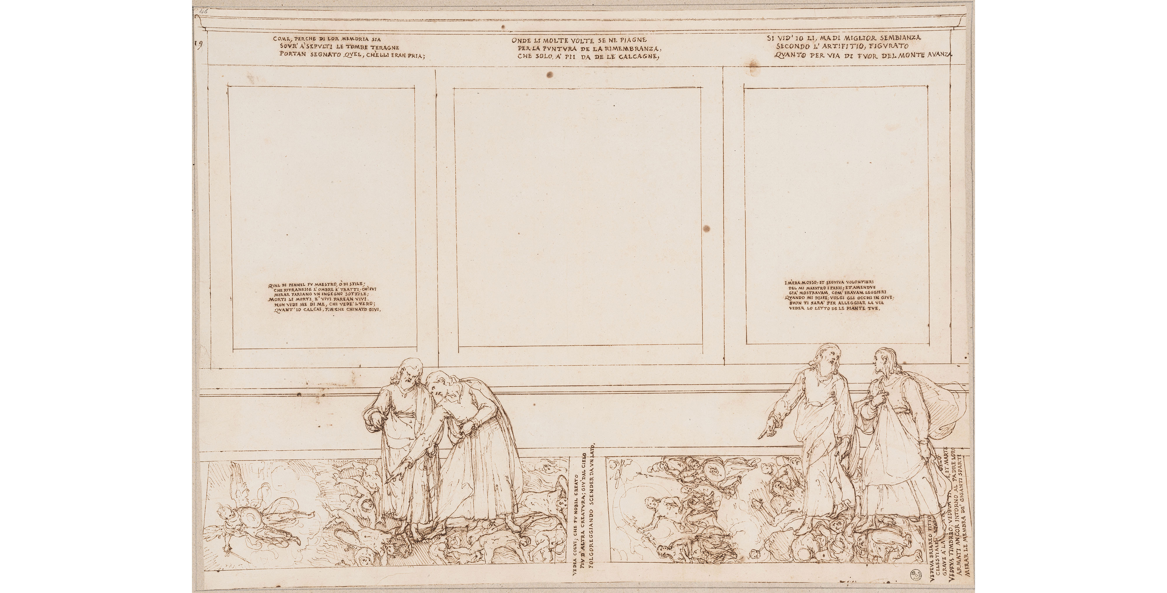 Il dialogo che si svolge tra i personaggi venne inizialmente trascritto da Zuccari nella parte centrale del foglio; poi, per una variazione in corso d’opera, fu occultato con una striscia di carta e ritrascritto nella fascia superiore della tavola al fine di conferire maggiore respiro all’immagine.