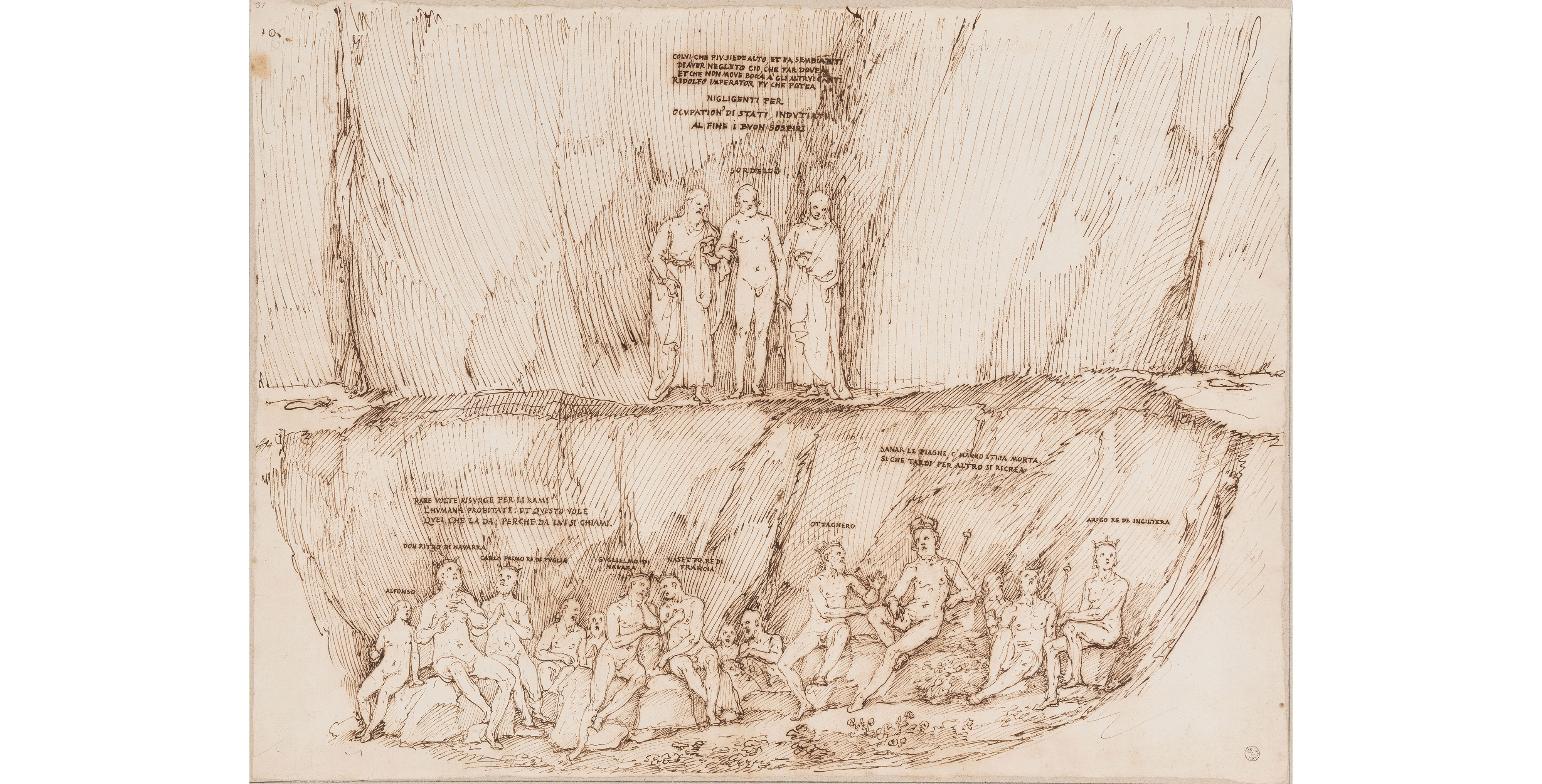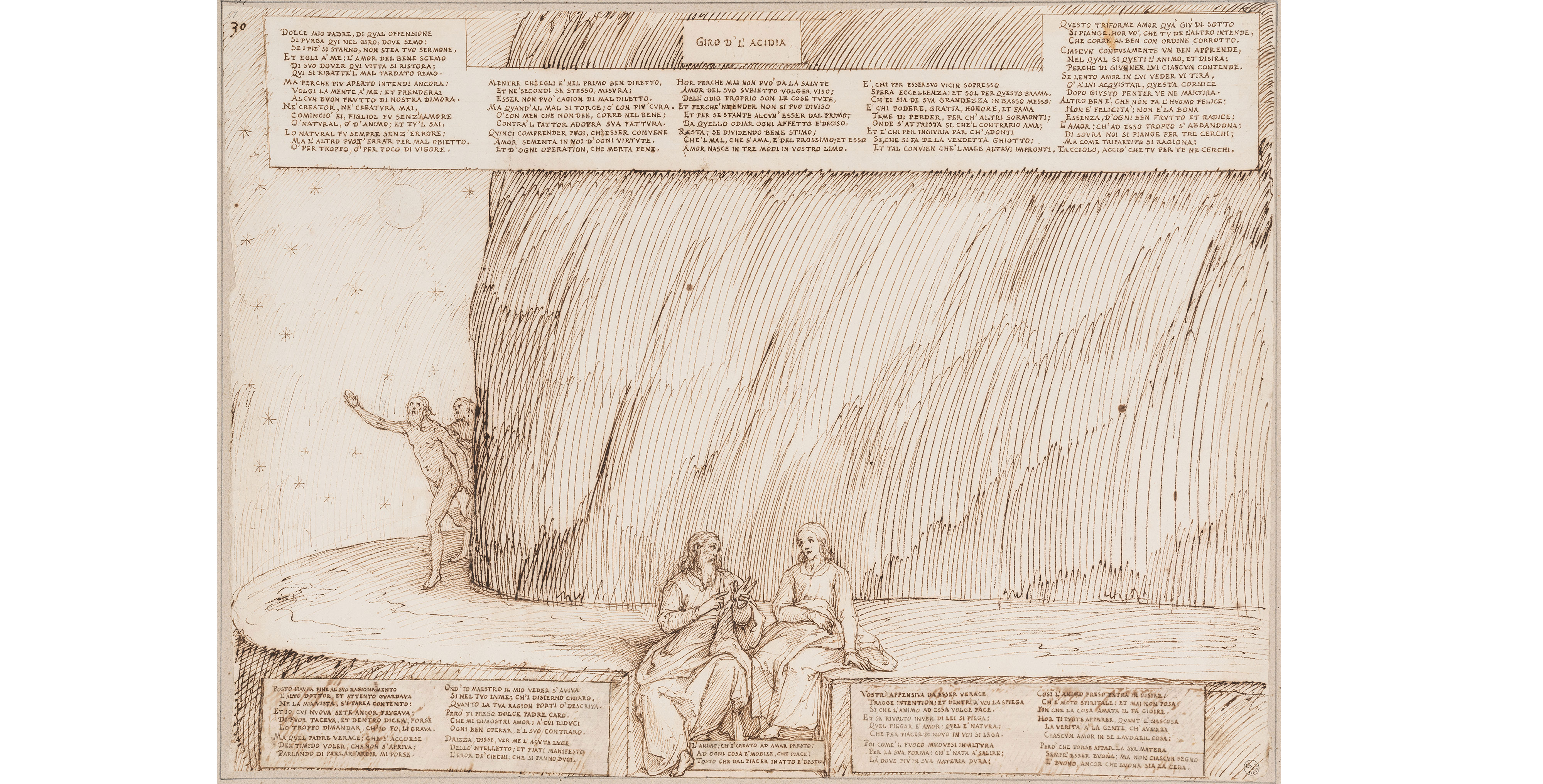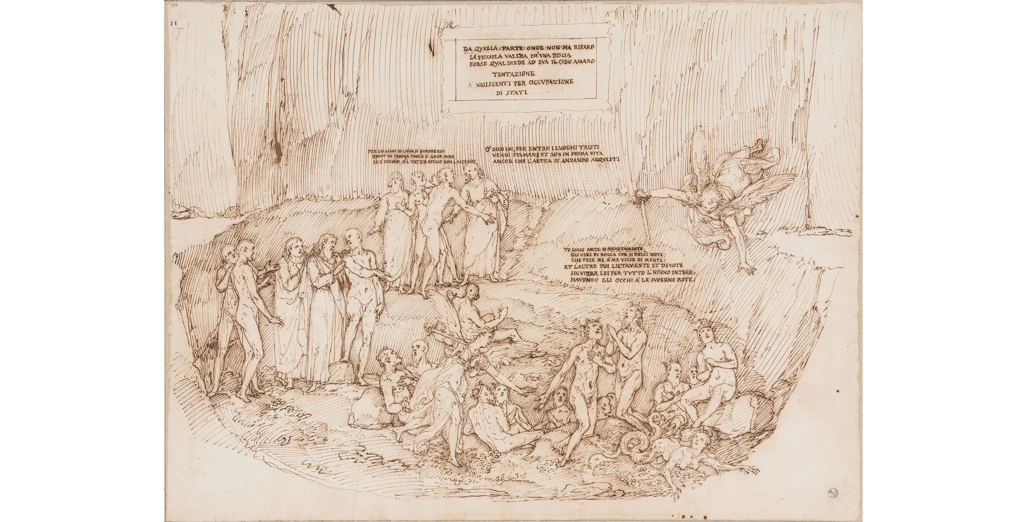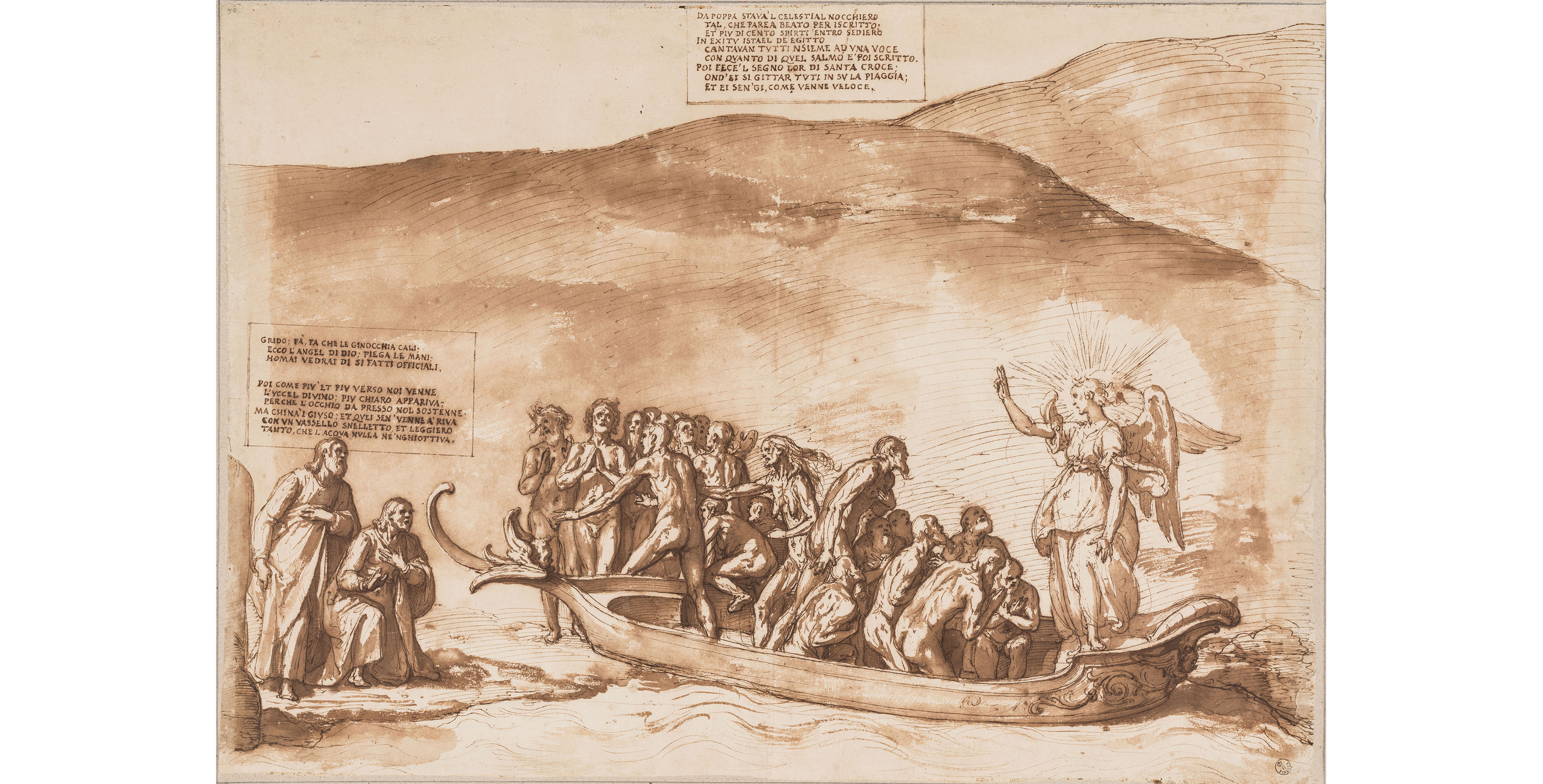 Negli ultimi mesi del 1586, presso il monastero reale di El Escorial in Spagna, Federico Zuccari proseguì pazientemente l’illustrazione del viaggio dantesco nell’oltretomba, che dopo la spaventosa topografia dell’Inferno si apprestava ad affrontare le più tenui atmosfere del Purgatorio.