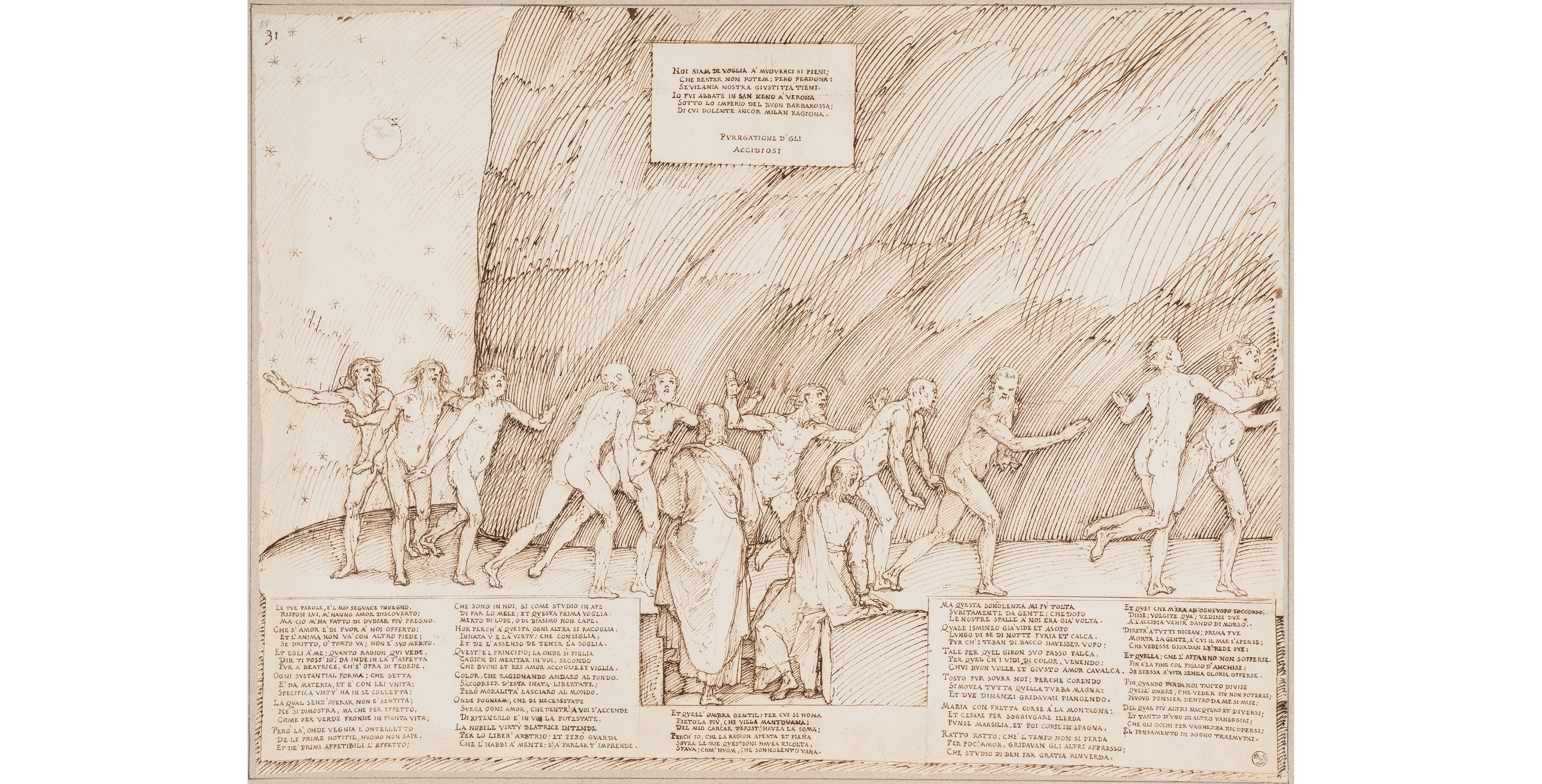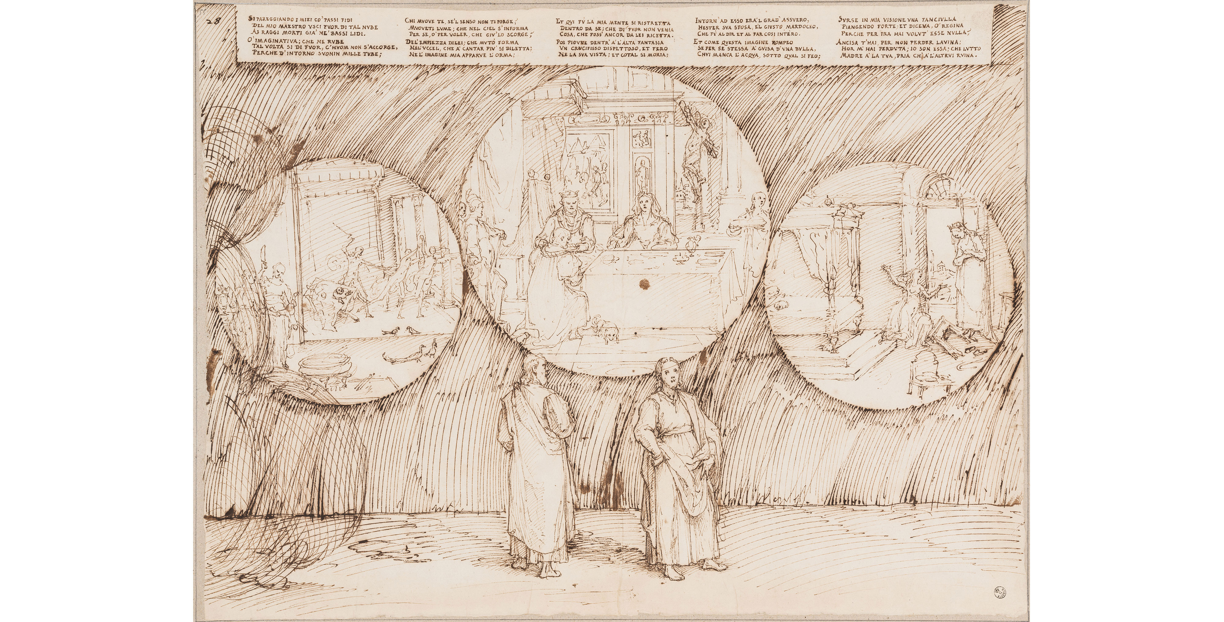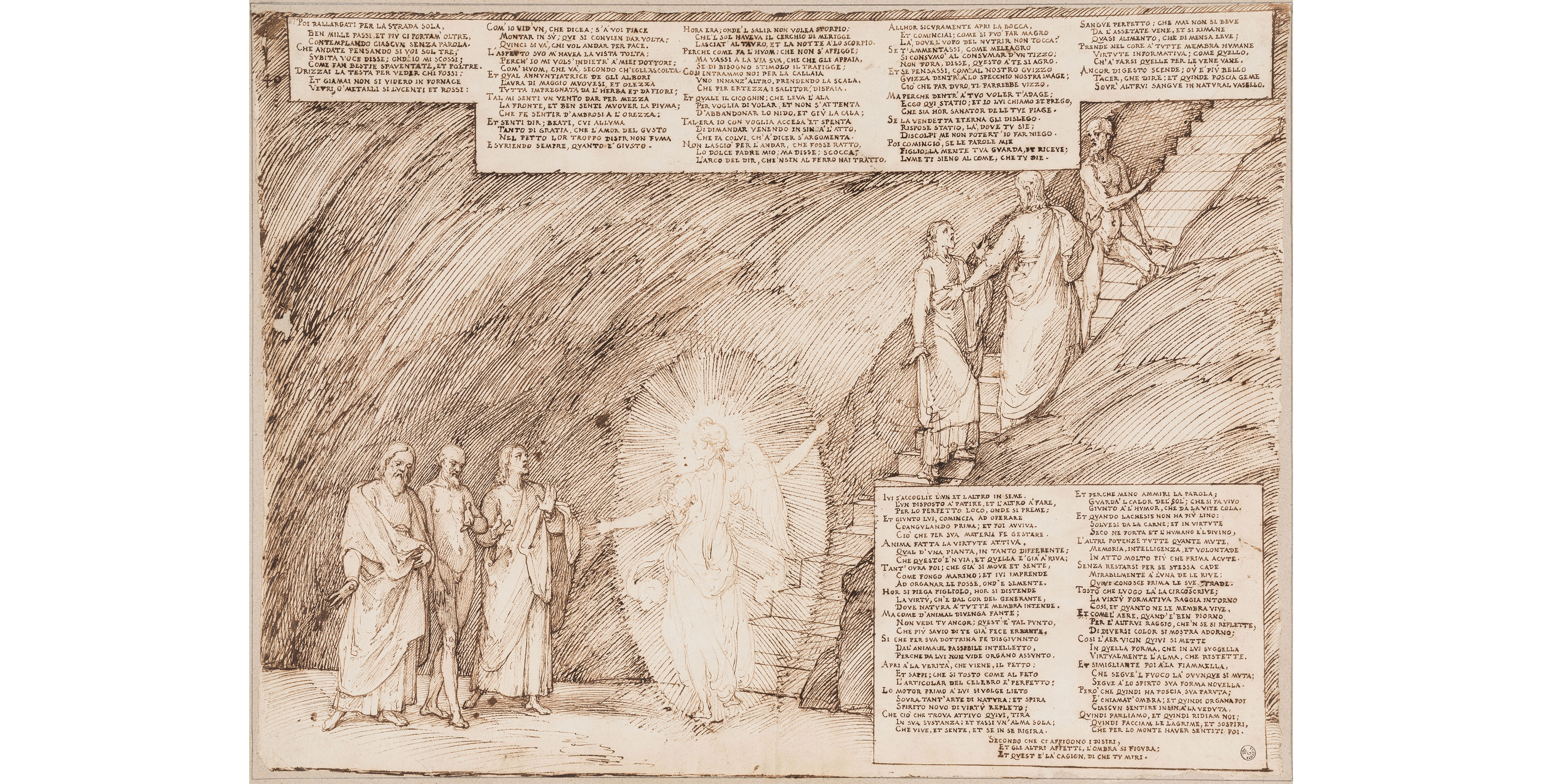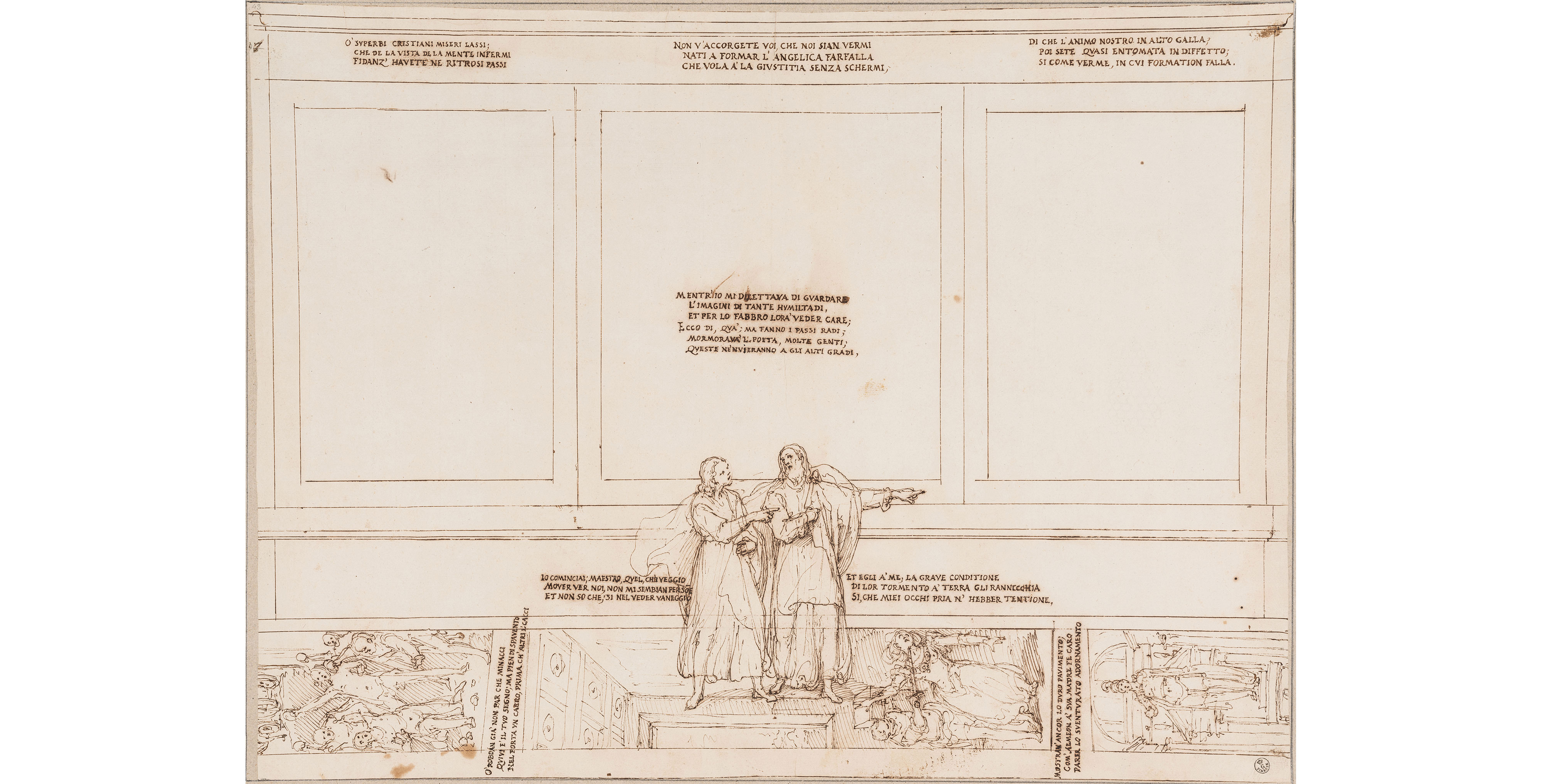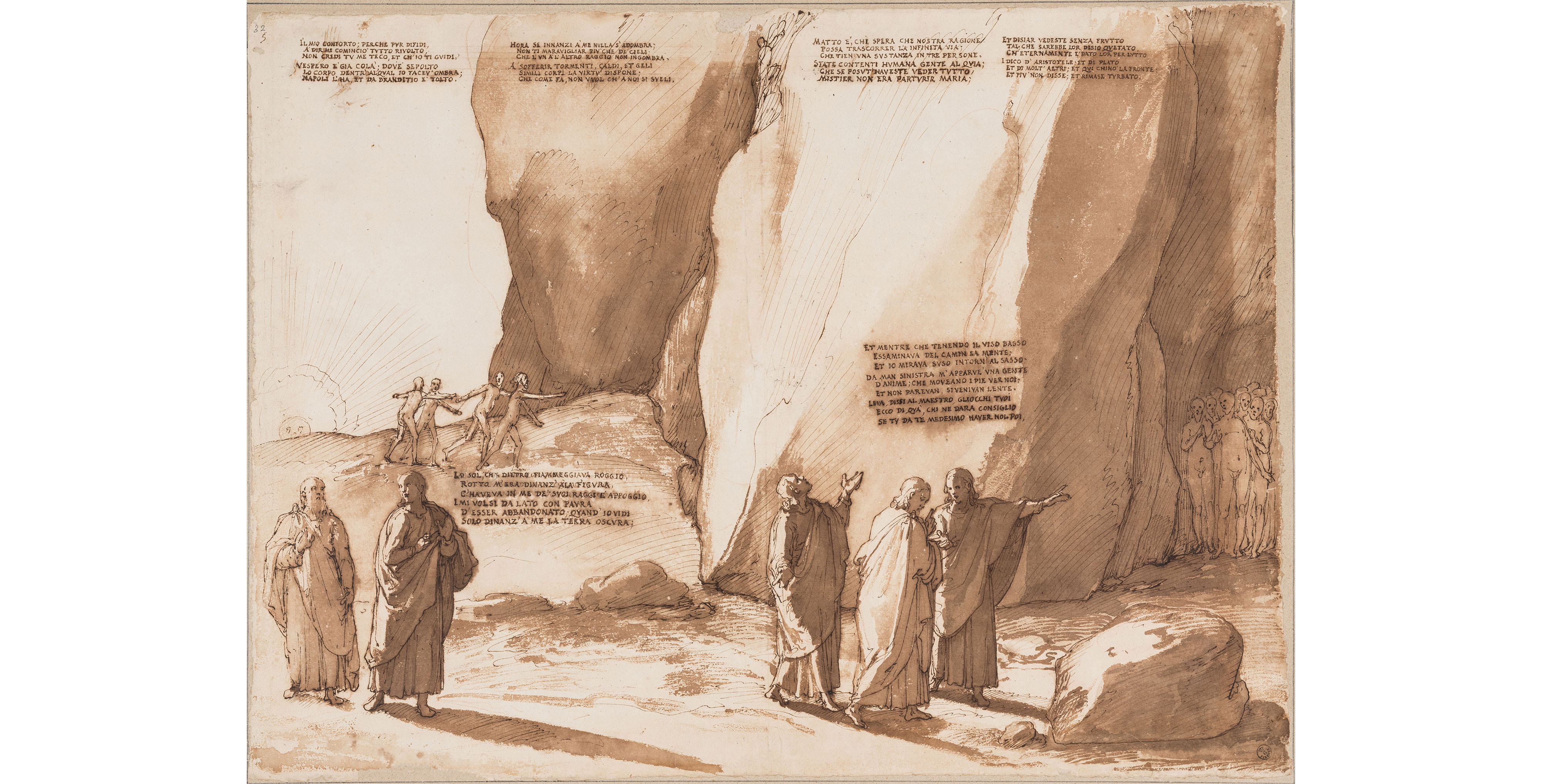 A guidare il lavoro del pittore furono forse alcune considerazioni che egli stava maturando circa il modo di allestire una scena facendo ricorso a fonti luminose diverse: quella solare, quella artificiale in tutte le sue molteplici varianti e infine quella soprannaturale, emanata da Dio. Nella visualizzazione dei canti del Purgatorio, Zuccari optò quindi per l’uso della penna e dell’inchiostro bruno, talvolta leggermente acquerellato: una tecnica grafica, questa, che era tradizionalmente utilizzata in ambito fiorentino per rappresentare i corpi in condizioni di illuminazione ambientale omogenea.