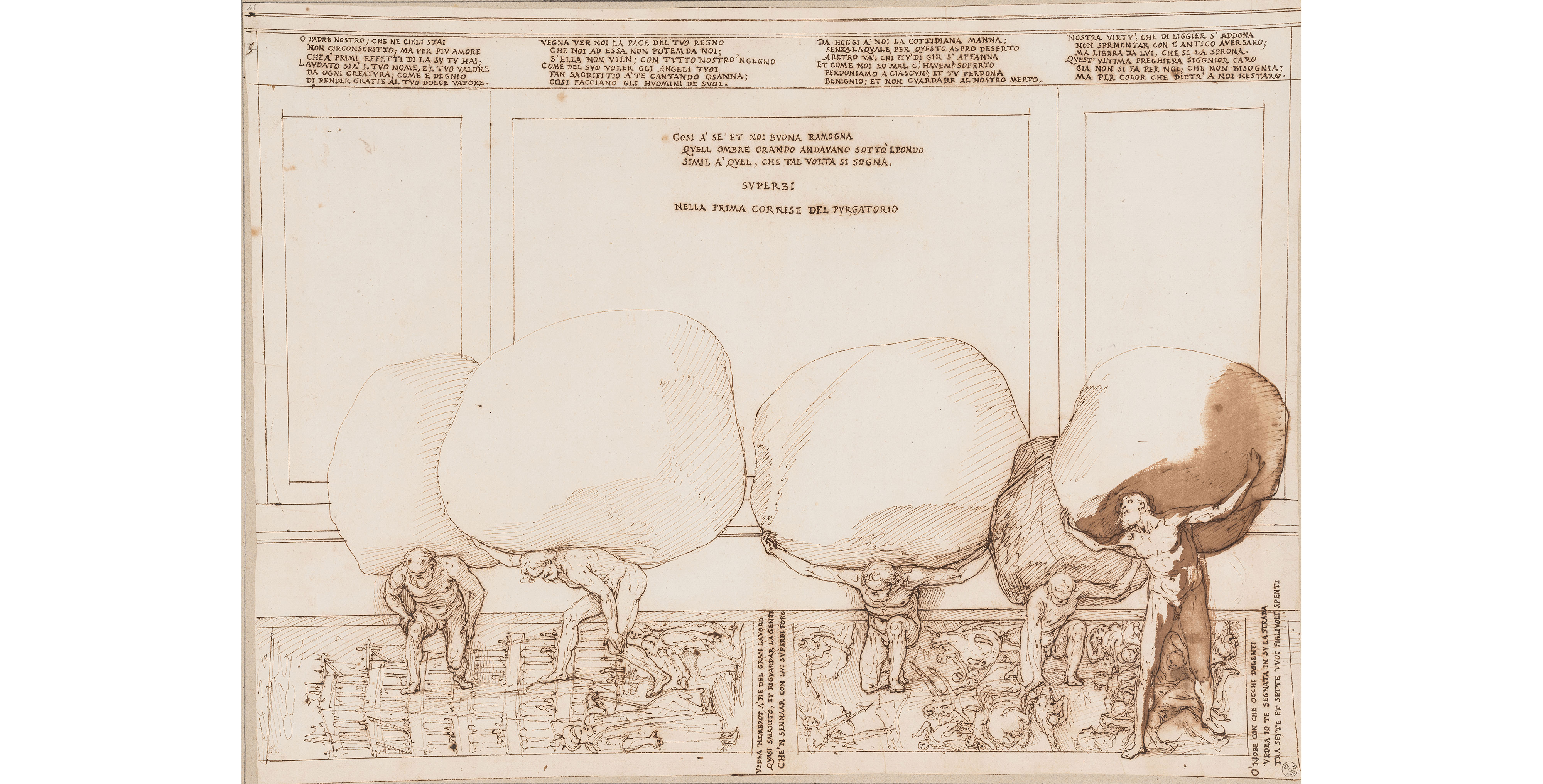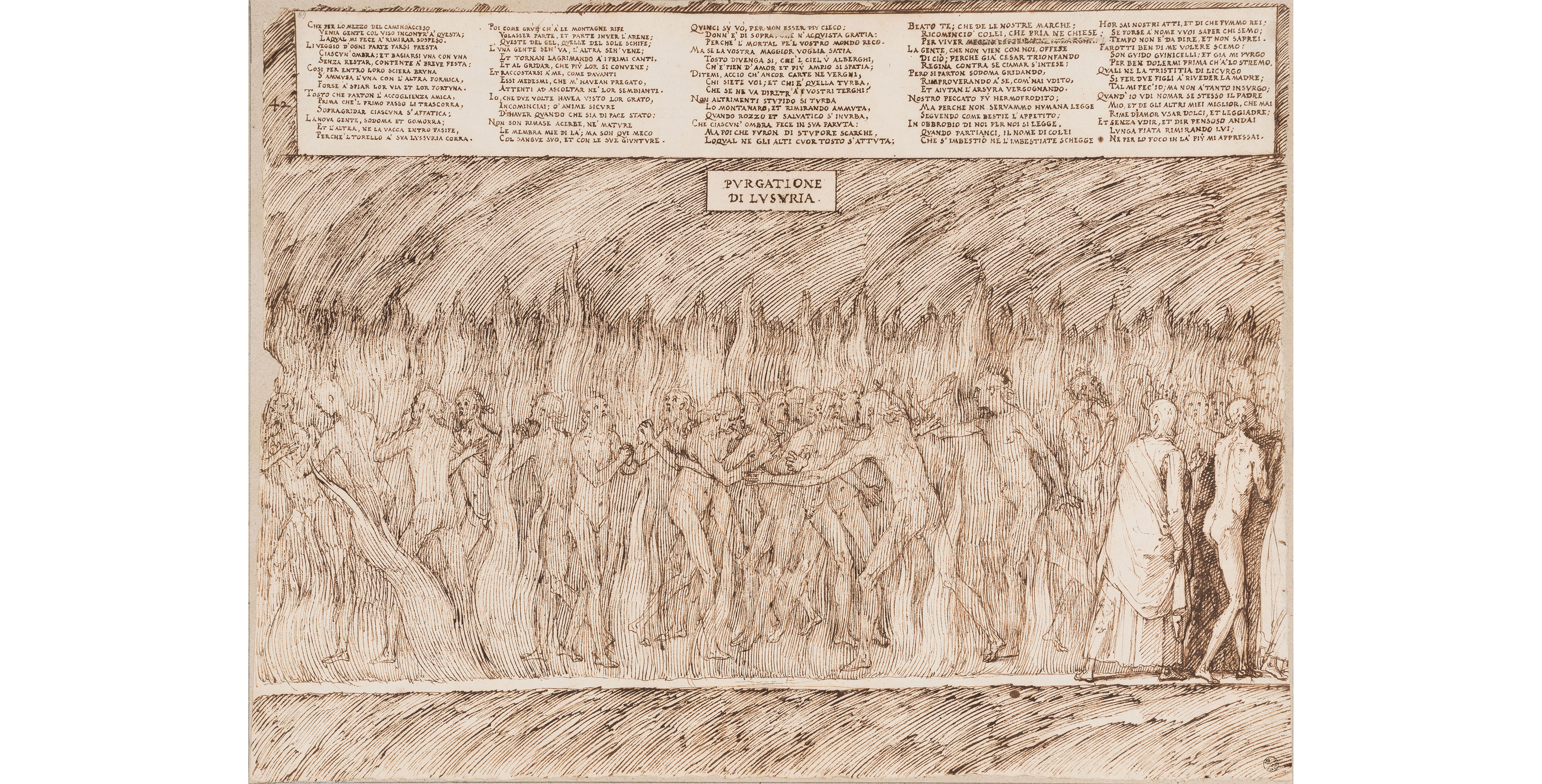Al Purgatorio, come è già stato osservato, è dedicato il maggior numero delle tavole prodotte da Zuccari. Il motivo della predilezione accordata a questa cantica sembra essere duplice: da un lato, sul finire del Cinquecento, prevale, soprattutto a Firenze, l’interpretazione etico-pedagogica della Commedia; non è quindi l’Inferno, dove è illustrato il vizio, a raccogliere i più vasti consensi, come avverrà dal Romanticismo in poi, bensì la seconda cantica, dove si illustra il passaggio dal vizio alla virtù. Non a caso, la maggior parte delle letture dantesche che si tenevano periodicamente nell’Accademia Fiorentina ebbe per soggetto i canti del Purgatorio; alcune di esse devono essere state molto apprezzate dallo stesso Zuccari, che negli anni trascorsi nella capitale medicea ebbe modo di stringere legami con l’ambiente artistico e intellettuale cittadino.