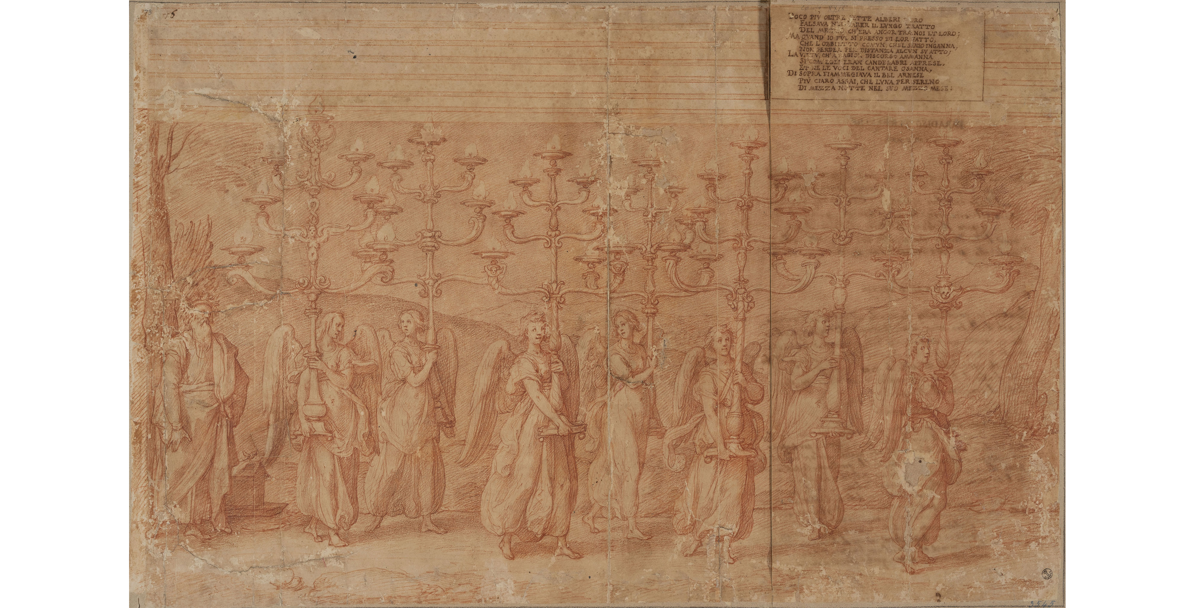 L’intonazione mistica della scena è sottolineata dal mutamento della tecnica grafica, che in questa tavola e in quelle seguenti registra l’utilizzo della pietra rossa al posto della penna e dell’inchiostro bruno.